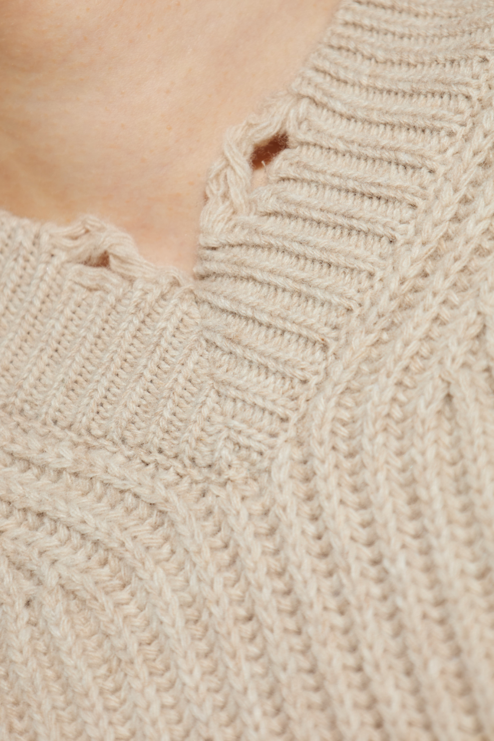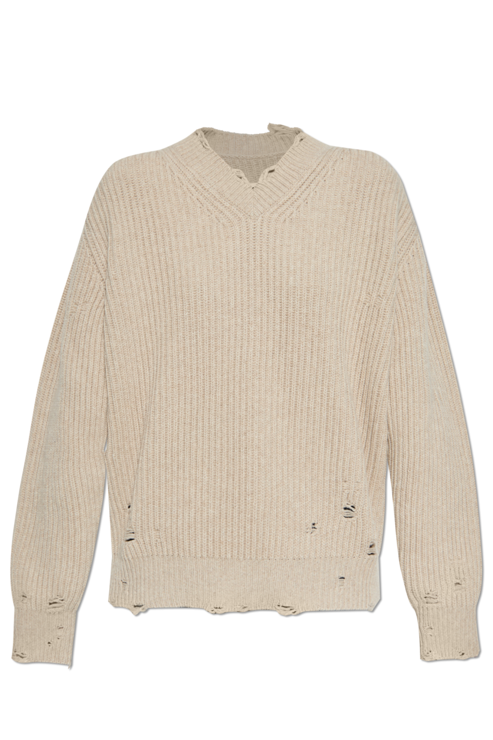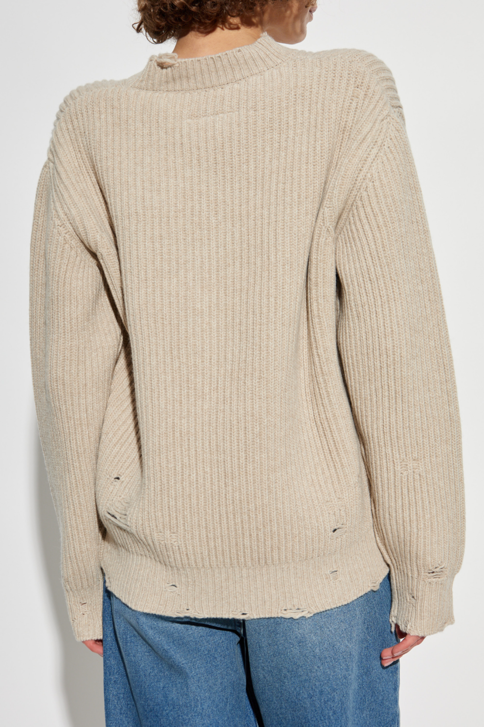 Намеренные потёртости и лёгкие разрывы на горловине, манжетах и подоле — характерная деталь Maison Margiela, превращающая несовершенство в искусство и подчёркивающая индивидуальность каждой вещи.