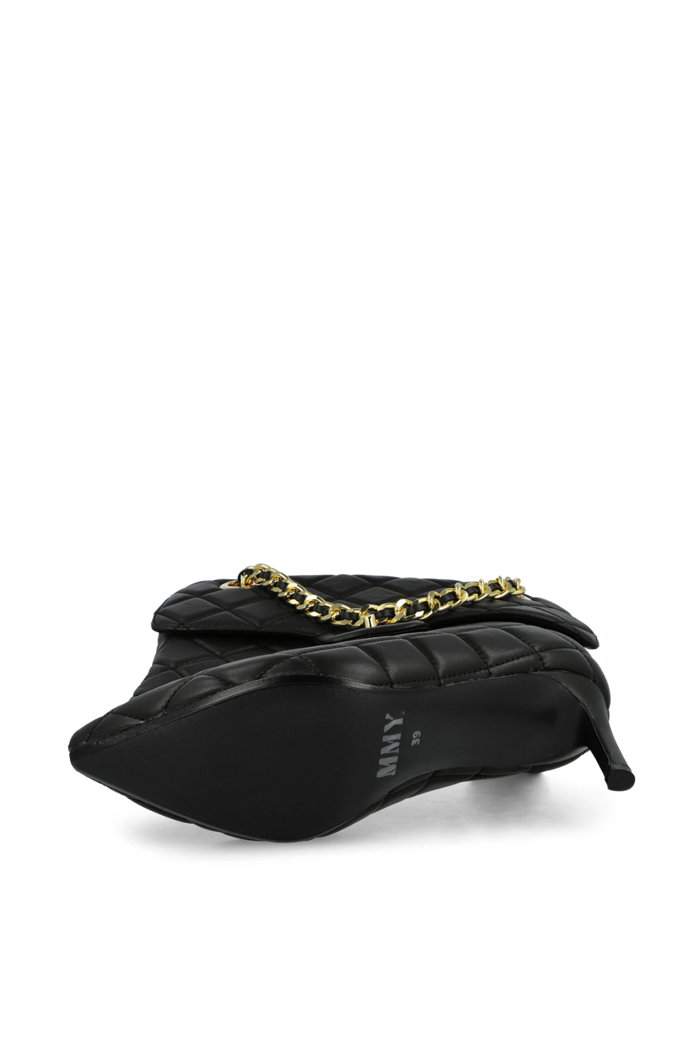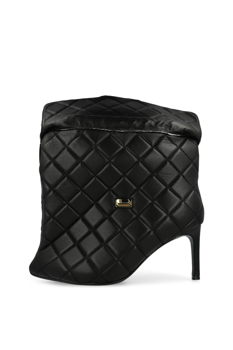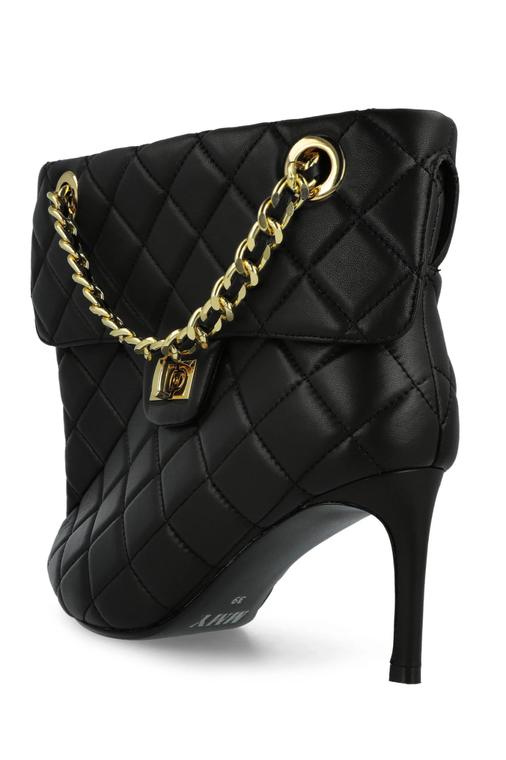 Фирменный каблук-булавка с тонкой графичной линией визуально удлиняет силуэт и создаёт эффект лёгкой провокации, в то время как декоративная деталь, вдохновлённая стёганой сумкой, становится ключевым акцентом модели — неожиданным и абсолютно узнаваемым. Скульптурная конструкция верха подчёркивает архитектурность формы, сохраняя при этом баланс между авангардом и носибельностью.