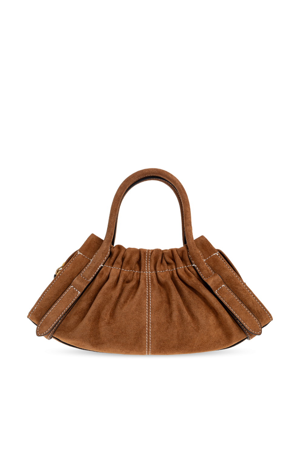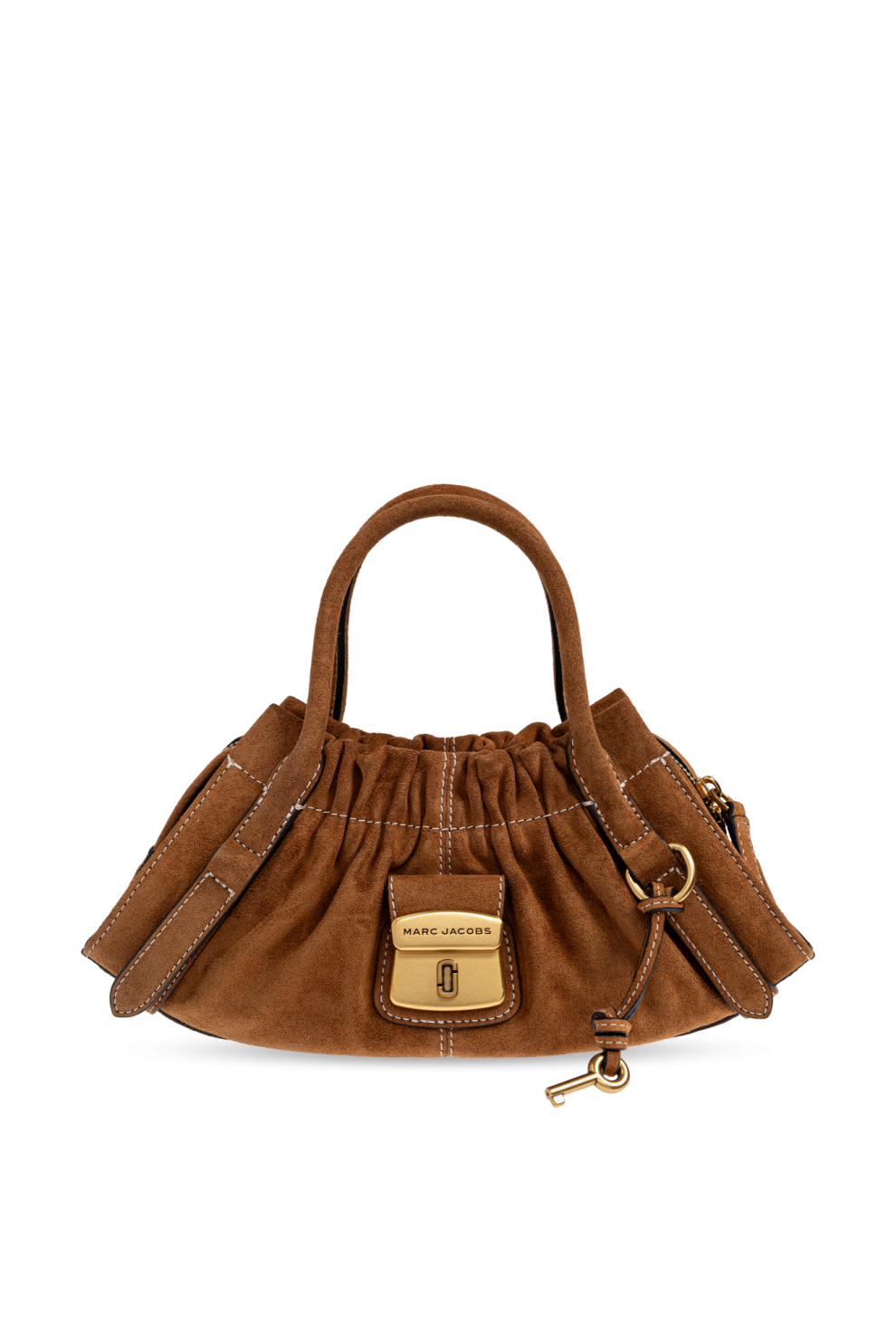 Модель выполнена из высококачественной коричневой замши с бархатистой, живой текстурой, подчёркнутой аккуратной контрастной строчкой светлого оттенка. Две лаконичные ручки из того же материала гармонично дополняют силуэт, а верхняя молния с широким клапаном и декоративной застёжкой в форме замка добавляет нотку винтажной роскоши. Завершающим штрихом становится фирменная металлическая табличка MARC JACOBS, ненавязчиво подчёркивающая статус и дизайнерское происхождение модели.