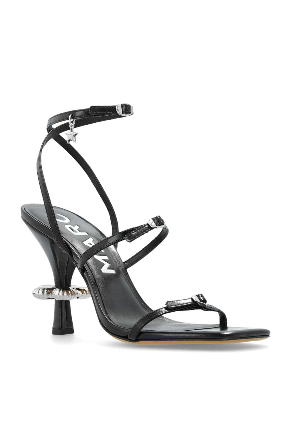 Особый акцент модели — перевернутый конический каблук с инкрустированным кристаллами кольцом, который притягивает взгляд и демонстрирует мастерство бренда в деталях. Элегантная подвеска в виде звезды на застежке щиколотки добавляет нотку роскоши и уникальности. Полностью выполненные из высококачественной кожи, включая внутренние слои и подошву, босоножки гарантируют долговечность и комфорт на протяжении всего дня.