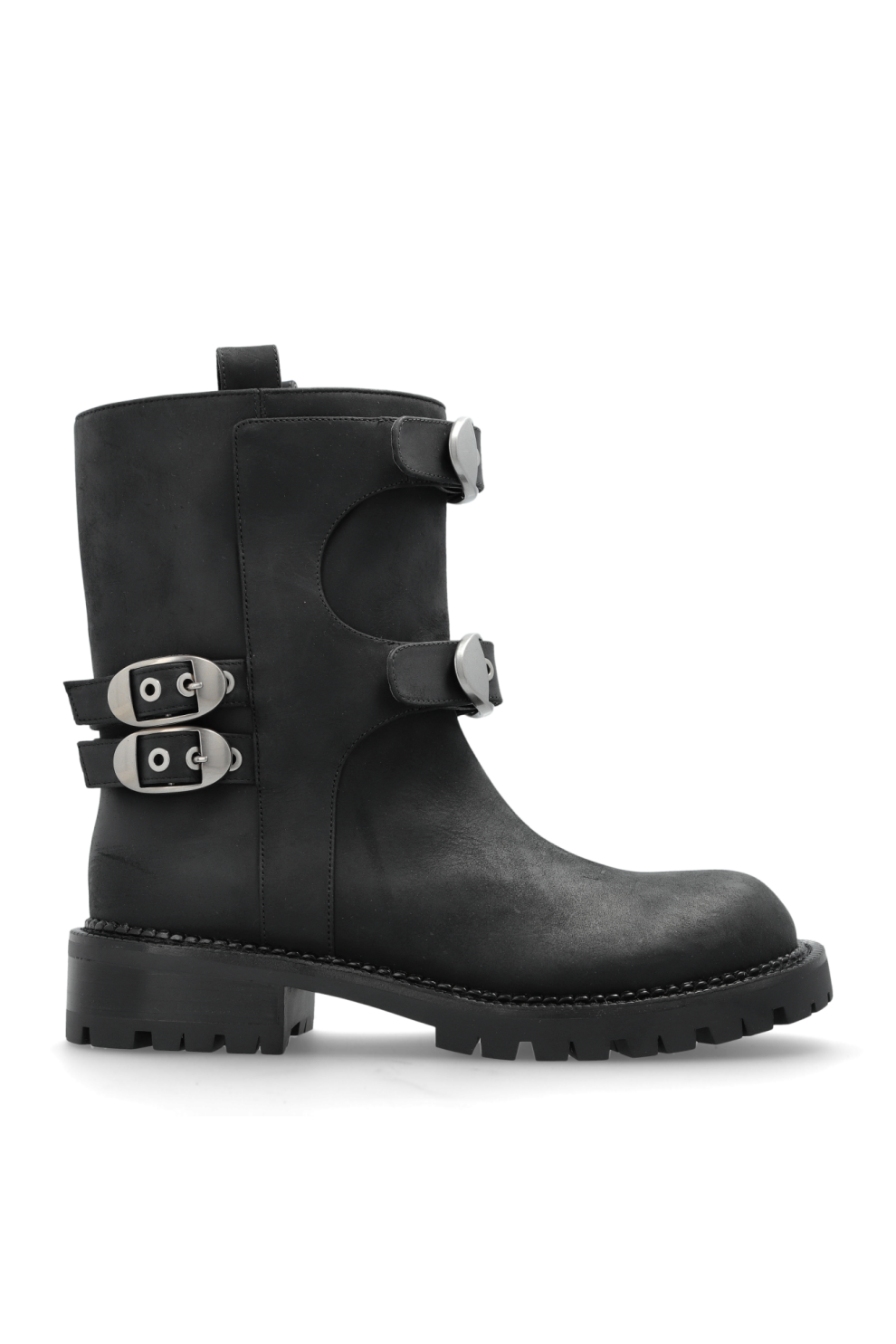 Верх из матовой натуральной кожи глубокого чёрного оттенка подчёркивает чистоту линий и благородство фактуры. Лёгкая текстурность поверхности добавляет визуальной глубины, а четыре эффектные серебристые пряжки с индустриальным характером становятся ключевым акцентом, придавая модели смелость и графичность. Они расположены симметрично на уровне щиколотки и голени, формируя узнаваемый, почти скульптурный образ.