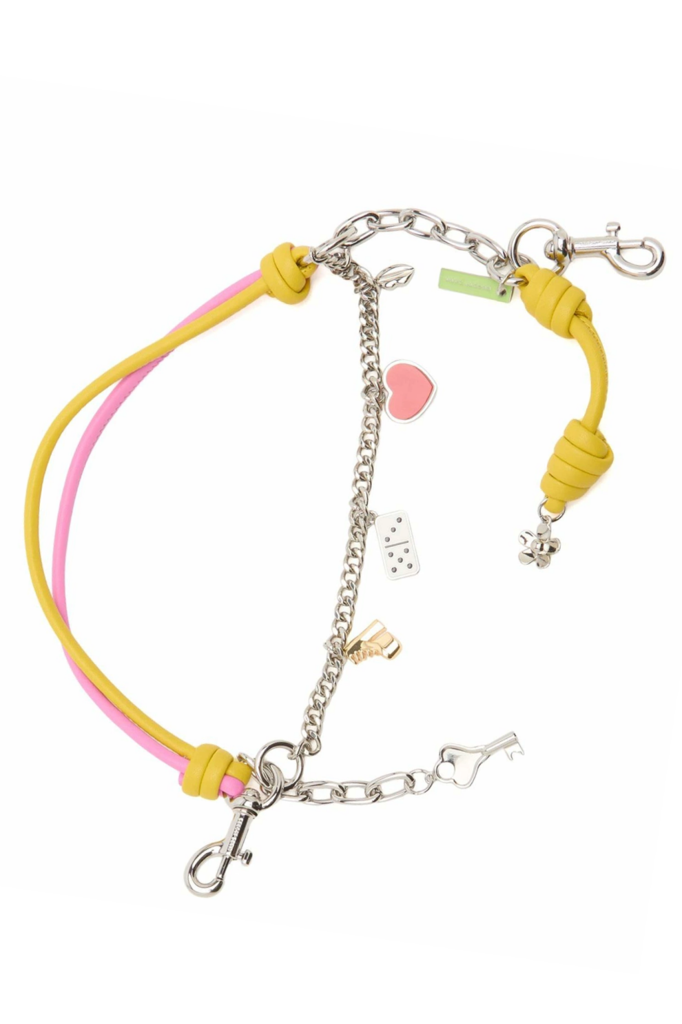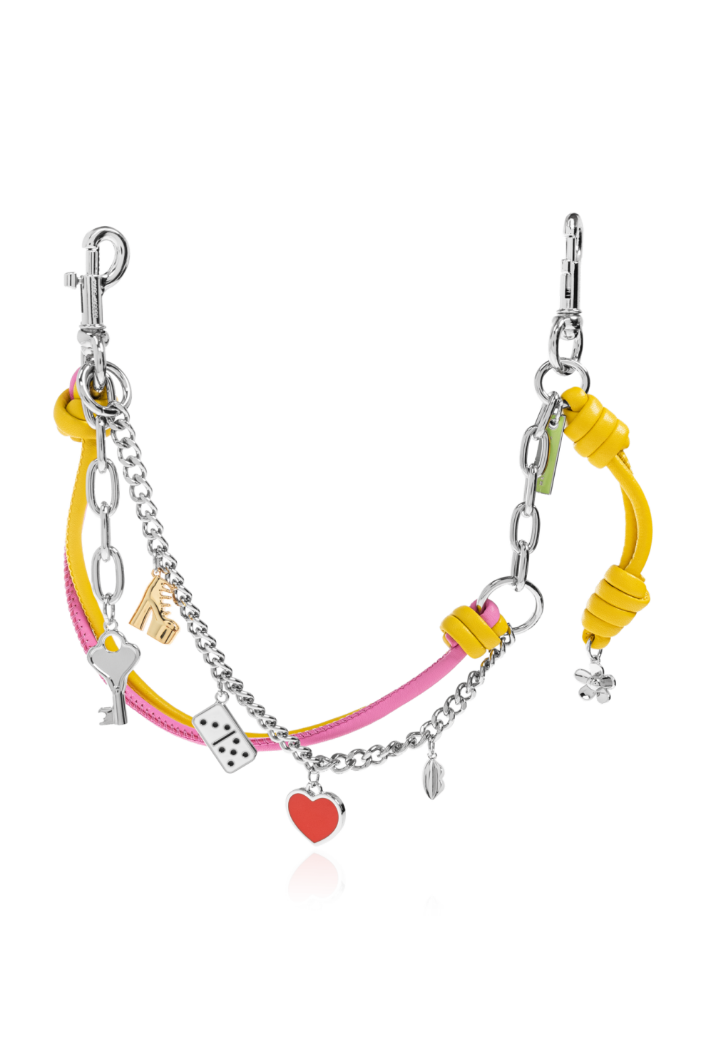 Изделие целиком состоит из элегантных цепочек различного плетения и ремешков насыщенных оттенков желтого и розового, гармонично дополняющих изысканный серебристый металл. Два практичных карабина позволяют легко закрепить украшение, а зеленая логотипная пластинка подчеркивает эксклюзивность изделия.