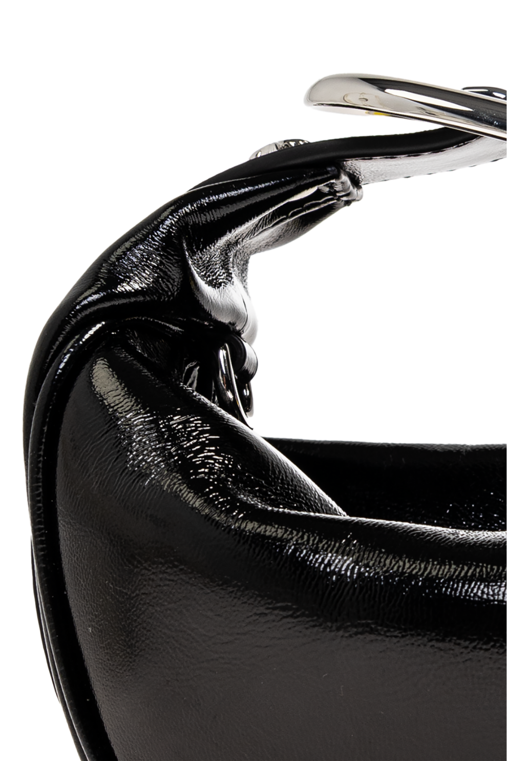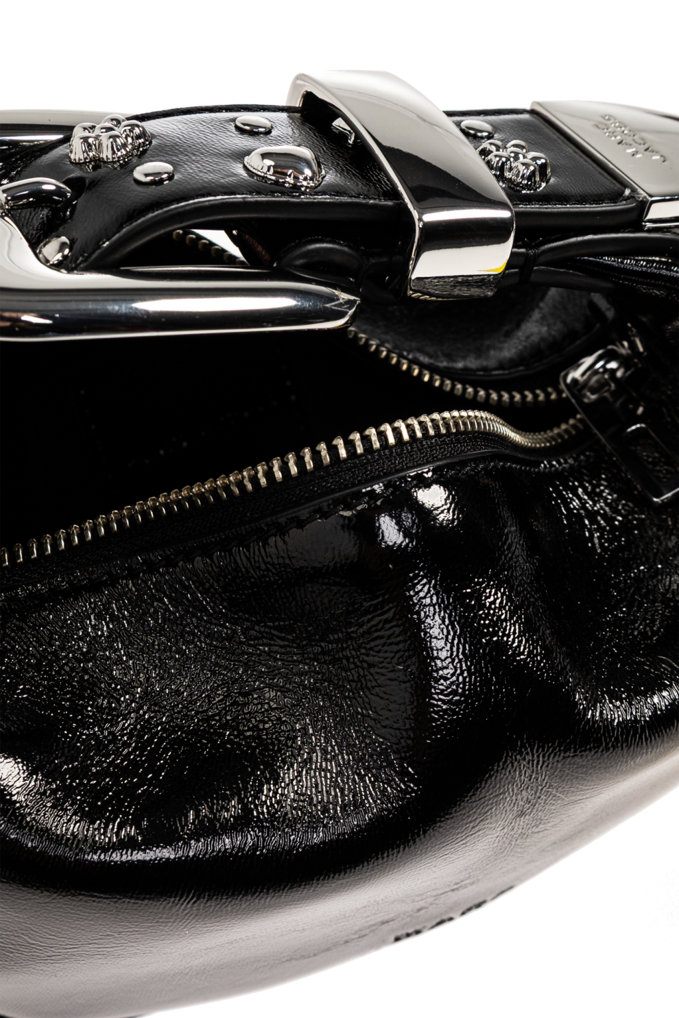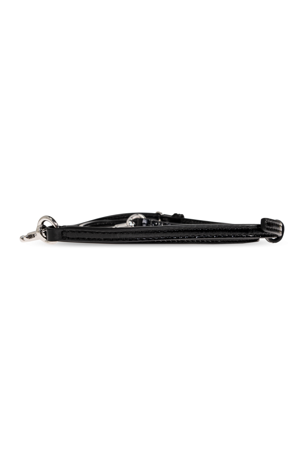 Изысканная, блестящая натуральная кожа с гладкой поверхностью прекрасно отражает свет, подчеркивая глубину черного цвета. Уникальный ремешок, украшенный сверкающими аппликациями и деталями из металла серебристого оттенка, придает изделию неповторимый шарм. Пряжка из элегантно отполированного металла добавляет изысканности.