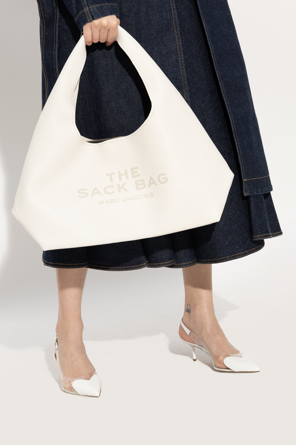 Не слишком большая, не слишком маленькая. Белая сумка-шоппер The Sack от Marc Jacobs изготовлена из зернистой кожи, имеет тисненый логотип спереди и нашивку сзади. Ее мягкий, мешкообразный силуэт с широким закругленным основанием очаровывает плавными линиями ручки, которая органично переходит в корпус сумки. Внутреннее пространство сумки оснащено удобной магнитной застежкой и практичными органайзерами, такими как карман на молнии и отделения, которые подчеркивают ее функциональность и изысканные детали.