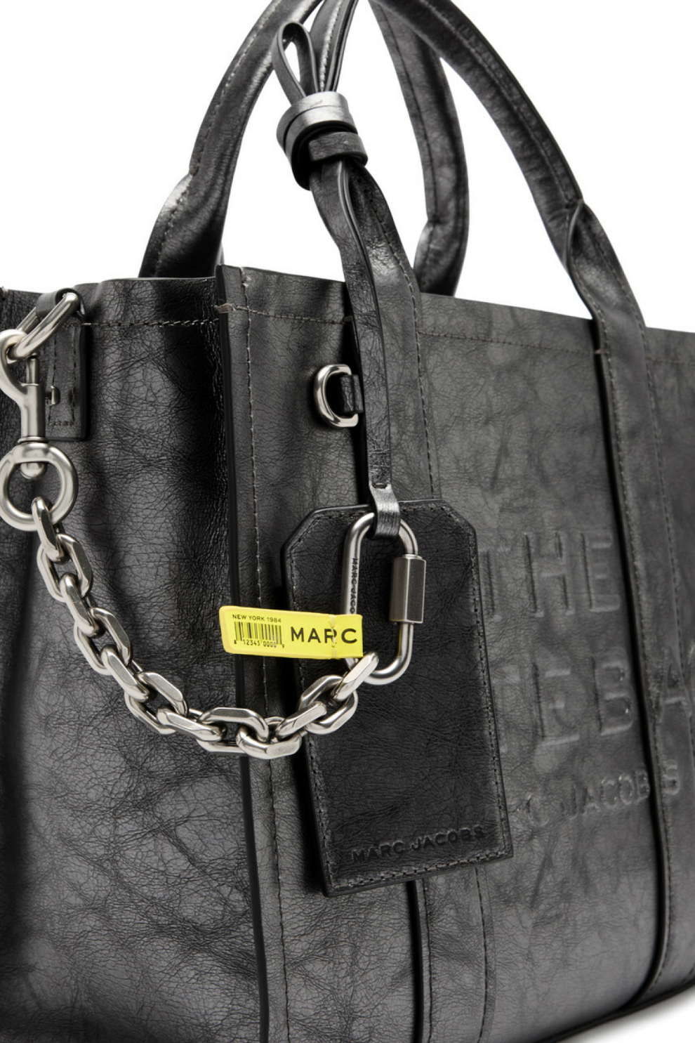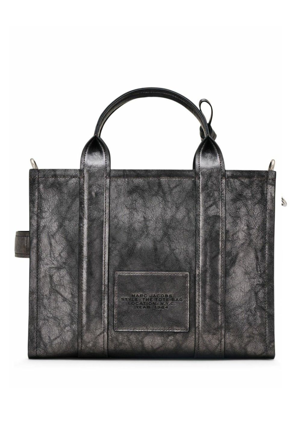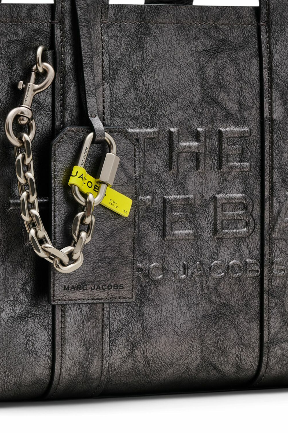Модель оснащена двумя верхними ручками и съёмным регулируемым плечевым ремнём, позволяющим носить сумку на плече или кроссбоди. Декоративный съёмный брелок-декор на цепочке с карабином, тиснённый логотип The Tote Bag спереди и фирменная металлическая табличка сзади подчёркивают фирменную эстетику Marc Jacobs. Удобная боковая бирка, металлические ножки и качественная подкладка из ткани добавляют практичности и долговечности.