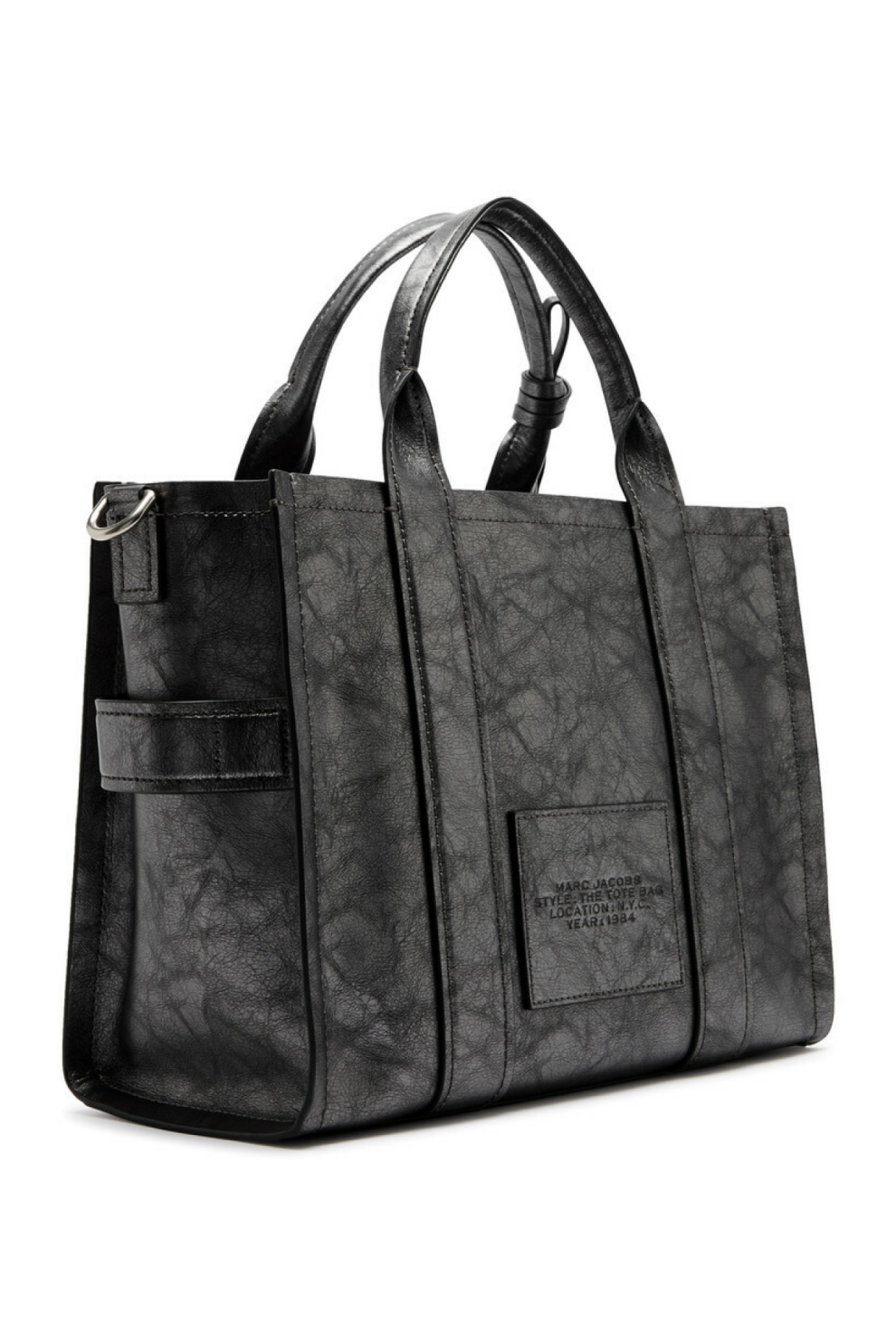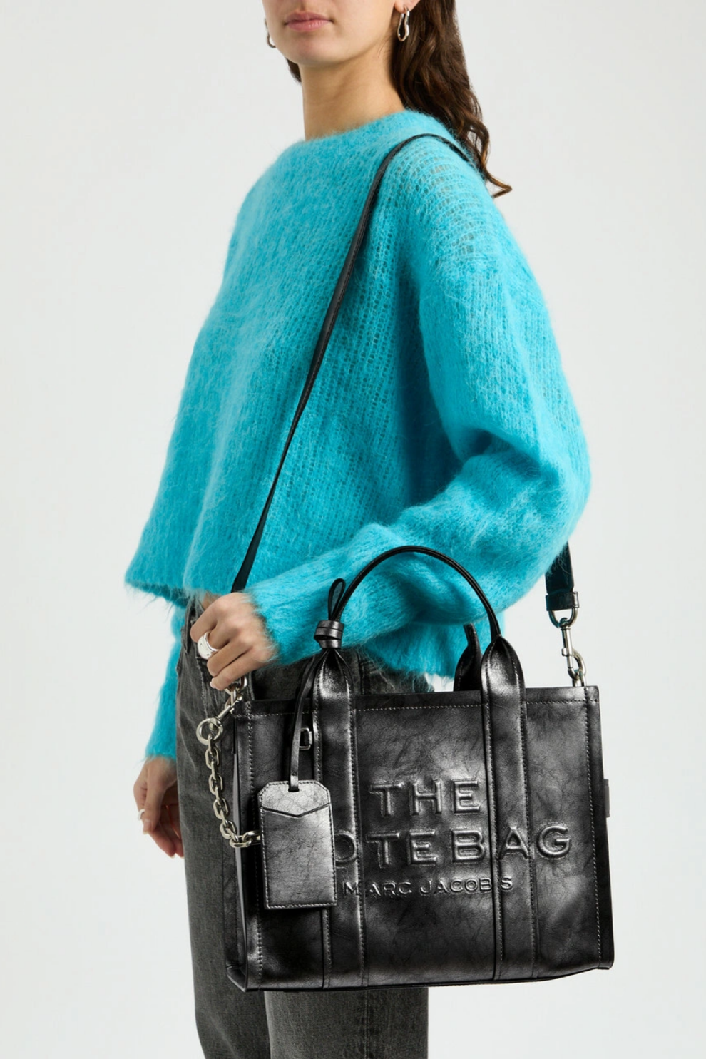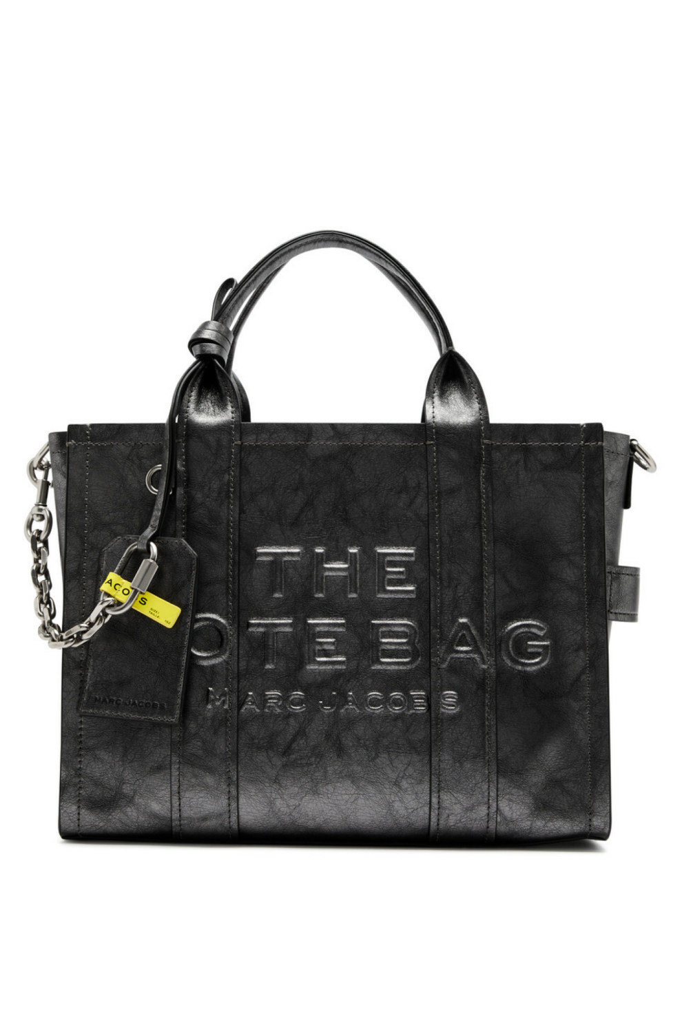 Модель оснащена двумя верхними ручками и съёмным регулируемым плечевым ремнём, позволяющим носить сумку на плече или кроссбоди. Декоративный съёмный брелок-декор на цепочке с карабином, тиснённый логотип The Tote Bag спереди и фирменная металлическая табличка сзади подчёркивают фирменную эстетику Marc Jacobs. Удобная боковая бирка, металлические ножки и качественная подкладка из ткани добавляют практичности и долговечности.