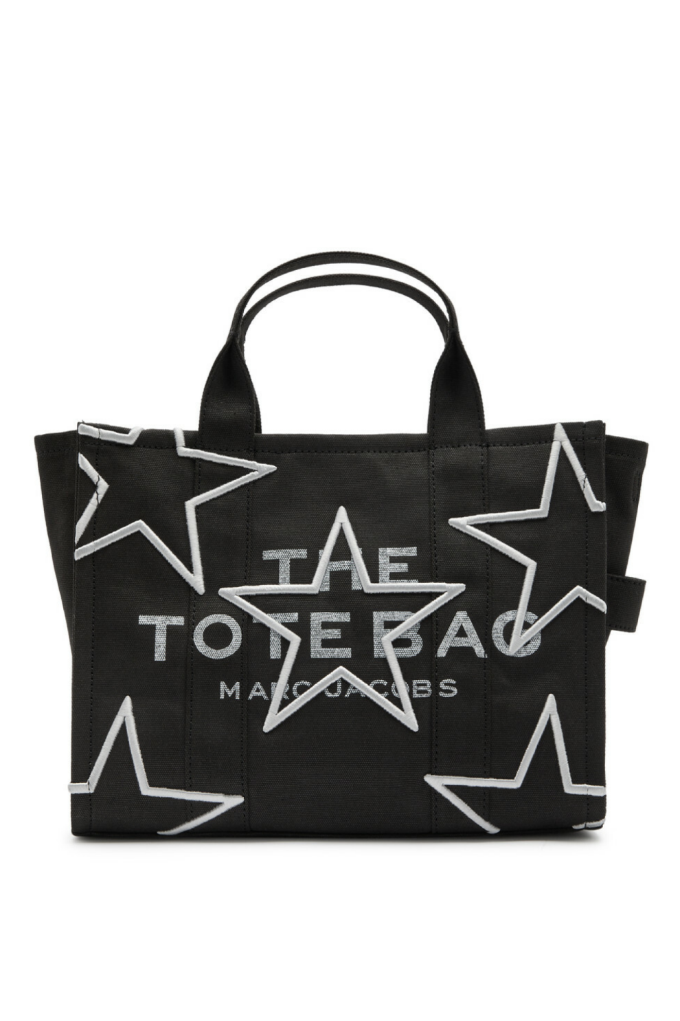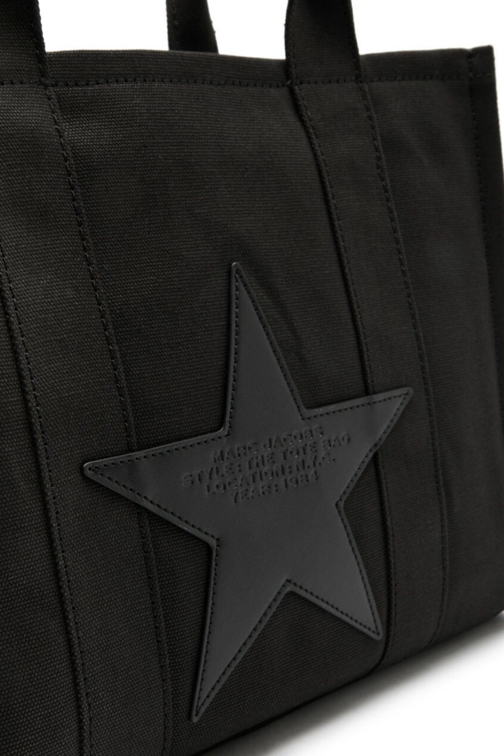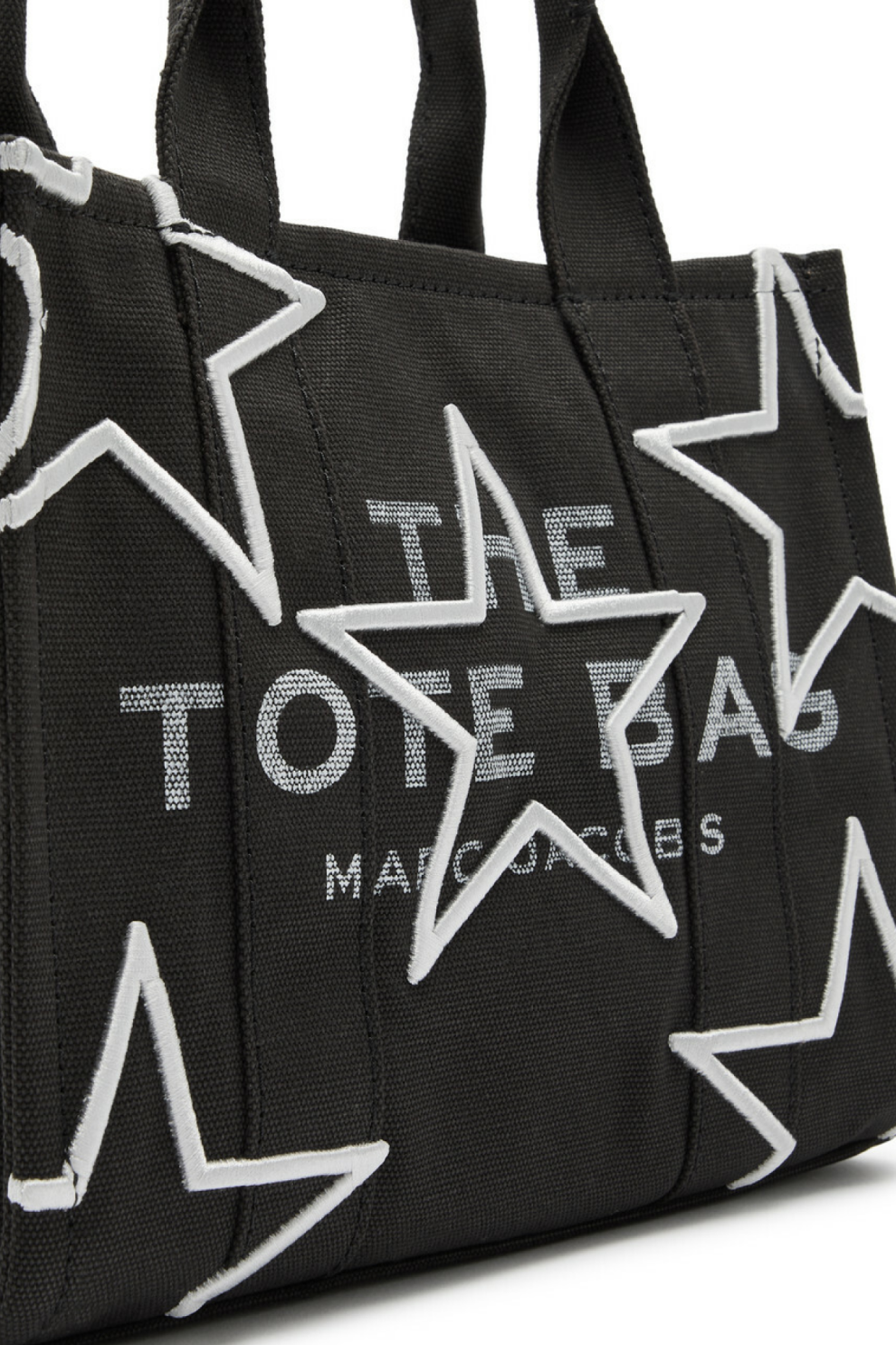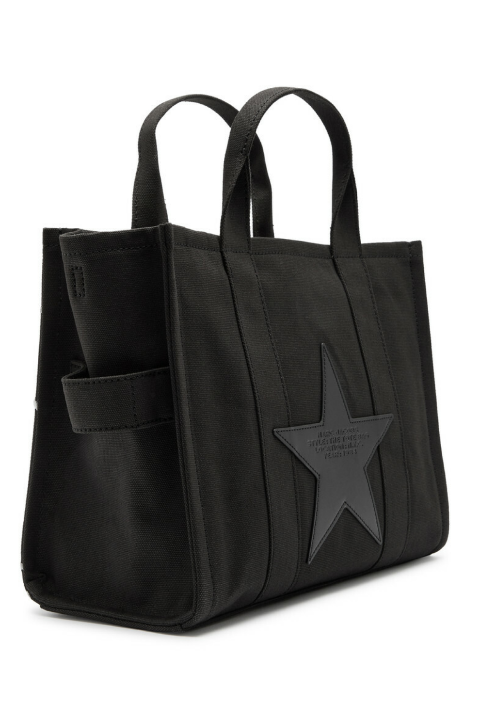 Модель выполнена из прочного канваса чёрного цвета и украшена вышивкой в виде звёзд на передней панели, эффектно сочетающейся с чуть выцветшим логотипом и надписью The Tote Bag. На задней панели — кожаная аппликация-звезда с тиснением логотипа, а фирменная боковая бирка и аккуратная прострочка подчёркивают премиальное качество исполнения.