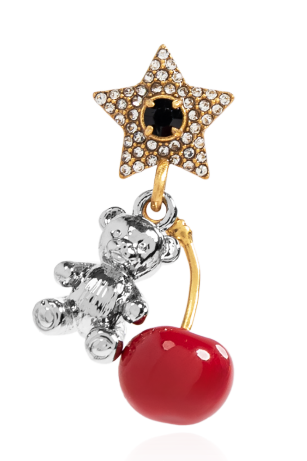 Первая серьга из асимметричной пары украшена богато декорированной золотой звездой, инкрустированной кристаллами, с черным центральным камнем, дополненной сверкающим серебряным кулоном в виде плюшевого мишки и объемной красной вишней. Вторая серьга представляет собой золотую морскую звезду с зеленым камнем и желтым кулоном в форме автомобиля, украшенным игривым красным сердечком или губами, покрытыми стекловидной эмалью.