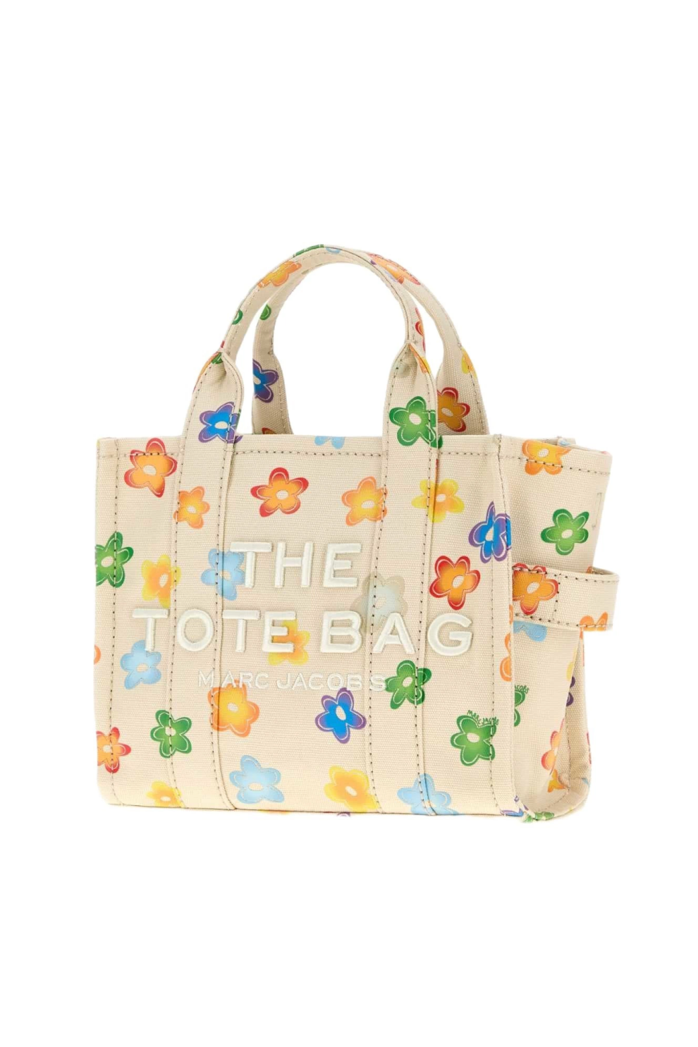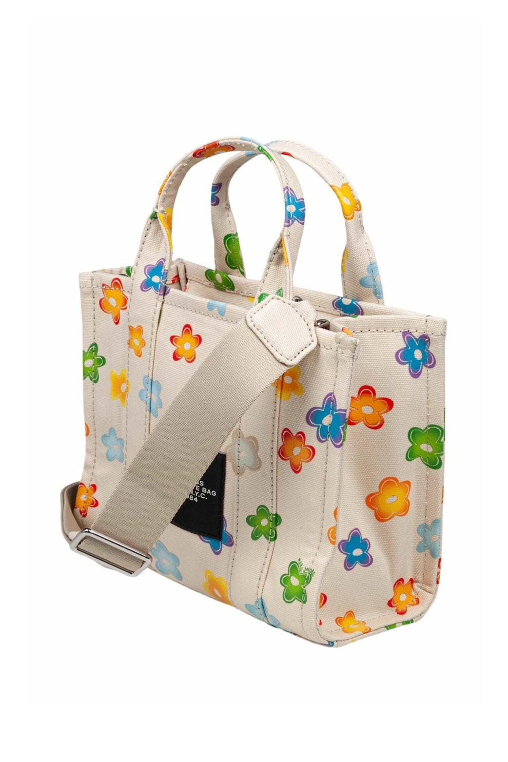 Сумка выполнена из прочного канваса бежевого цвета и украшена многоцветным цветочным принтом, который придаёт модели свежий и современный характер. Логотип Marc Jacobs размещён на передней и задней панелях, подчёркивая узнаваемую эстетику бренда.