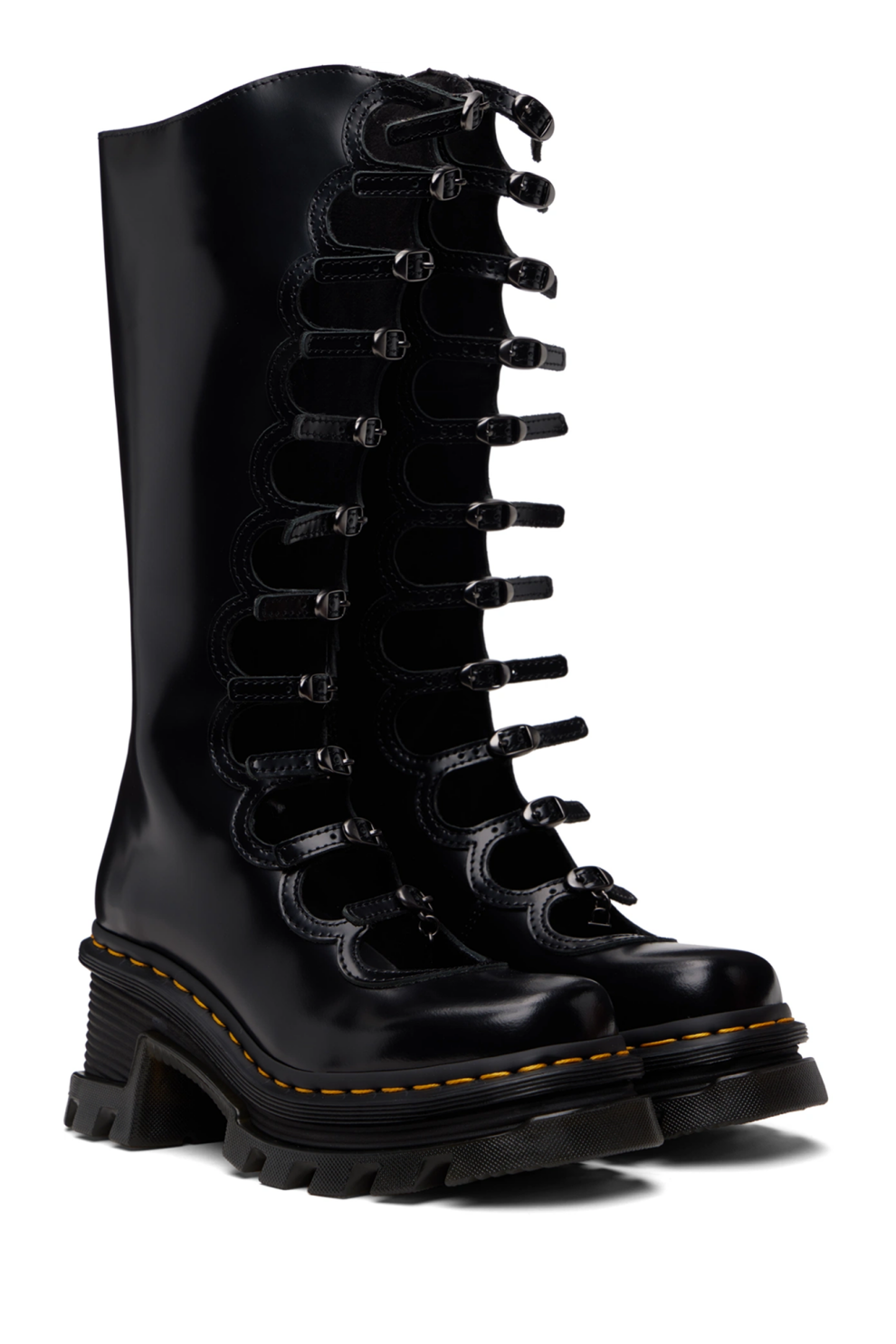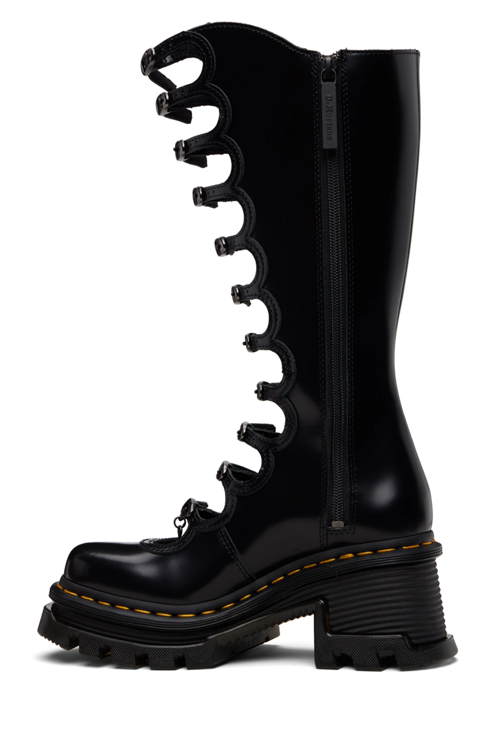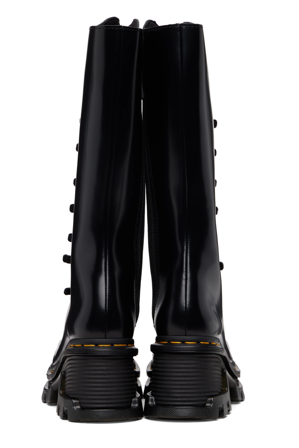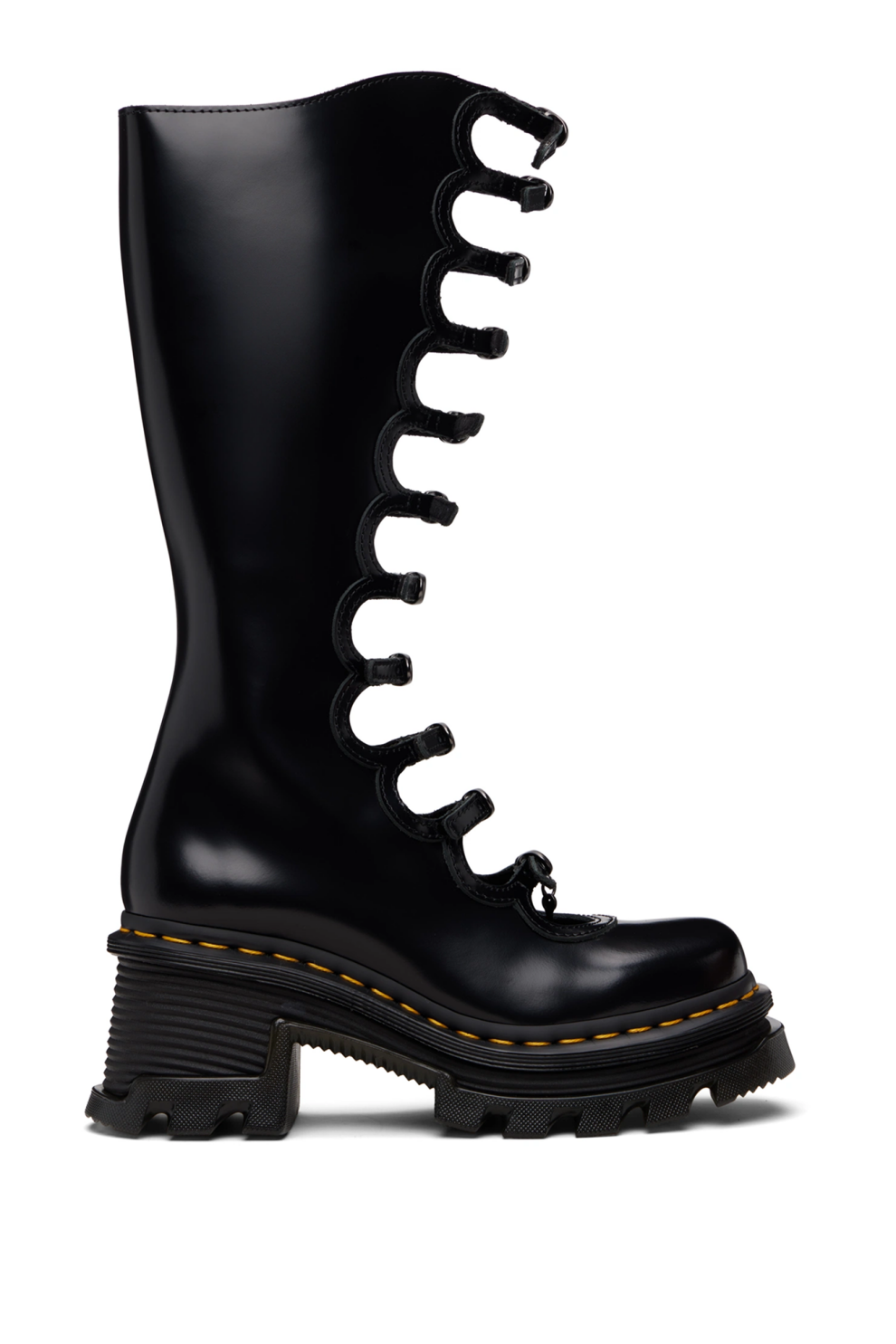 Высокие сапоги Kiki от Marc Jacobs, выполненные из гладкой полированной кожи чёрного цвета в рамках культовой коллаборации с Dr. Martens. Модель сочетает утончённый силуэт с характерной брутальной эстетикой бренда.