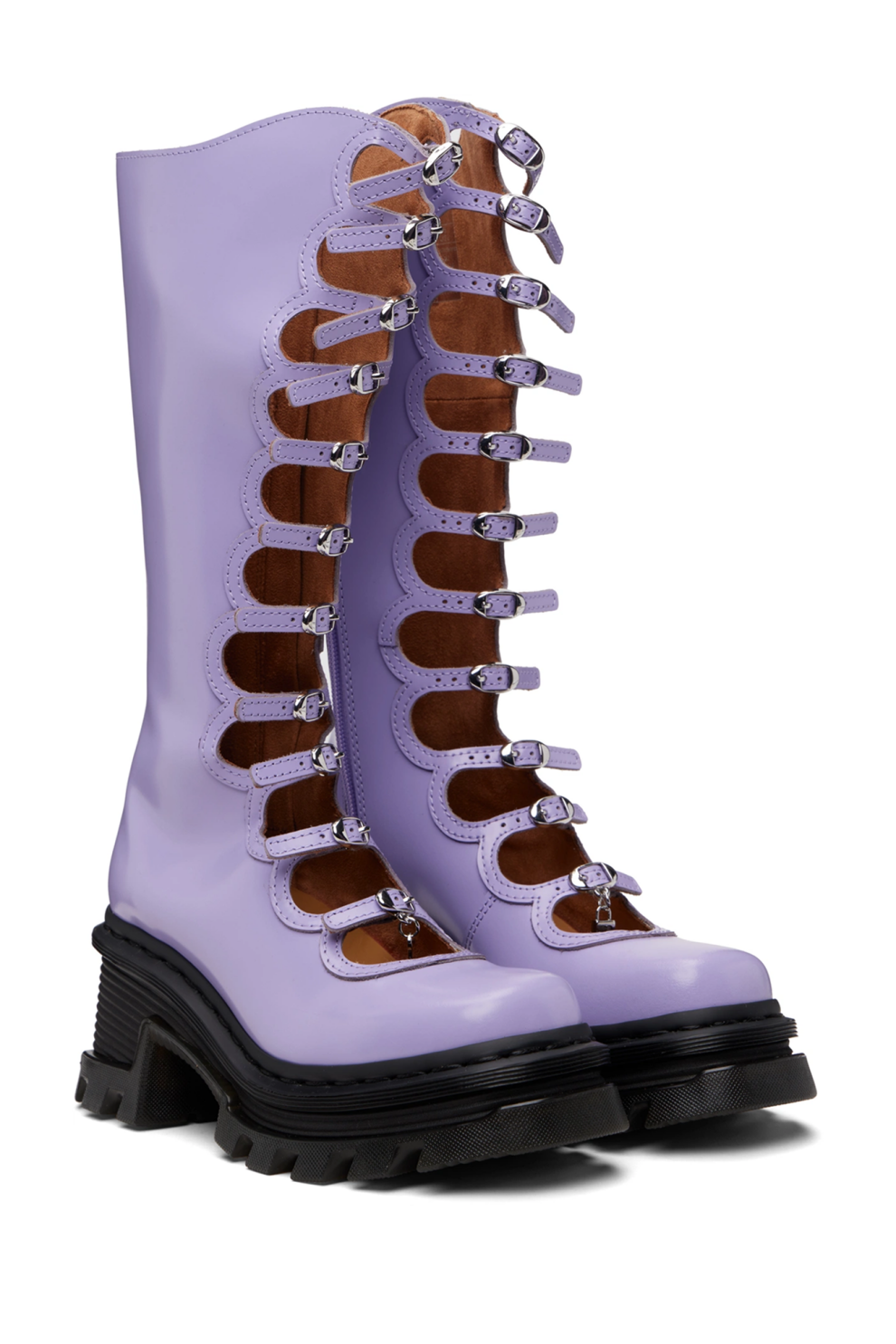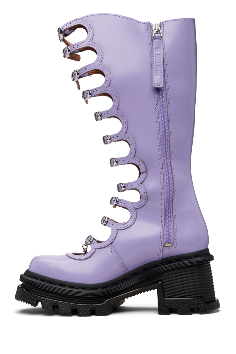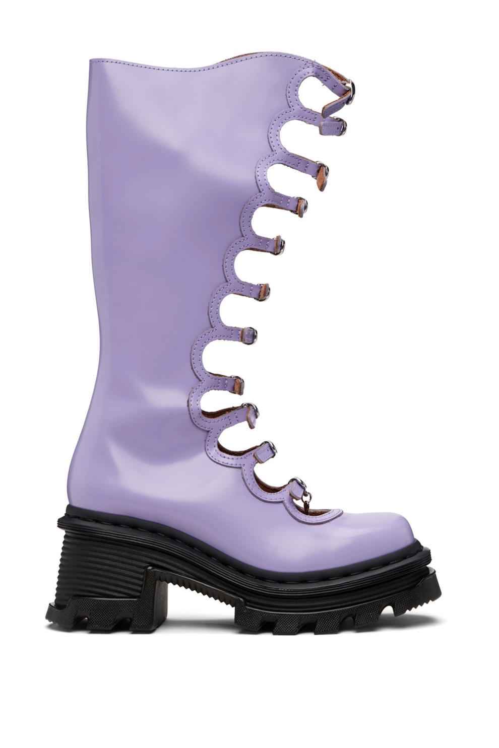 Высокие сапоги Kiki от Marc Jacobs, созданные в рамках эксклюзивной коллаборации с Dr. Martens. Модель выполнена из мягко полированной натуральной кожи в насыщенном сиреневом оттенке и отличается выразительным квадратным носком.