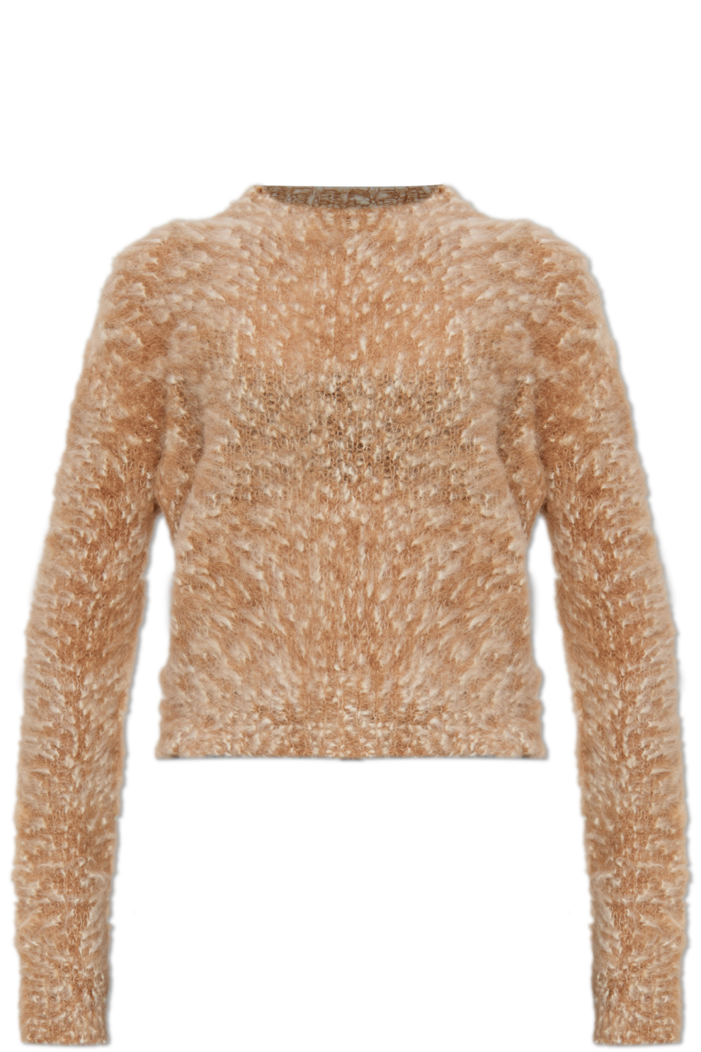 Этот свитер Marni с круглым вырезом очаровывает своей изысканной эстетикой и уникальной текстурой, напоминающей облако. Нежно-пушистый трикотаж с меланжевой структурой создаёт уникальный трёхмерный эффект, подчёркивая бежевый оттенок свитера и его уютную лёгкость. Классический, простой крой с длинными рукавами мягко облегает силуэт, придавая образу нотку непринуждённого шика, а слегка свободный крой и длина до бёдер гарантируют комфорт в повседневной носке.