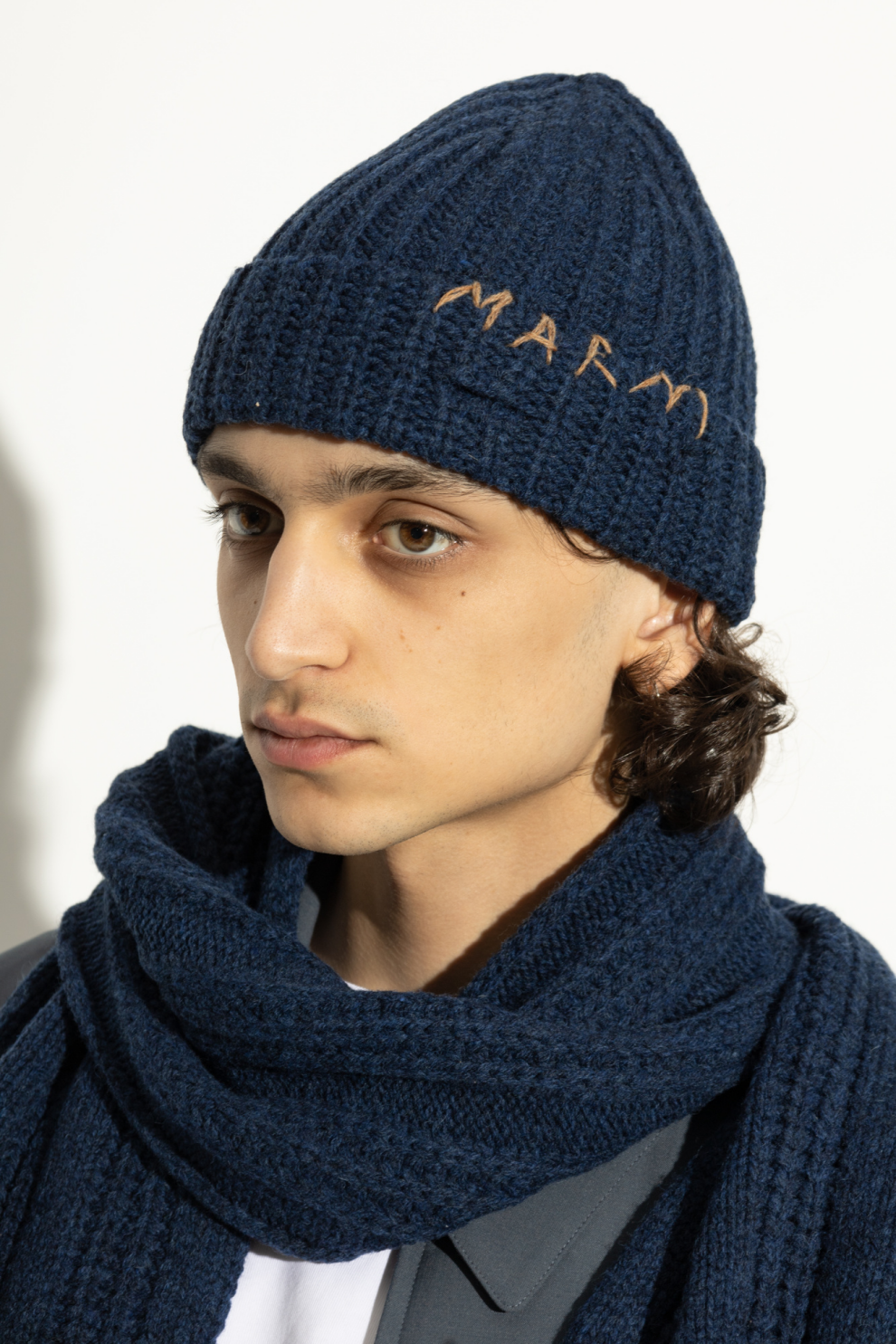 Шапка с логотипом Marni — квинтэссенция элегантности в минималистичном исполнении. Изготовленная из высококачественной плотной шерсти темно-синего цвета, она излучает изысканность и тепло, идеально подходит для прохладных дней. Уникальной особенностью изделия является широкая подвернутая манжета и гладкая, однородная текстура ребристого переплетения, подчёркивающая прочность и эластичность трикотажа.