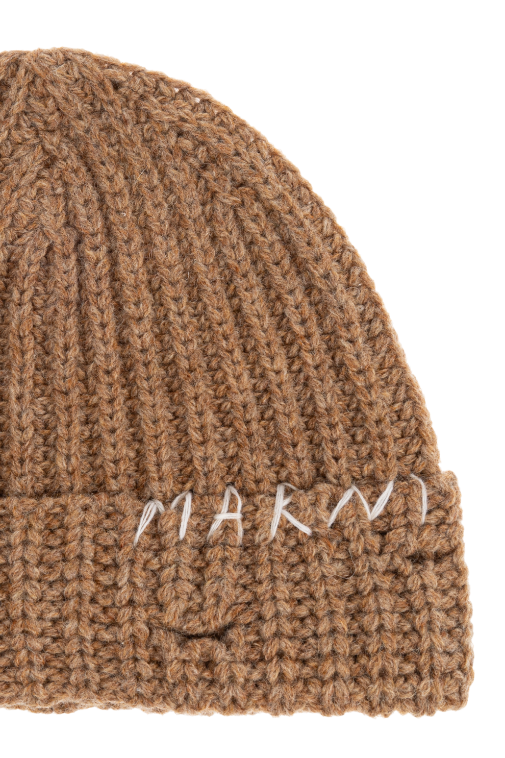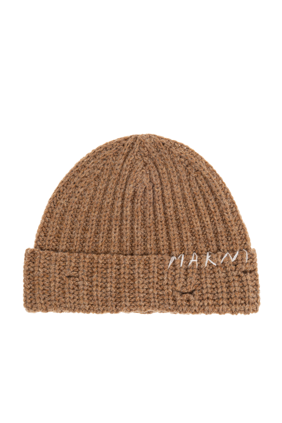 Шапка с логотипом Marni — квинтэссенция элегантности в минималистичном исполнении. Изготовленная из высококачественной плотной шерсти коричневого цвета, она излучает изысканность и тепло, идеально подходит для прохладных дней. Уникальной особенностью изделия является широкая подвернутая манжета и гладкая, однородная текстура ребристого переплетения, подчёркивающая прочность и эластичность трикотажа.
