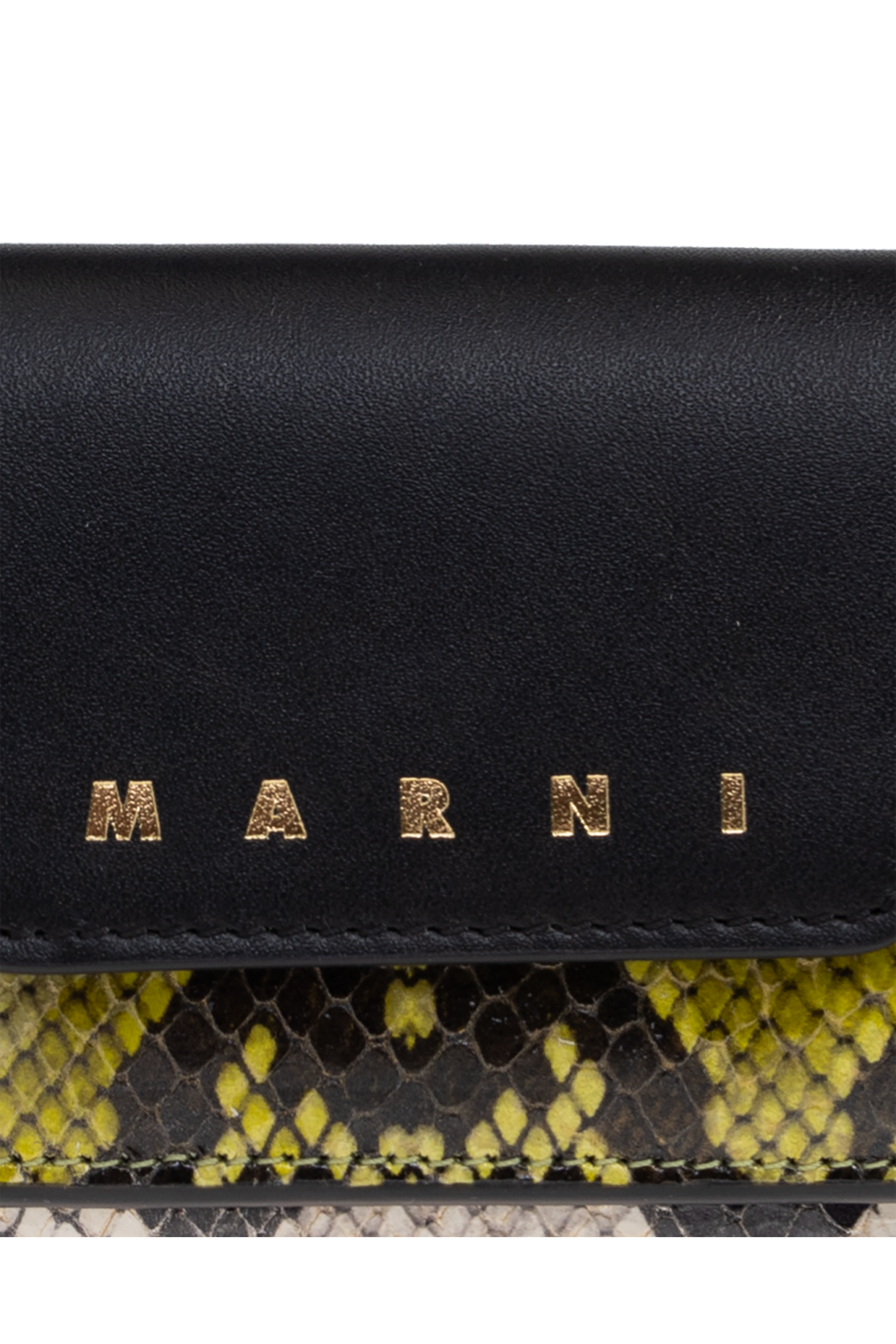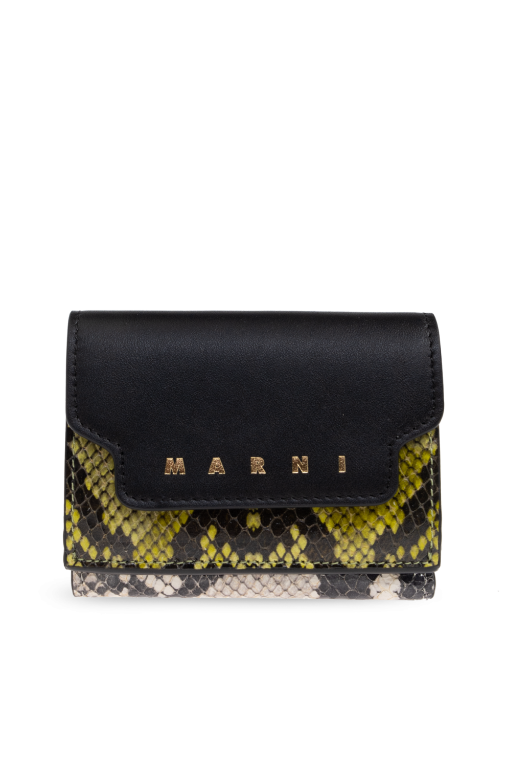 Кожаный кошелек Marni — воплощение изысканного стиля, сочетающее в себе изысканное мастерство и исключительный дизайн. Его классическая прямоугольная форма , трёхсекционная конструкция и уникальный фактурный дизайн привлекают внимание: гладкий чёрный клапан контрастирует с жёлто-чёрным узором под змеиную кожу с лёгкими акцентами белого и бежевого.