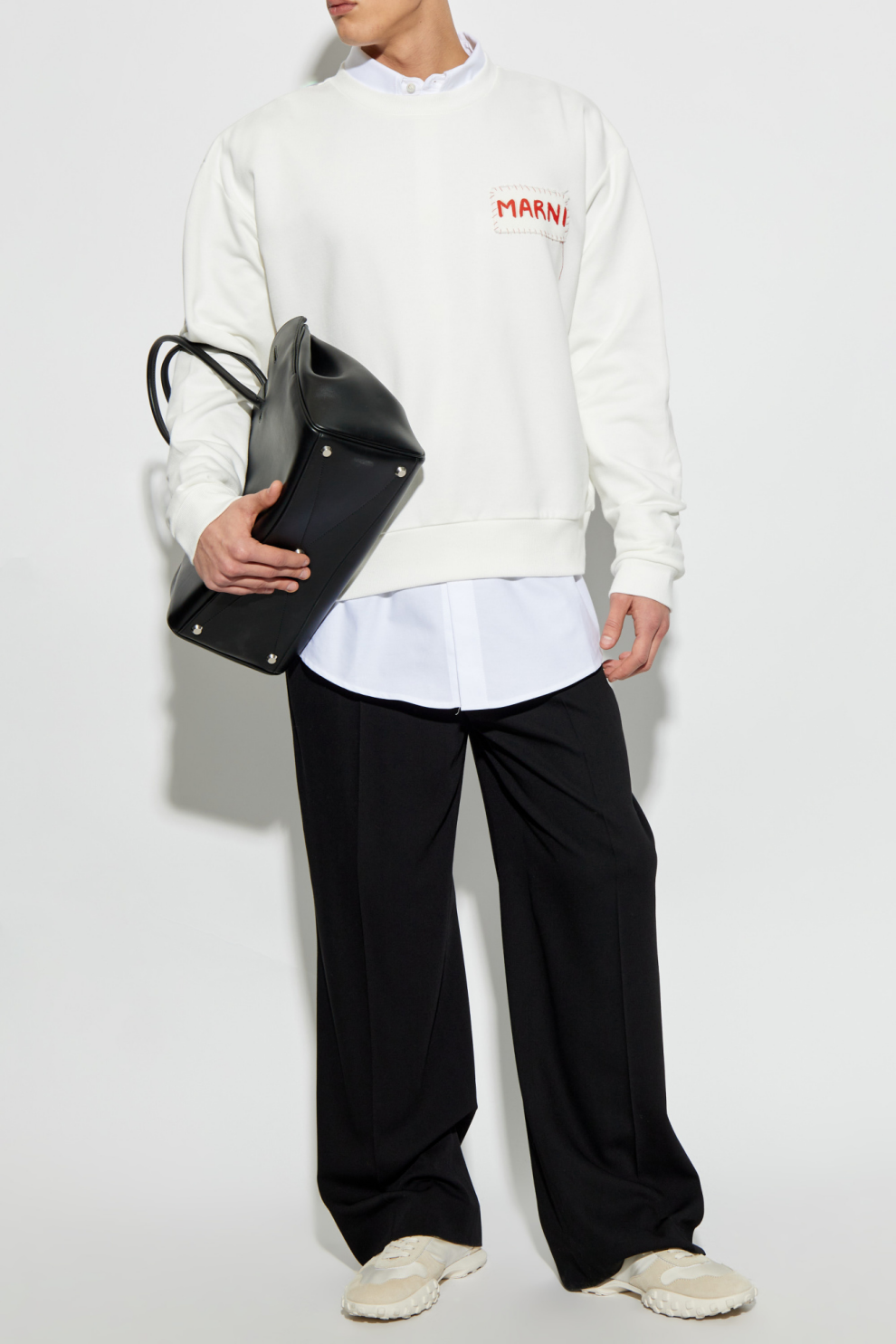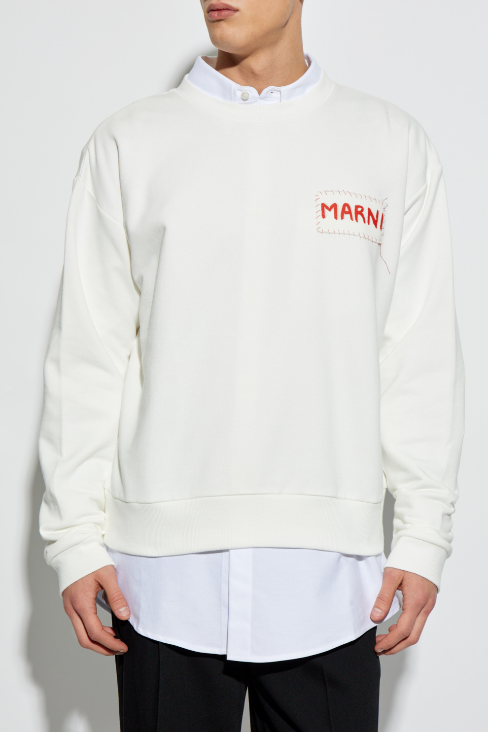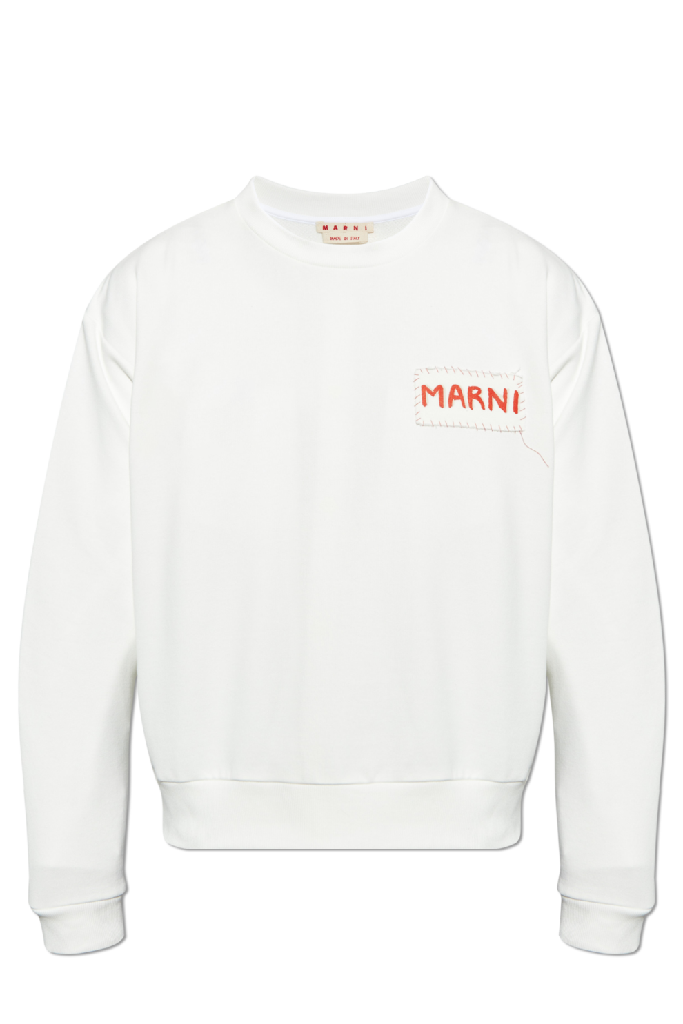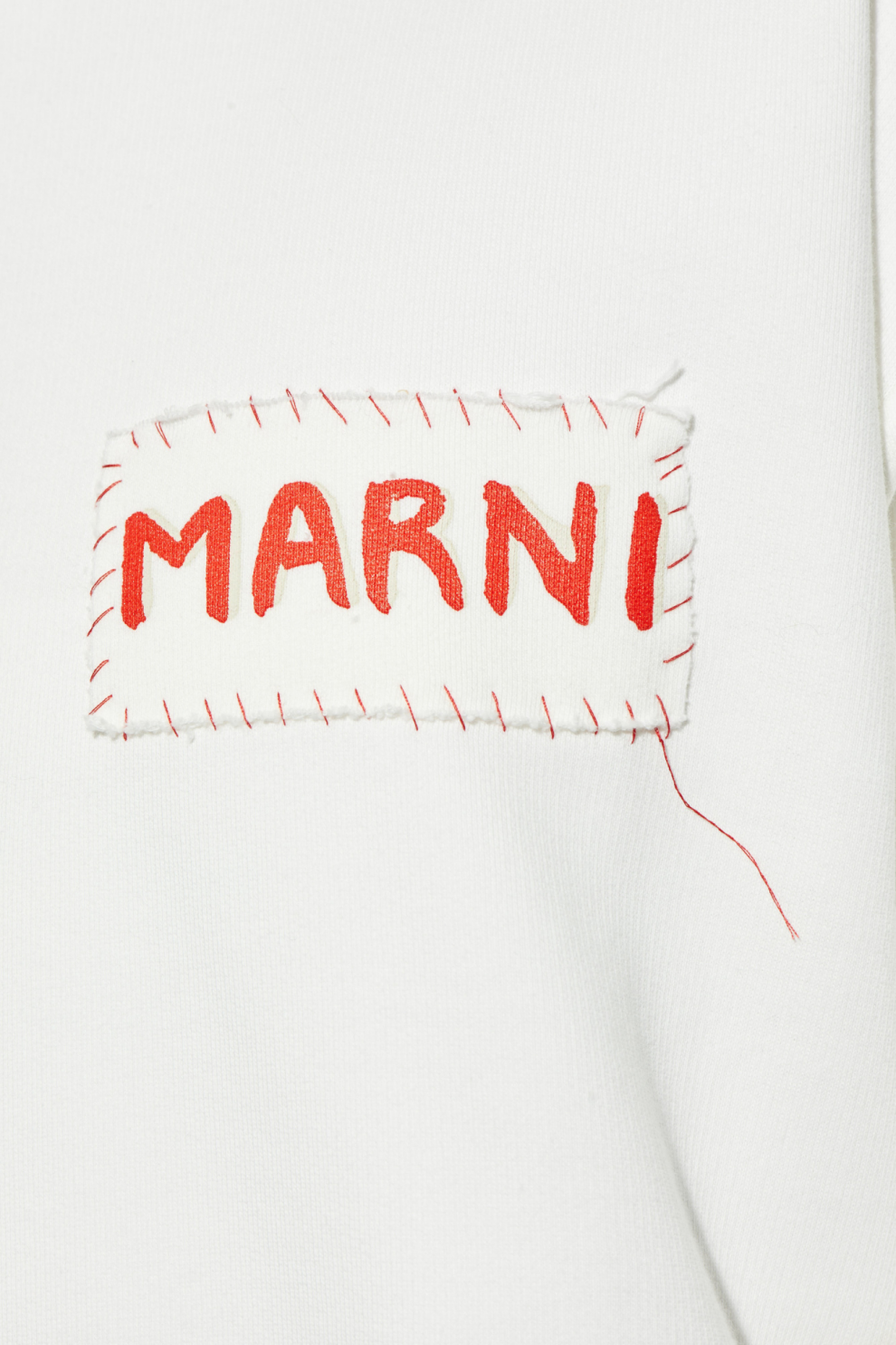 Изготовленная из мягкого хлопкового трикотажа средней плотности, она нежно облегает тело, даря ощущение комфорта и удовольствия от ношения в любой ситуации. Универсальный белый цвет подчёркивает вневременную элегантность модели, а эффектная нашивка с логотипом «MARNI» — красные буквы на контрастном фоне, обрамлённые неровной строчкой — превращает толстовку в арт-объект. Эта тщательно выполненная деталь придаёт изделию уникальный характер, словно вышитый вручную, и отражает художественный замысел бренда.