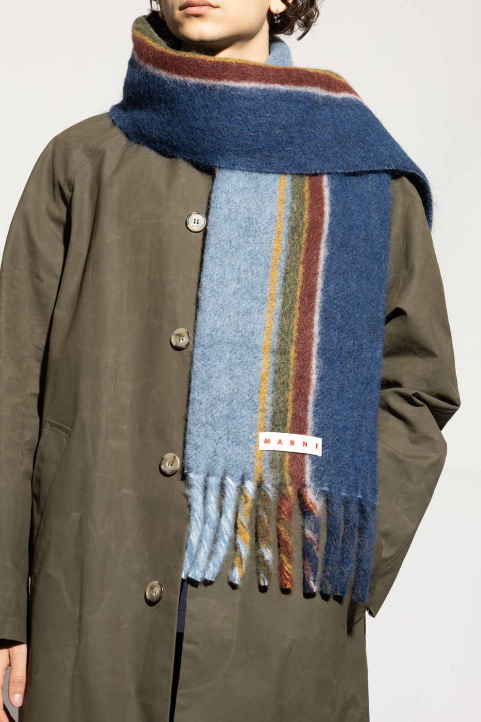 Изготовленный из пушистой, мягкой пряжи с добавлением тонкого мохера и шерсти альпаки, он окутает вас уютом и комфортом даже в самые холодные дни. Длинная бахрома и неброская жаккардовая нашивка с эмблемой Marni подчёркивают уникальность каждой модели, дополняя изысканный вкус.