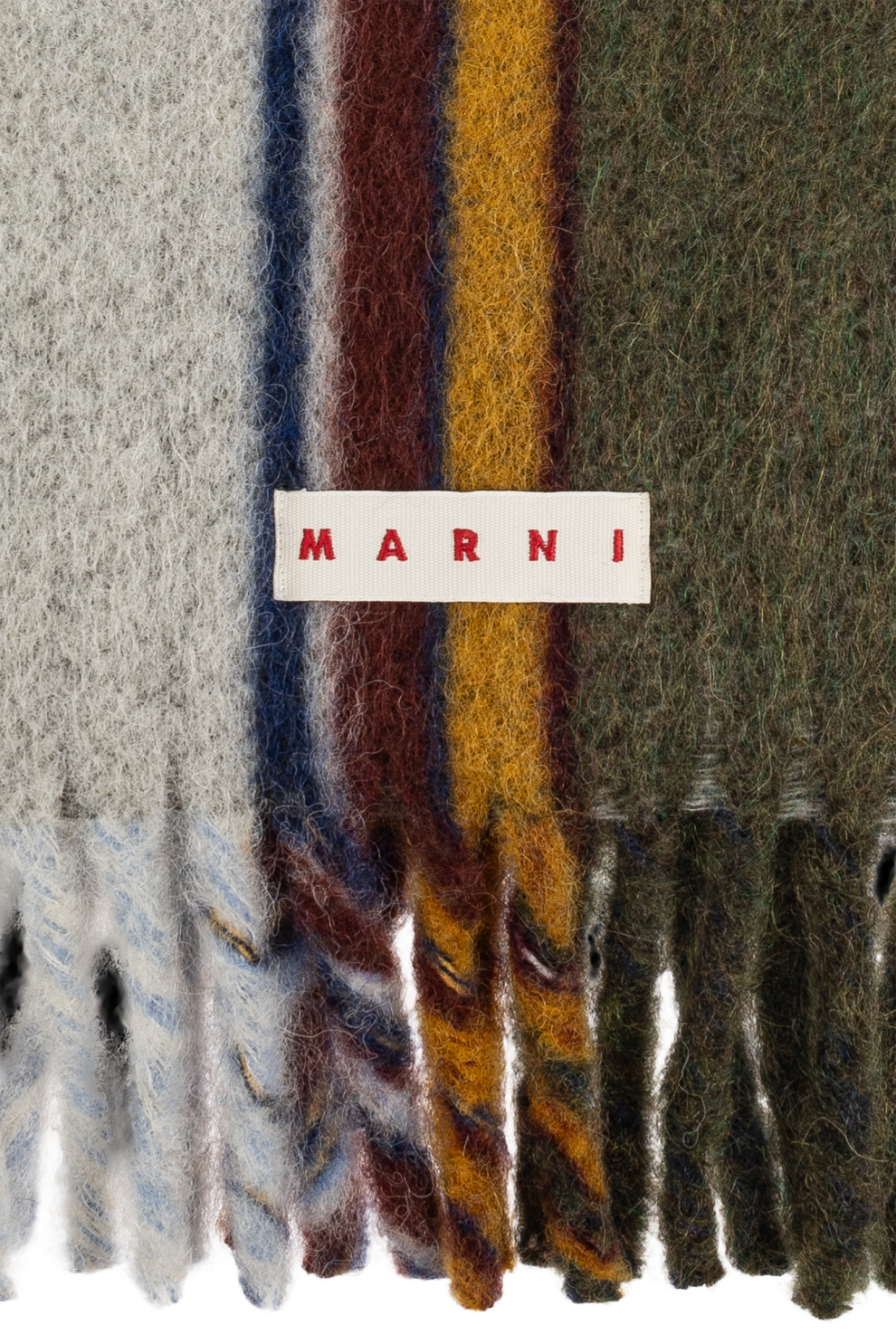 Тонко переплетённые широкие вертикальные полосы серого, оливкового, горчичного, бордового и синего цветов делают этот аксессуар выразительным и одновременно изысканным. Дизайн дополняет уникальная нашивка с логотипом «MARNI» малиново-красного цвета на белом фоне – символ эксклюзивного стиля.