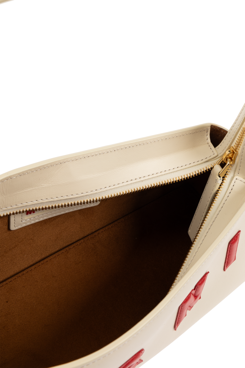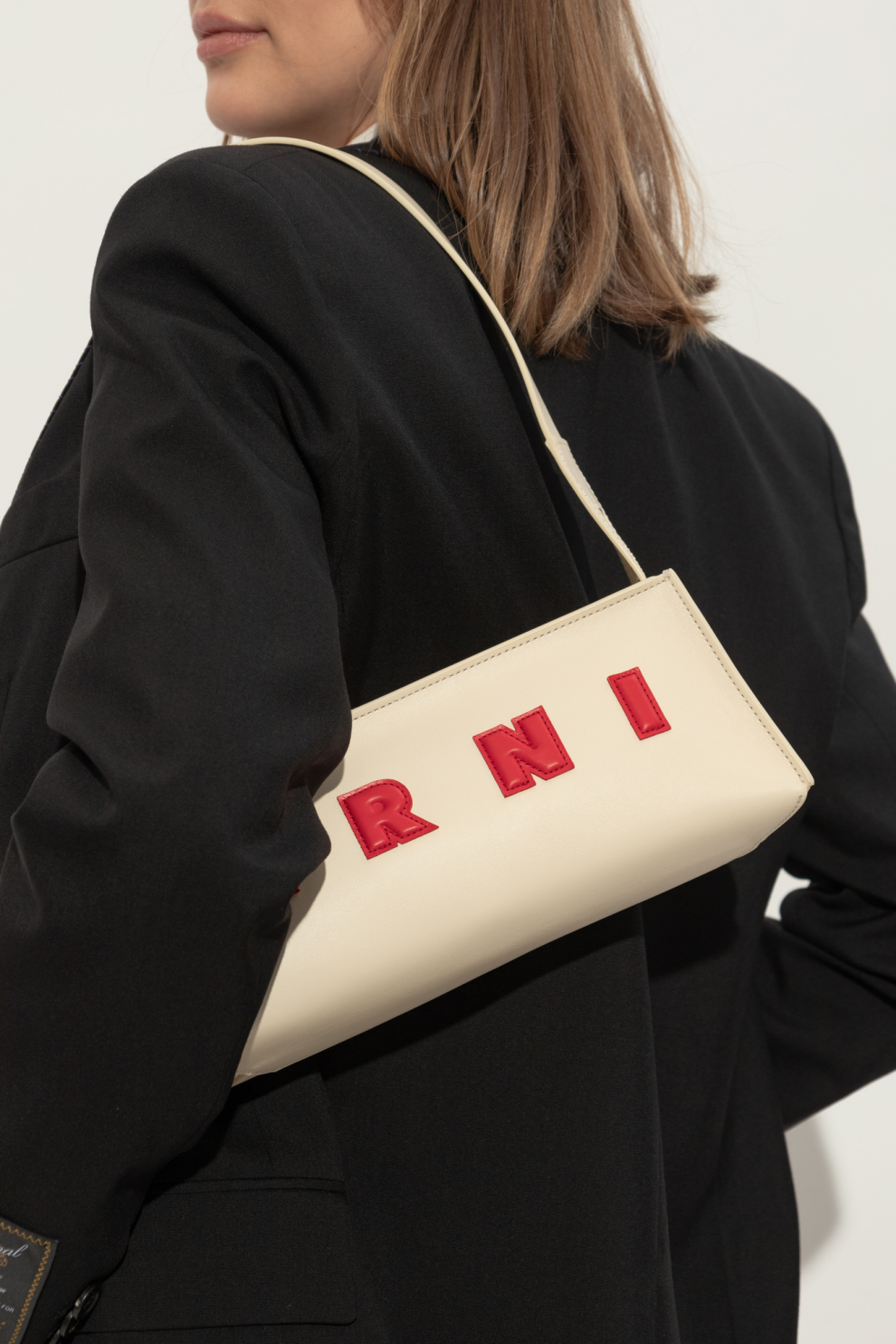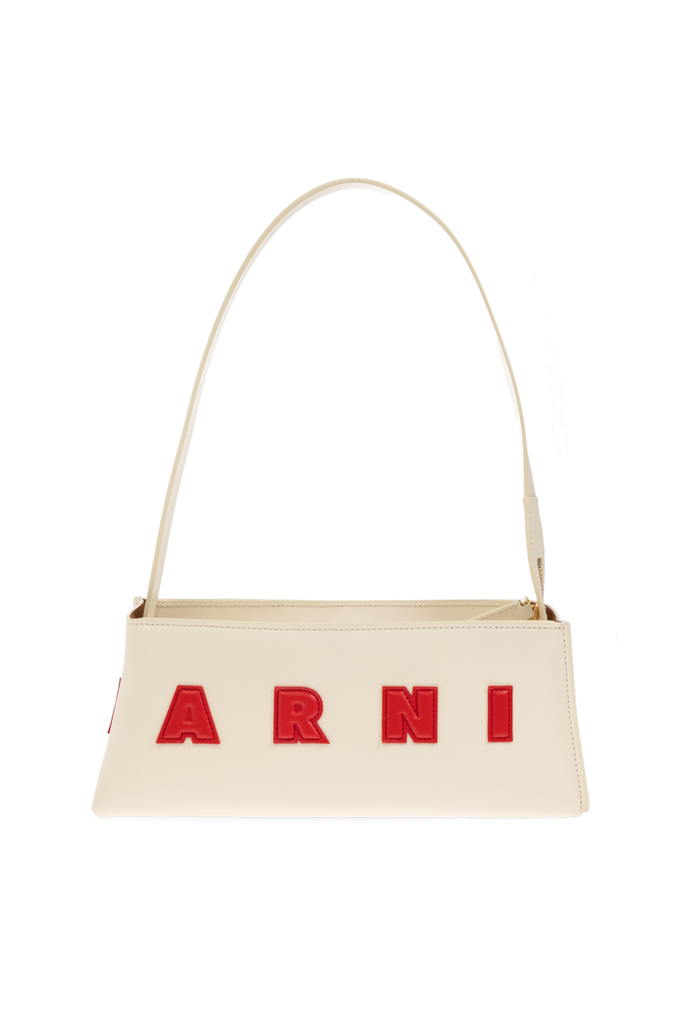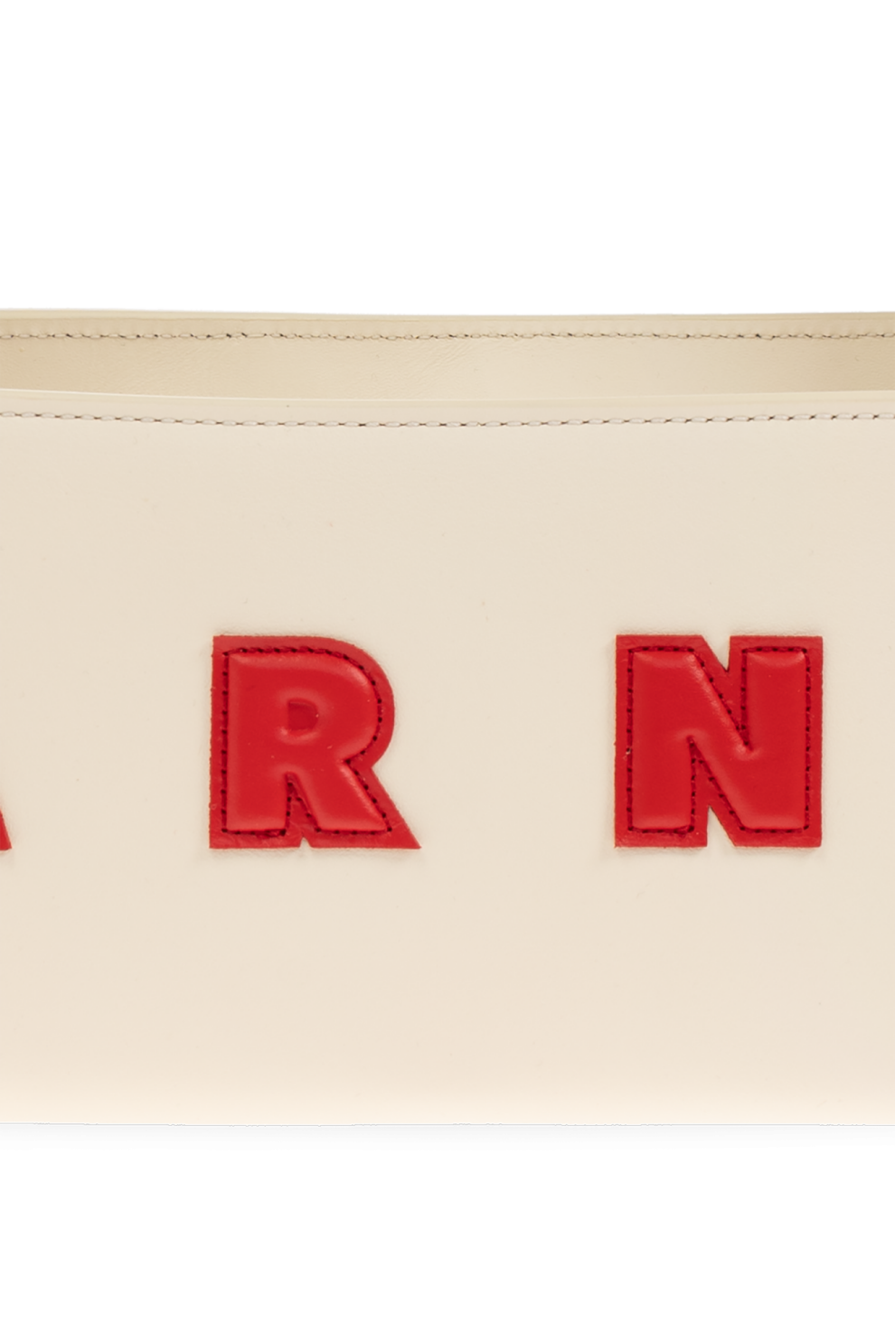 Главным акцентом становится аппликация с красным логотипом «MARNI», где каждая буква пришита вручную, подчёркивая характерную для бренда эстетику ремесленной точности и художественной свободы. Контрастная строчка превращает лаконичный дизайн в утончённое высказывание — сдержанное, но выразительное.