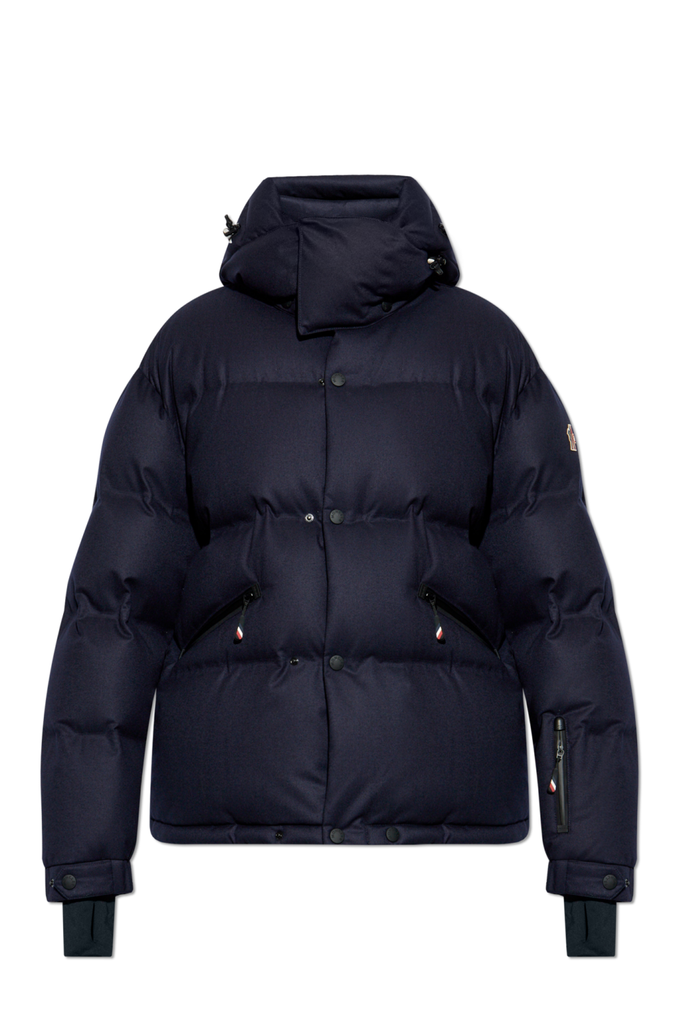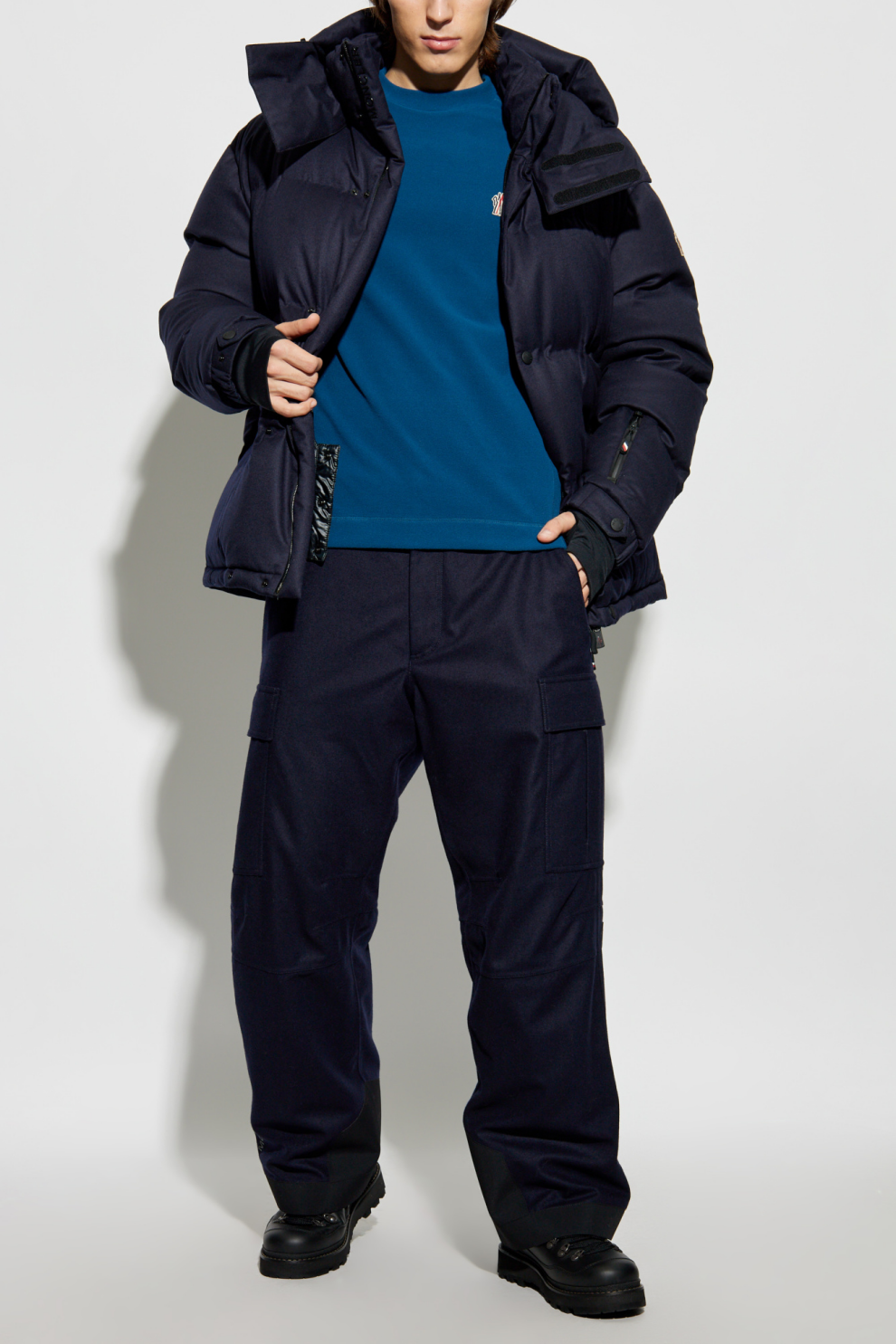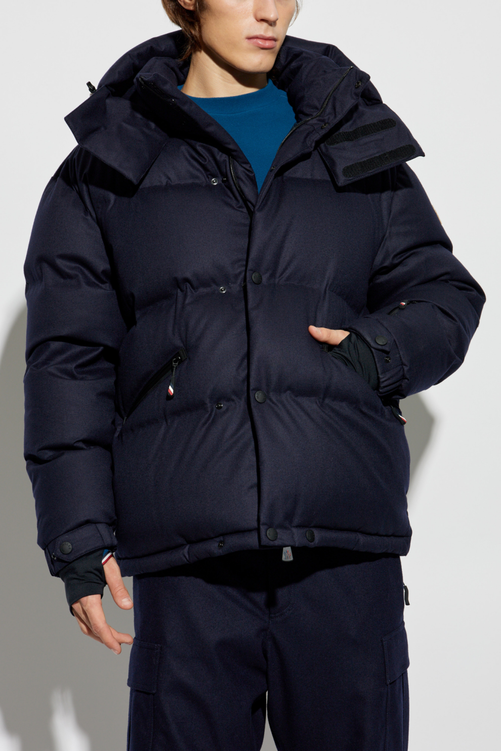 Куртка имеет большой съёмный капюшон и эластичные манжеты с прорезями для больших пальцев для комфорта и защиты от холода. Двусторонняя молния и застёжка на кнопках повышают функциональность, а боковые карманы на молнии обеспечивают надёжное хранение мелких вещей. Логотип Moncler на рукаве подчёркивает её эксклюзивный характер.