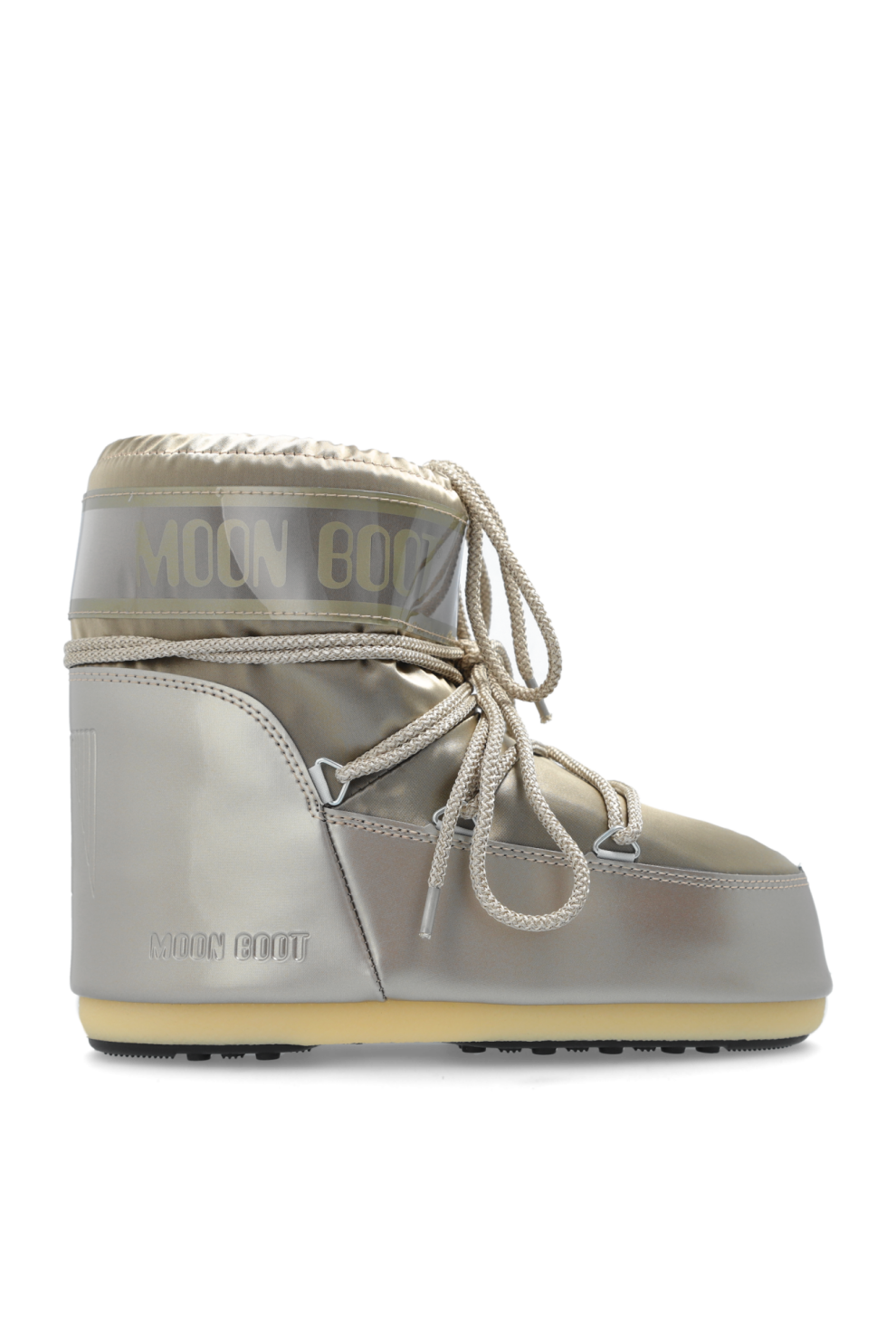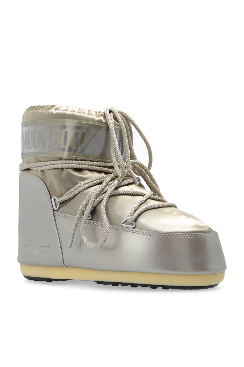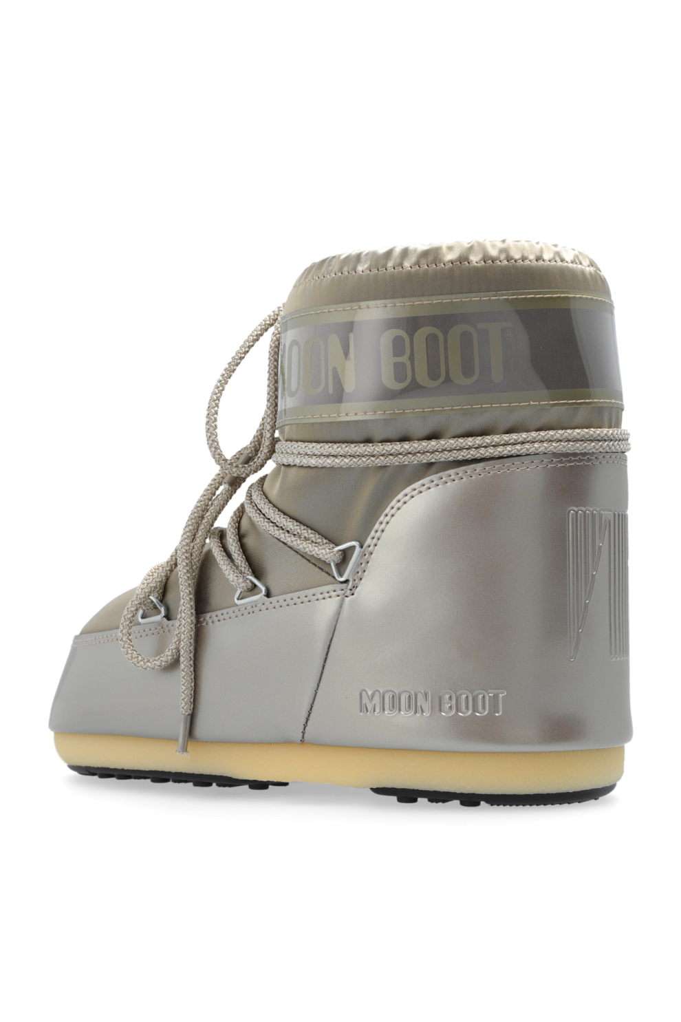 Они оснащены шнуровкой спереди на металлических люверсах для идеальной посадки, а большой логотип «MOON BOOT» на верхней части из ПВХ подчёркивает их уникальный стиль. Доминирующий цвет — медно-золотистый, что добавляет им универсальности и роскошной нотки. Прочная, нескользящая резиновая подошва обеспечивает безопасность на скользких поверхностях, а утепленная подкладка обеспечивает комфорт.