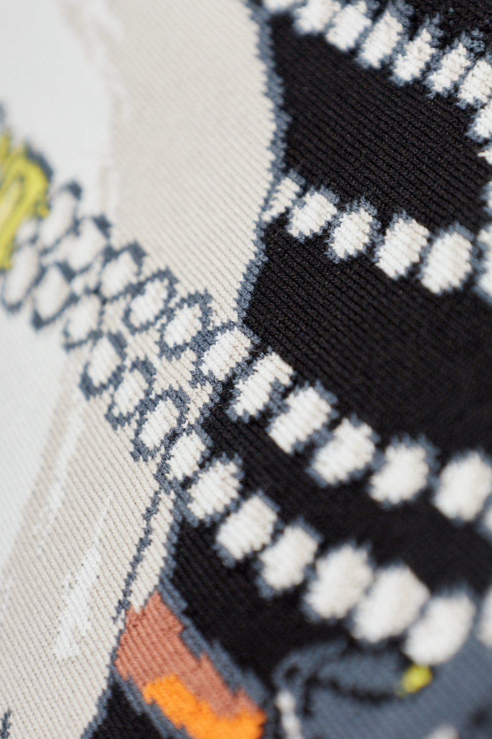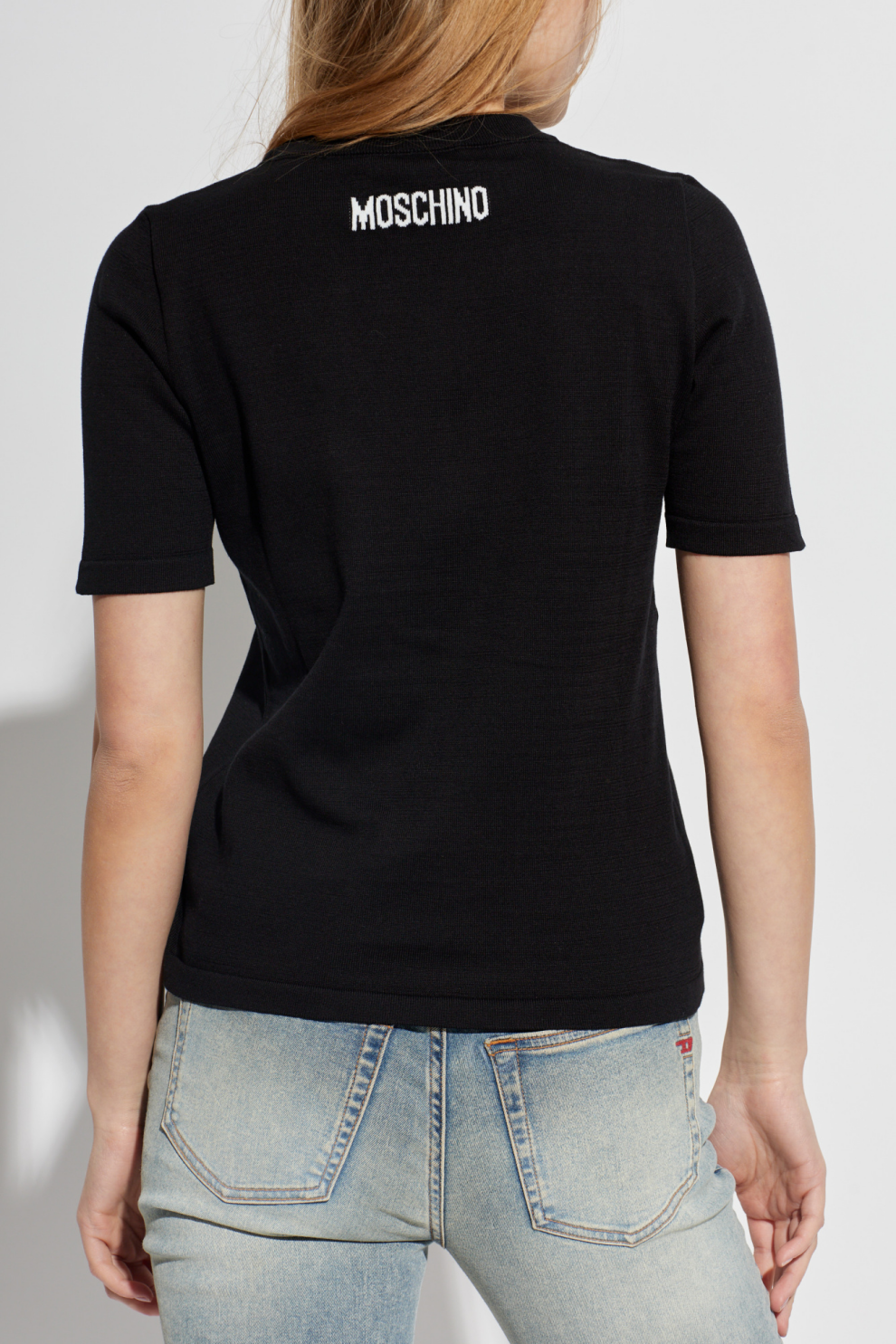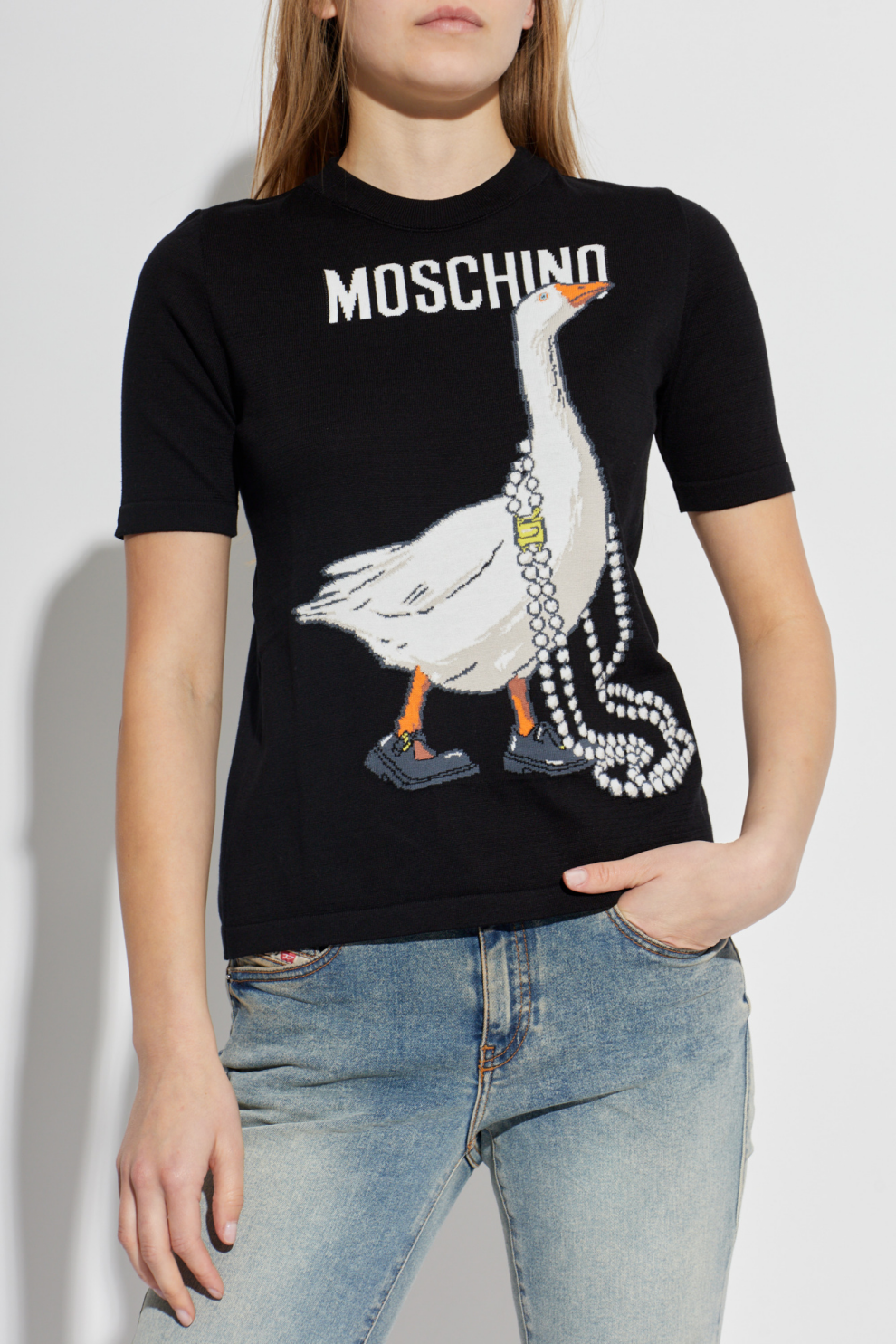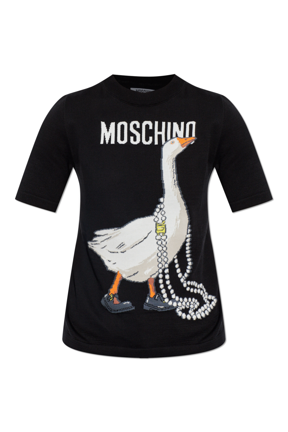 Классический дизайн с короткими рукавами и изящным круглым вырезом гармонично сочетает элегантность и современность. Черный цвет служит изысканным фоном для контрастной тканой аппликации — интригующего белого гуся, украшенного жемчужным ожерельем и туфлями. Это уникальное, художественное украшение раскрывает неповторимую, игривую сторону дизайна Moschino.