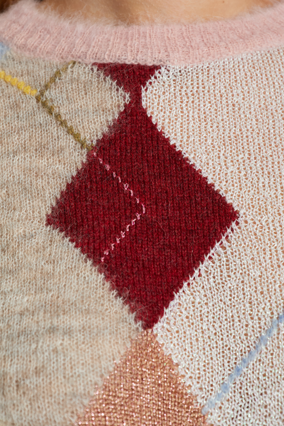 Свободный крой, округлый вырез и лаконичная форма придают изделию вневременной характер, а геометрический узор из контрастных ромбов в оттенках бежевого и чёрного создаёт выразительный, почти архитектурный ритм. Узор повторяется не только на передней части, но и на спинке и рукавах, что придаёт изделию завершённый, цельный облик.