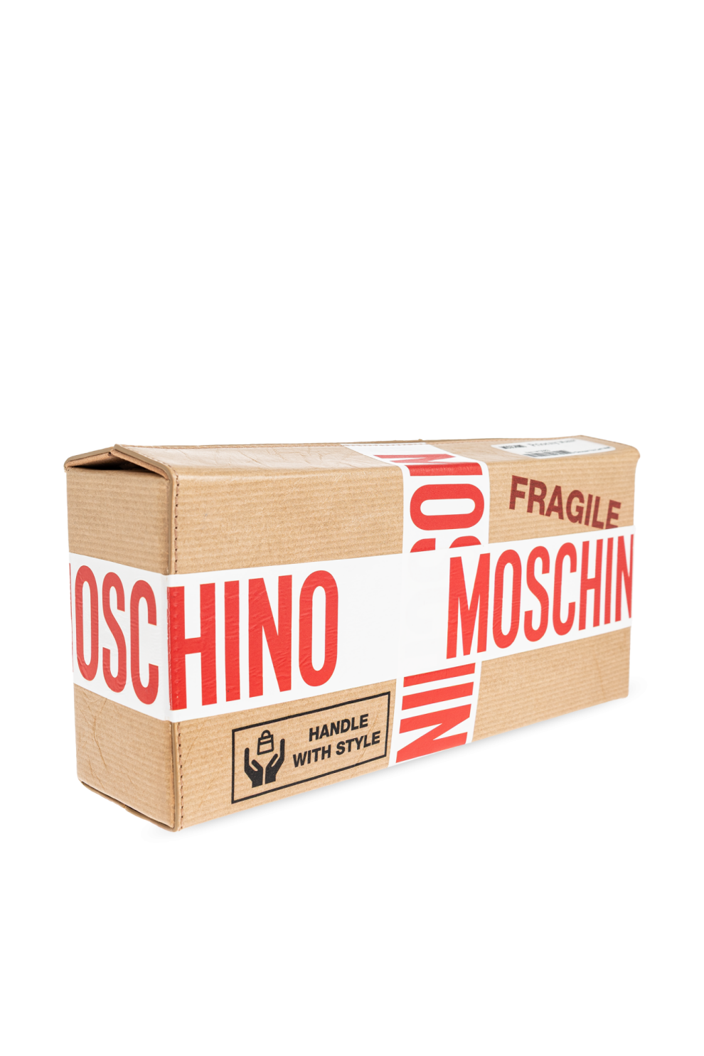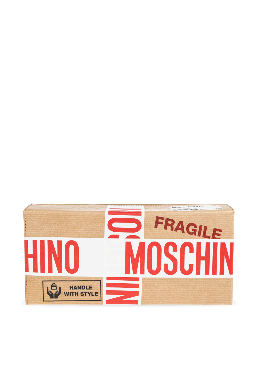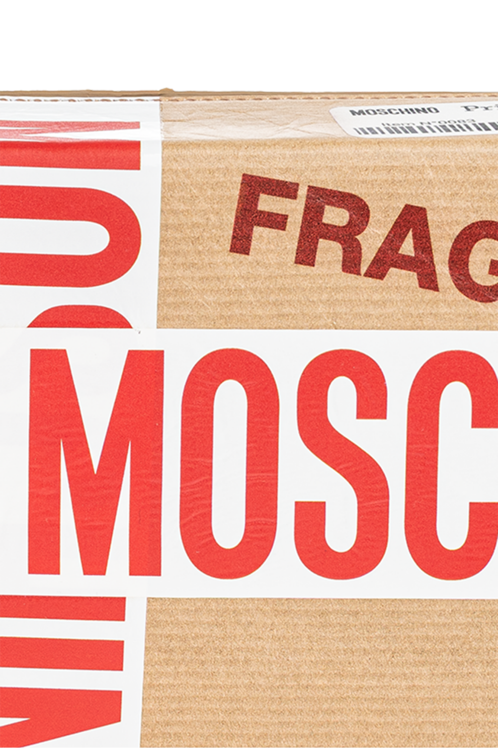 Графическое оформление становится ключевым акцентом модели: широкая белая полоса с контрастной красной надписью MOSCHINO задаёт визуальный центр композиции. Дополняют его характерные курьерские маркировки и ироничные надписи — «FRAGILE», «THIS SIDE UP», «HANDLE WITH STYLE» — превращающие аксессуар в художественное высказывание с игривым подтекстом.