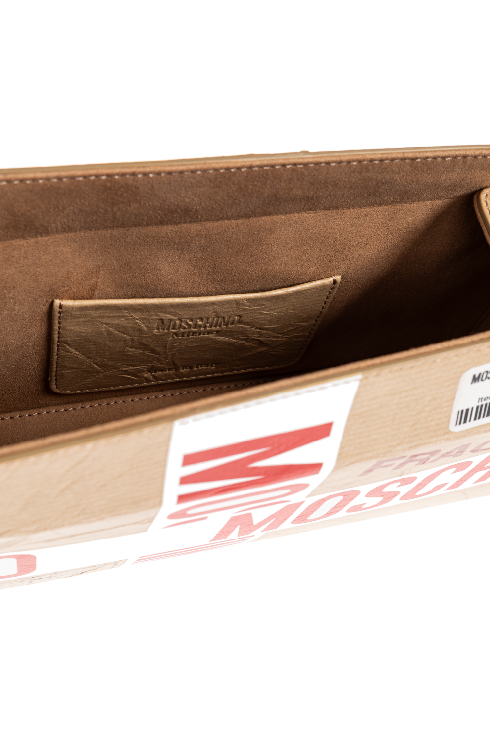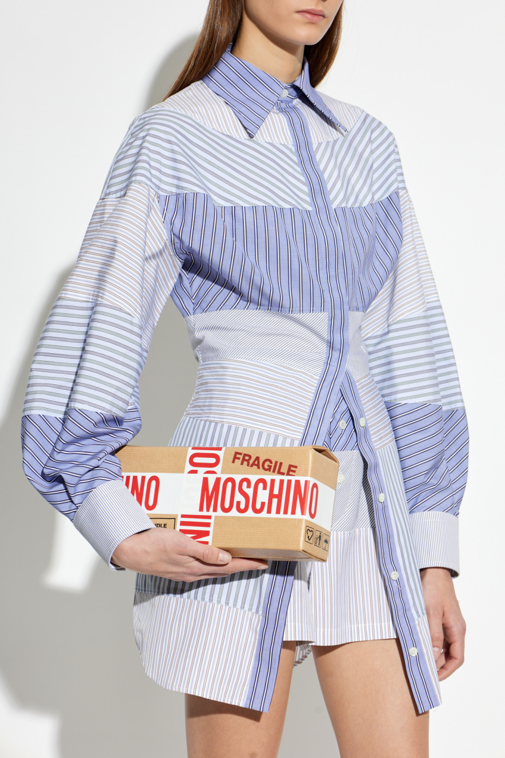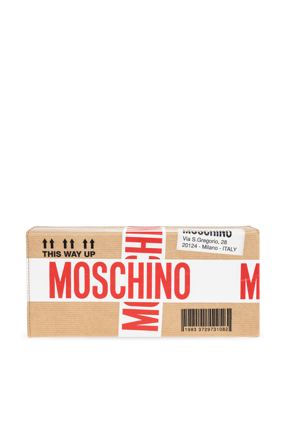 Графическое оформление становится ключевым акцентом модели: широкая белая полоса с контрастной красной надписью MOSCHINO задаёт визуальный центр композиции. Дополняют его характерные курьерские маркировки и ироничные надписи — «FRAGILE», «THIS SIDE UP», «HANDLE WITH STYLE» — превращающие аксессуар в художественное высказывание с игривым подтекстом.