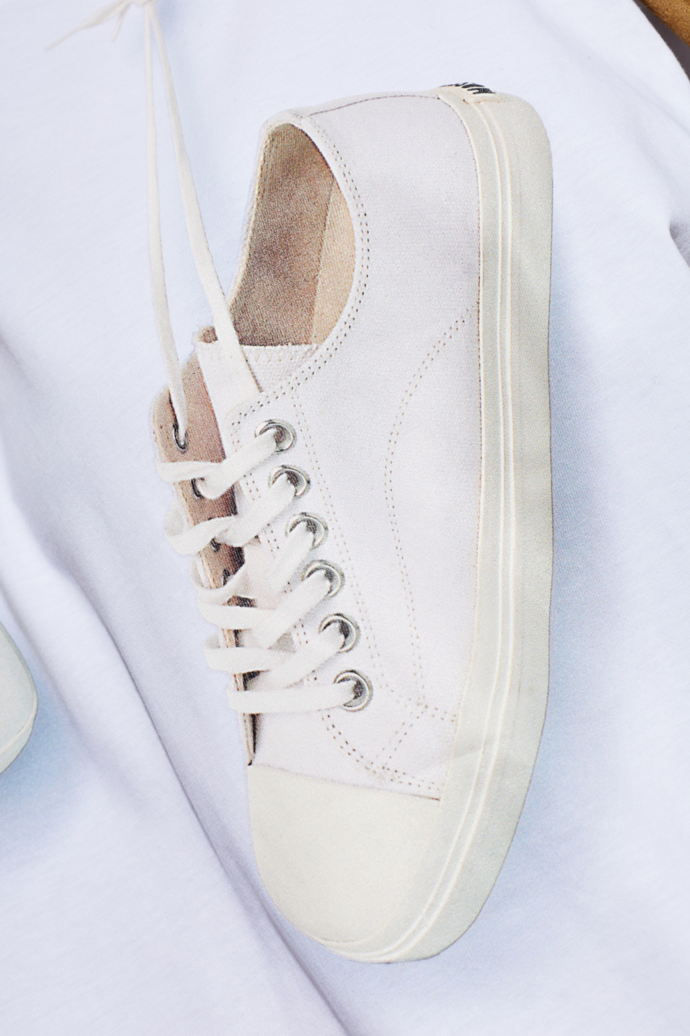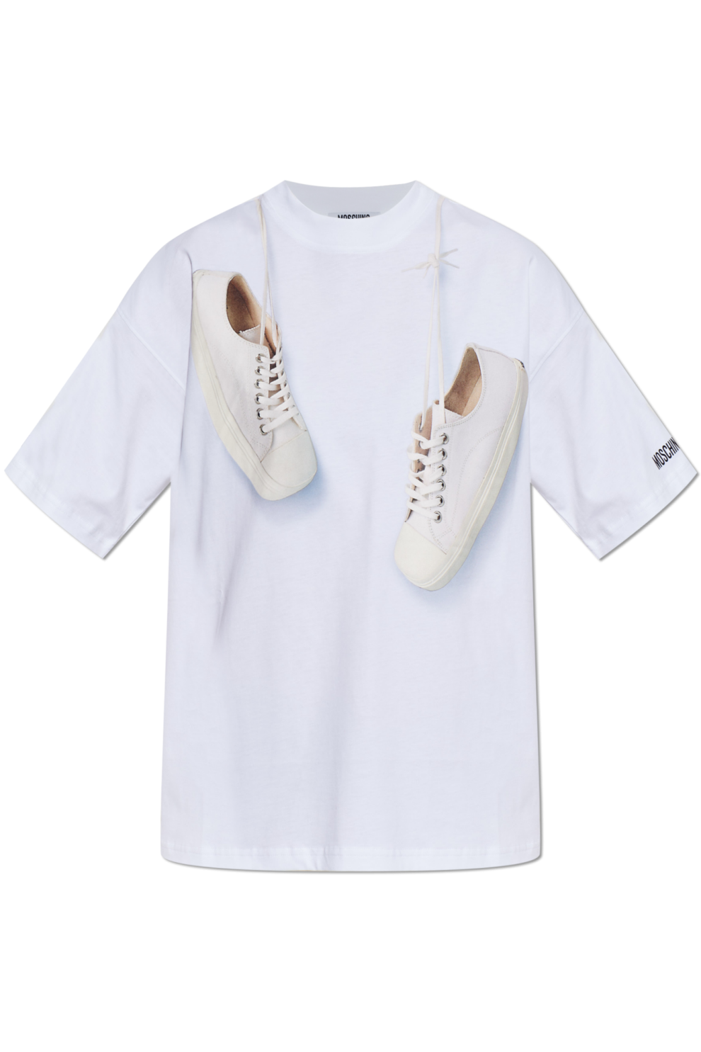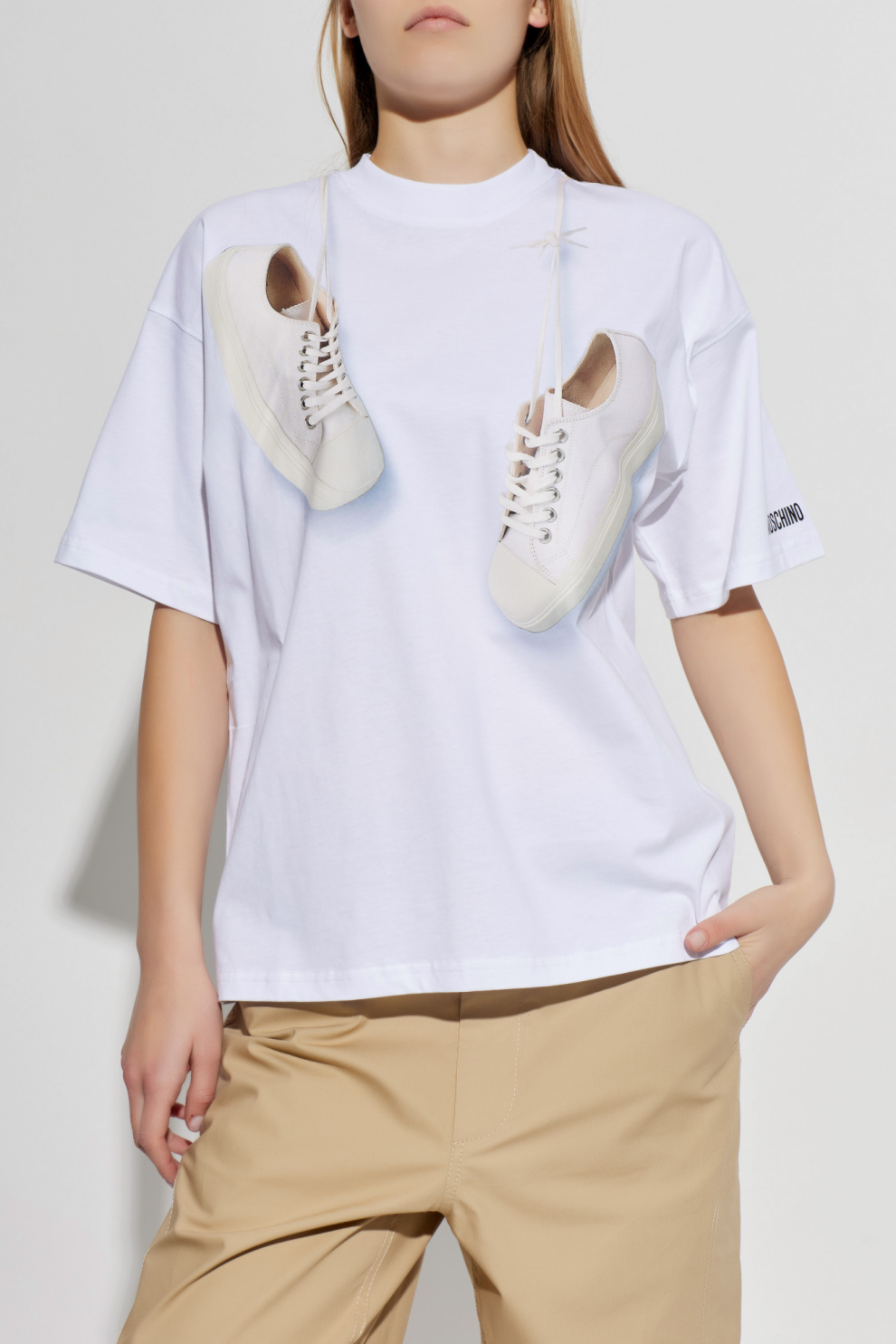 На передней части футболки расположен уникальный, замысловатый принт, изображающий белые кроссовки, висящие на шнурках, что придает футболке неповторимый, слегка бунтарский характер, соответствующий философии бренда. Спина остается простой белой, без лишних украшений, подчеркивая элегантную форму. Небольшой логотип Moschino на левом рукаве завершает образ.