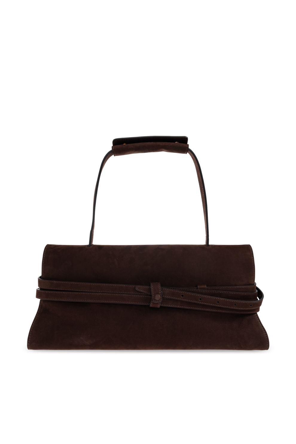 Мягкая замша премиального качества восхищает своей бархатистой текстурой и тактильной привлекательностью, отражая традиции итальянского мастерства. Центральным акцентом выступает декоративный ремешок, проходящий по всей ширине сумки и дополненный элегантной золотой пряжкой — выразительный элемент, придающий модели узнаваемый характер.