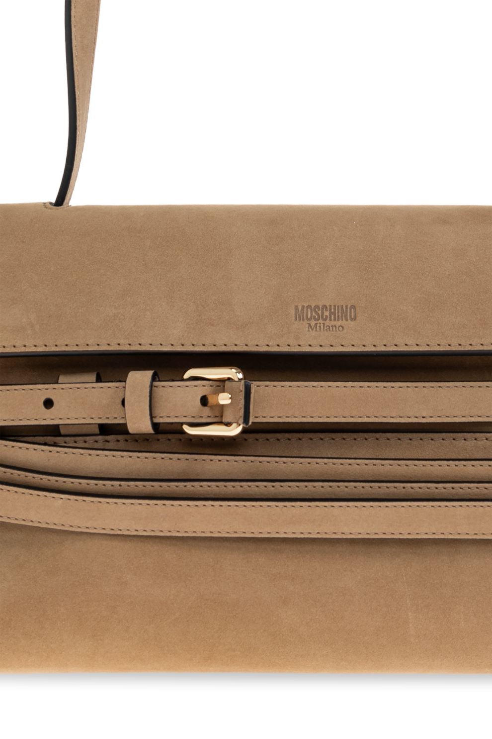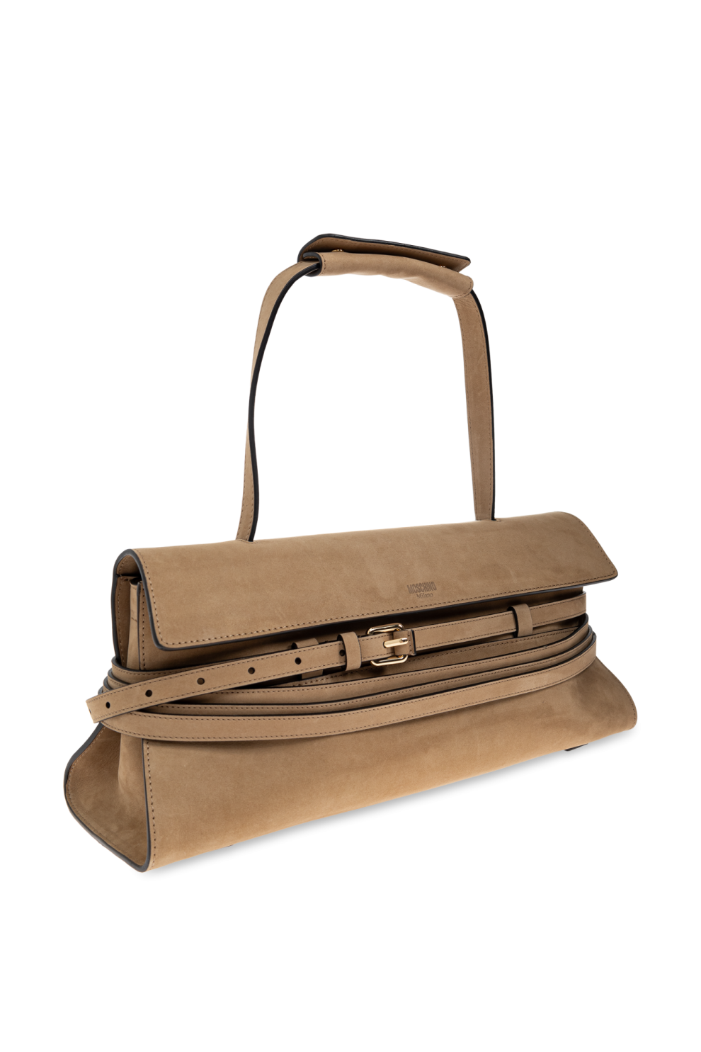 Центральным элементом дизайна выступает декоративный ремешок с выразительной строчкой и эффектной пряжкой, проходящий по всей ширине передней панели. Этот элемент не только выполняет функциональную роль, но и формирует узнаваемый визуальный акцент, раскрывая фирменный стиль Moschino.