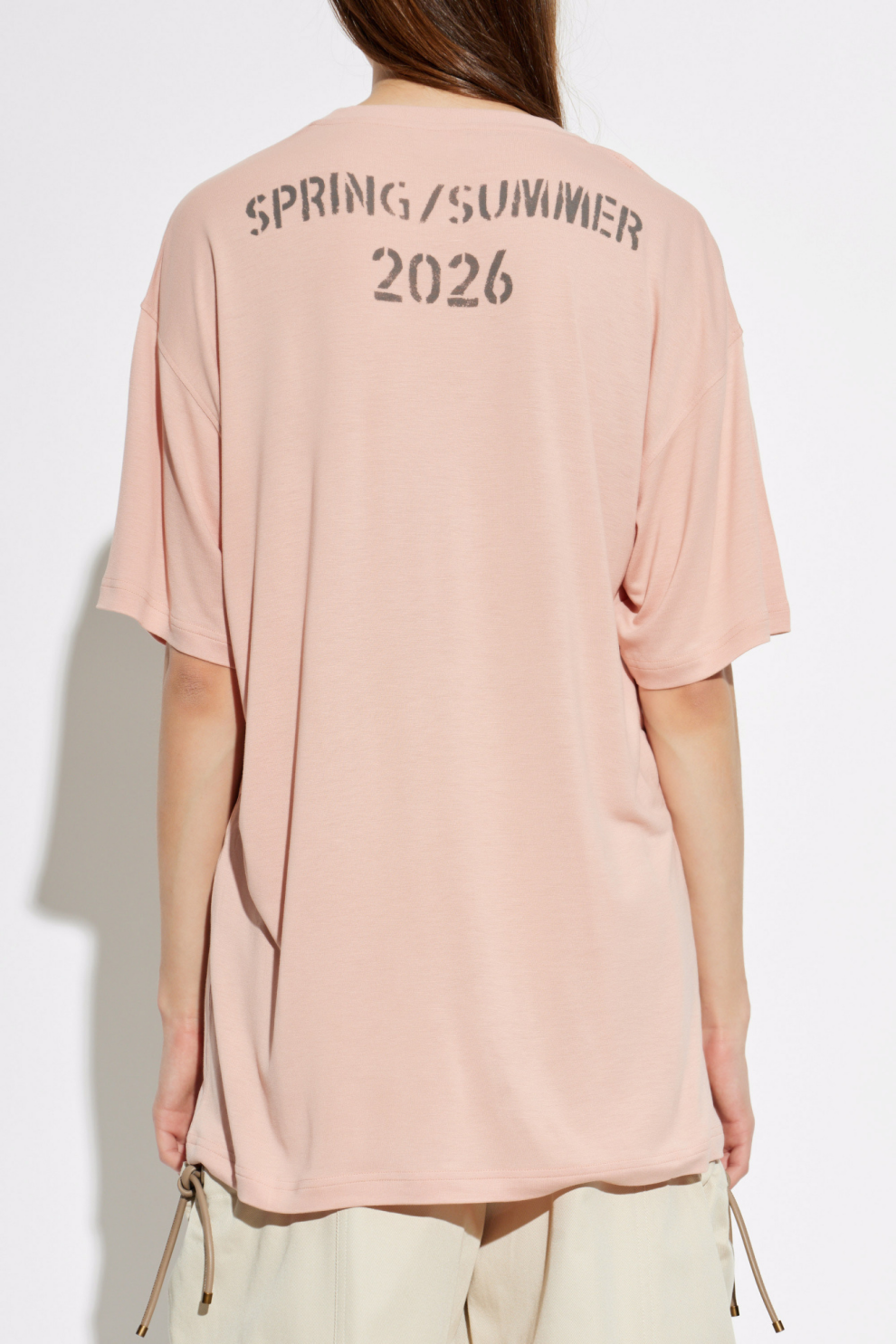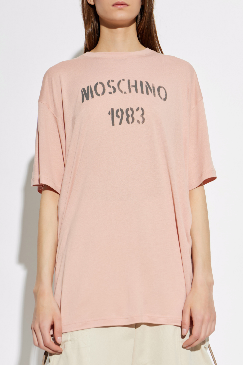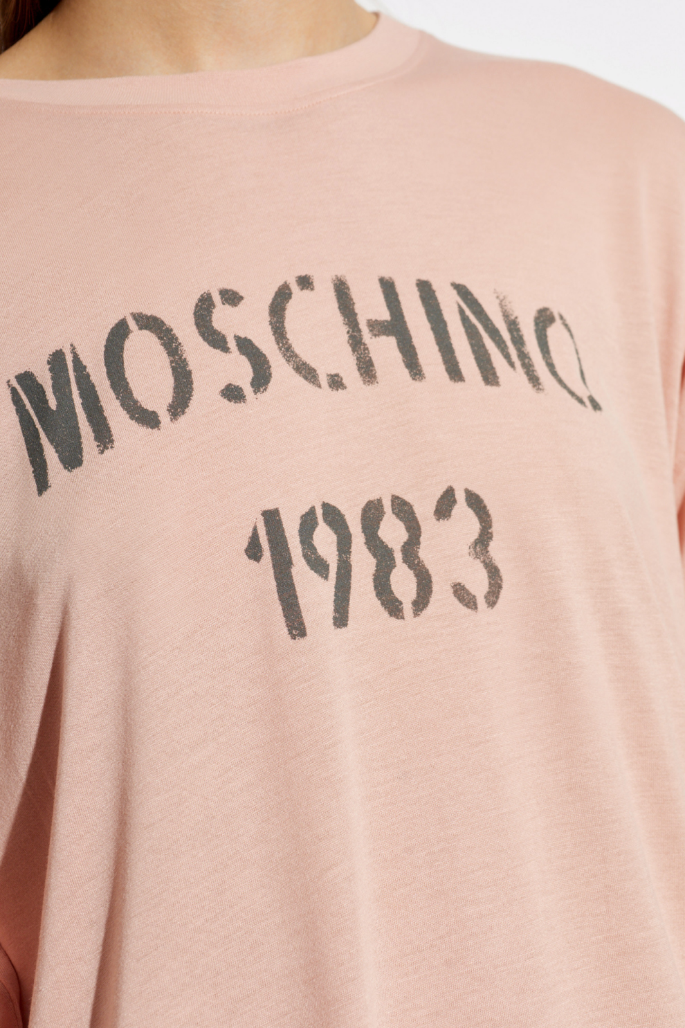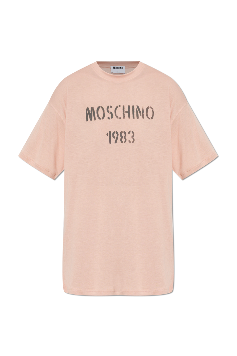 Ткань из вискозы отличается исключительной мягкостью и текучестью, приятно обволакивая фигуру и создавая ощущение лёгкости при каждом движении. На передней части расположен выразительный трафаретный принт «MOSCHINO 1983», отсылающий к наследию бренда, в то время как спинка украшена крупной графикой «SPRING/SUMMER 2026», подчеркивающей принадлежность к актуальной коллекции.