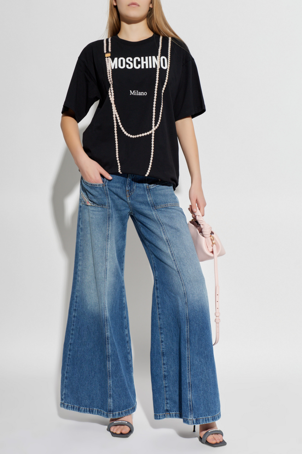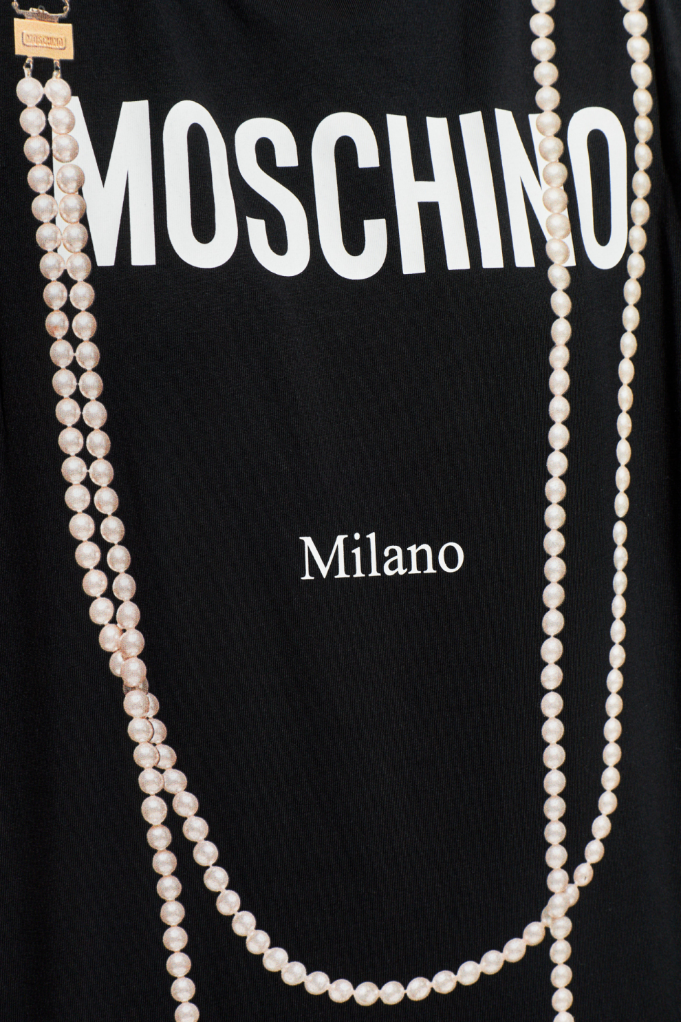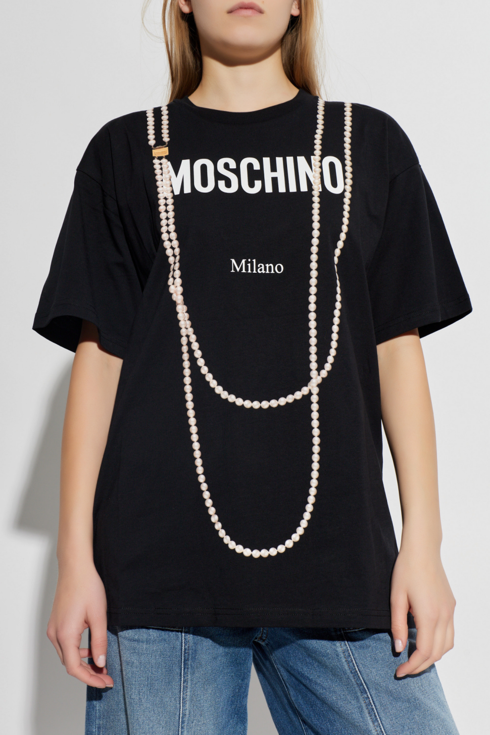 Главный акцент — крупный контрастный логотип MOSCHINO Milano, дополненный эффектным принтом, имитирующим многослойные жемчужные ожерелья. Легкое сияние «жемчуга» создает иллюзию ювелирного украшения и добавляет образу фирменную иронию и гламур, которыми славится Дом Moschino.