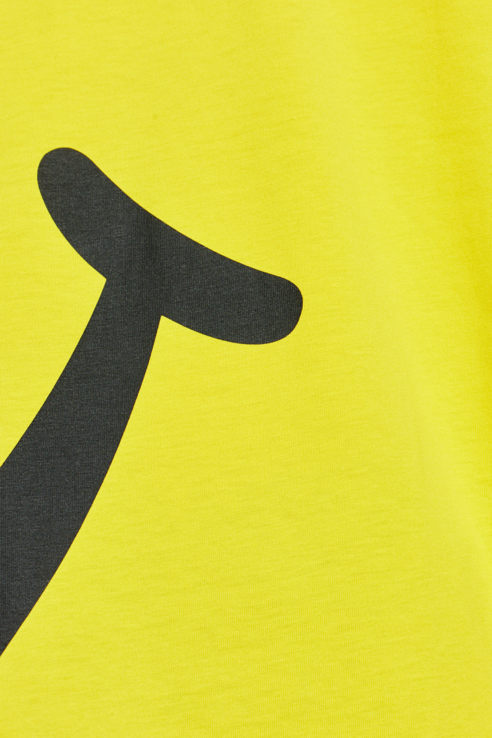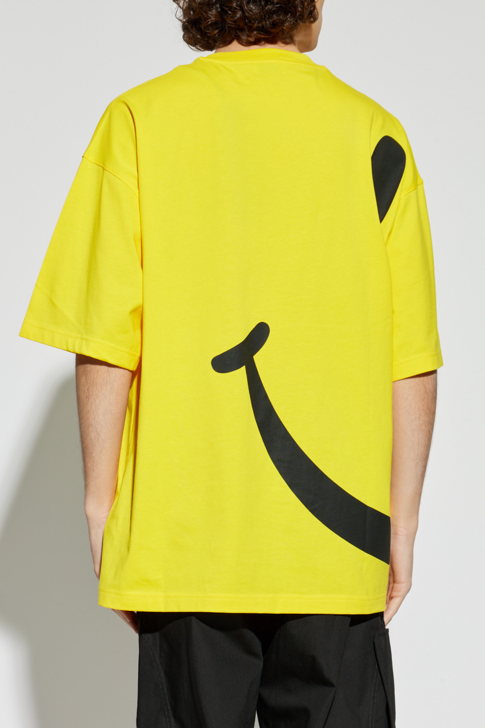 Эта мужская футболка Moschino x Smiley — смелое высказывание на пересечении моды, искусства и поп-культуры. Солнечный желтый оттенок становится идеальным холстом для культового, фрагментированного мотива Smiley: графическая черная дуга и выразительный эллиптический глаз эффектно переходят с передней части на спину, создавая динамичную композицию с ощущением движения и ироничной экспрессии.