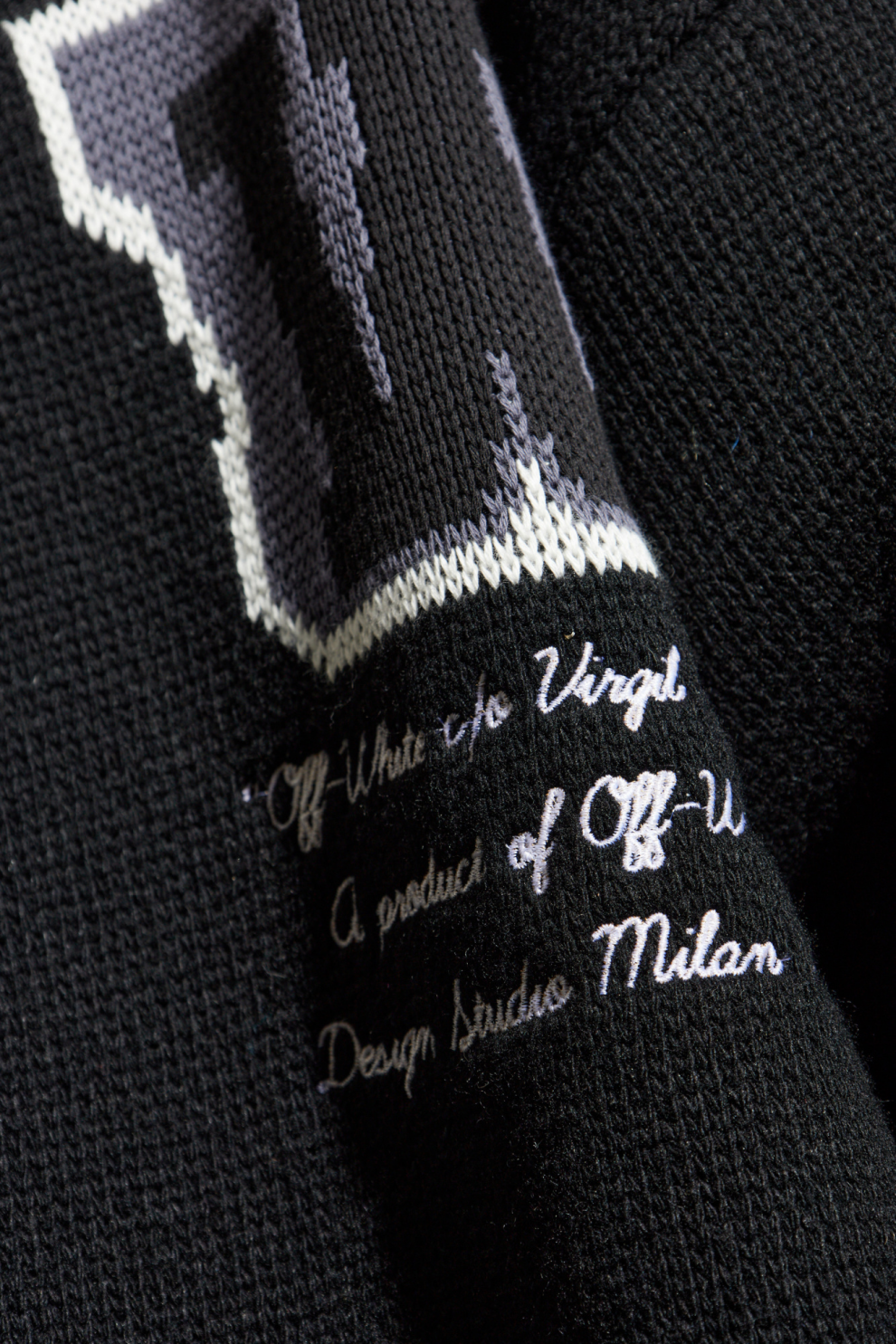 Глубокий чёрный цвет становится идеальным фоном для выразительных деталей: крупной вышивки в виде буквы “V” на груди и графических надписей на рукавах — “Off-White c/o Virgil” и “Design Studio Milan”. Эти элементы создают визуальную динамику и подчёркивают концептуальный стиль бренда, где каждый штрих имеет смысл.