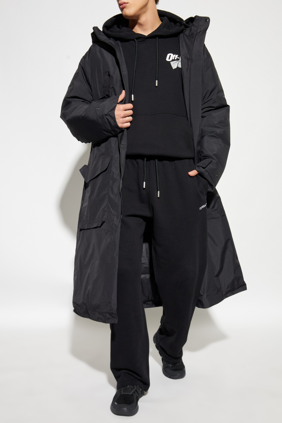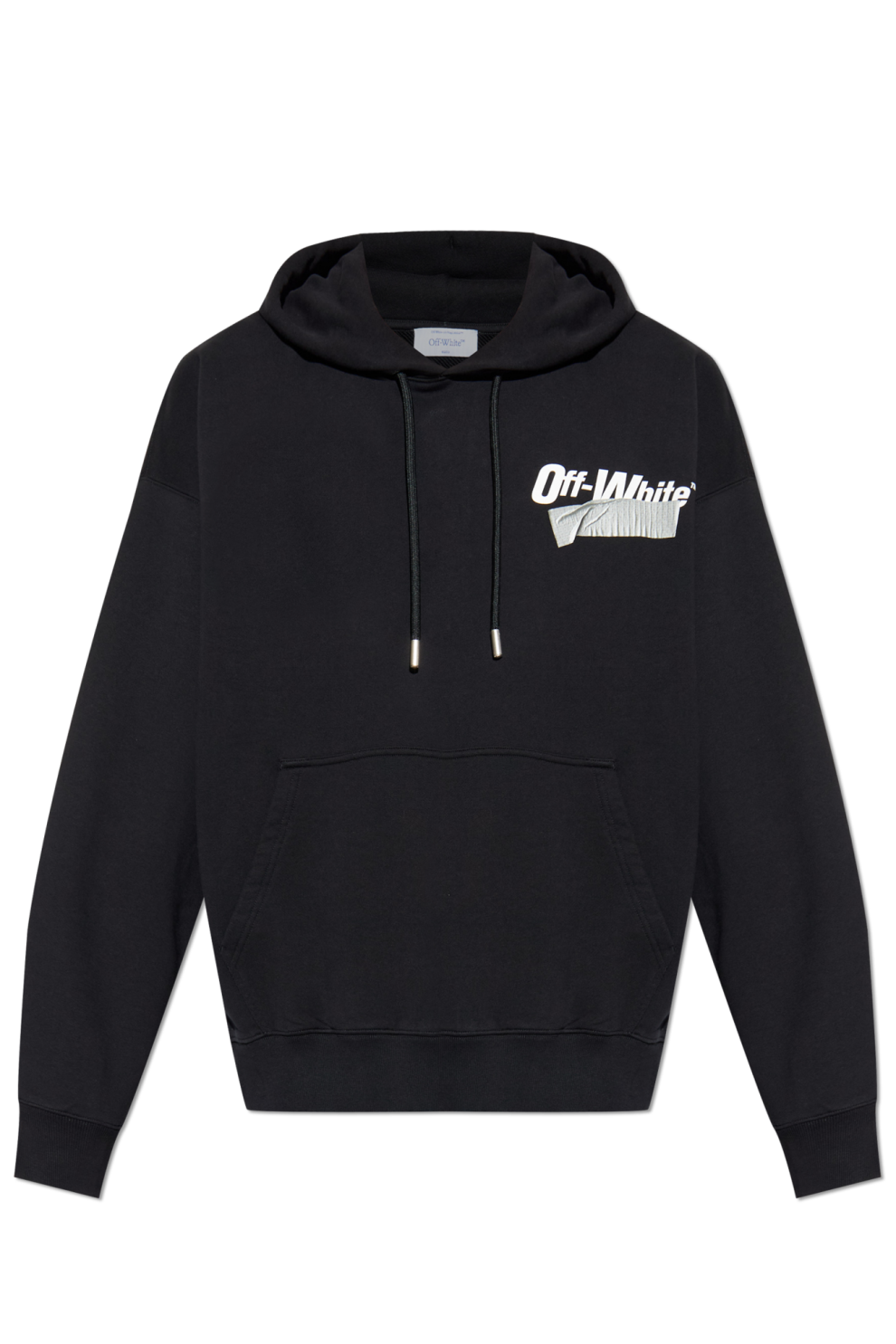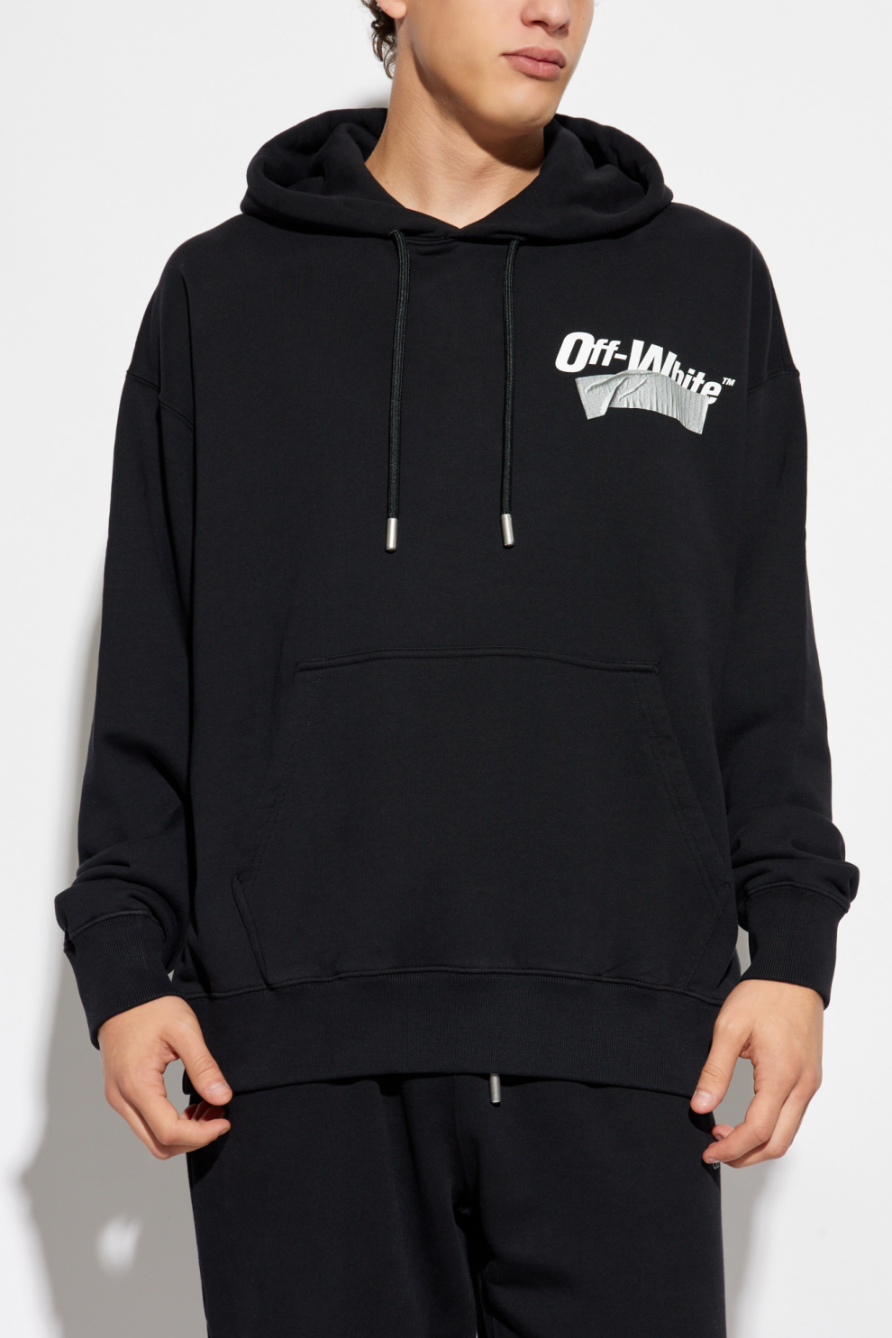 Мужская толстовка Off-White – воплощение минималистичной элегантности и изысканного кроя. Чёрная ткань подчёркивает индустриальный характер и универсальность свободного кроя, обеспечивающего свободу и комфорт. Регулируемый капюшон с чёрными шнурками с металлическими наконечниками гармонично дополняет дизайн, а вместительный карман-кенгуру добавляет практичности.