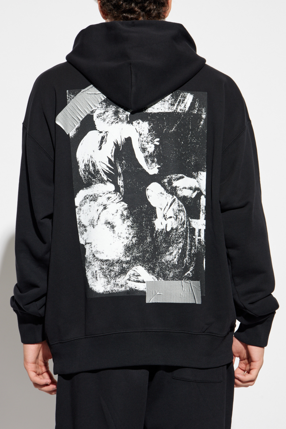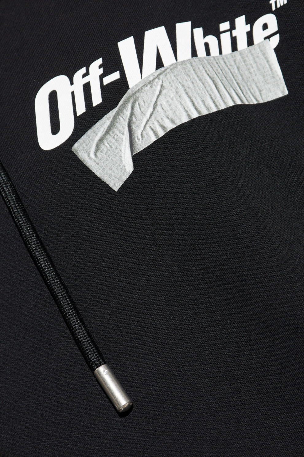 Уникальные детали поражают воображение: белый логотип «Off-White», частично скрытый серым принтом в виде клейкой ленты, украшает левую сторону груди — тонкий намёк на современный минималистичный дизайн. Спина толстовки украшена художественным чёрно-белым принтом, придающим каждой модели неповторимый характер. Широкие эластичные манжеты обеспечивают идеальную посадку и комфорт.