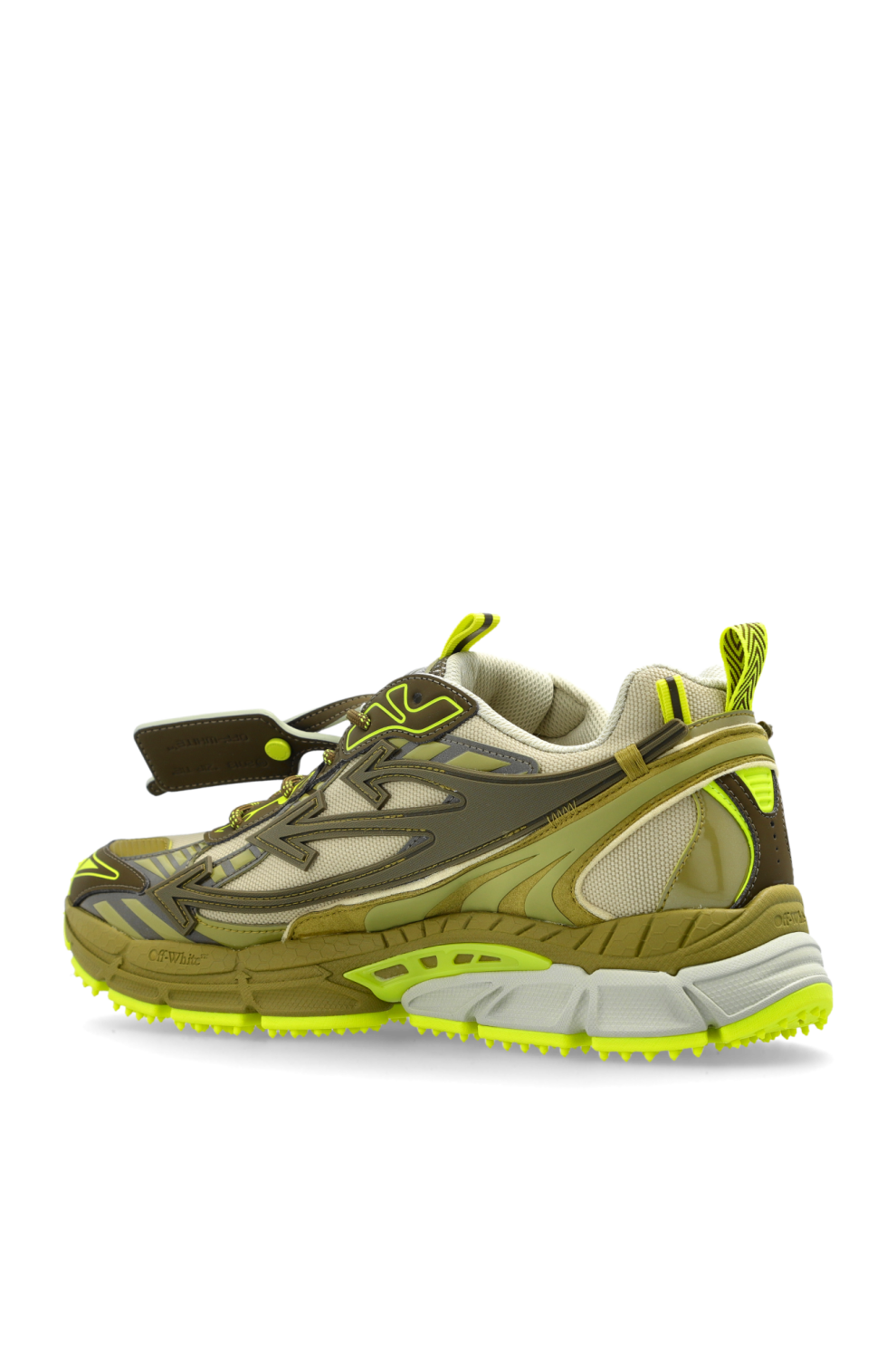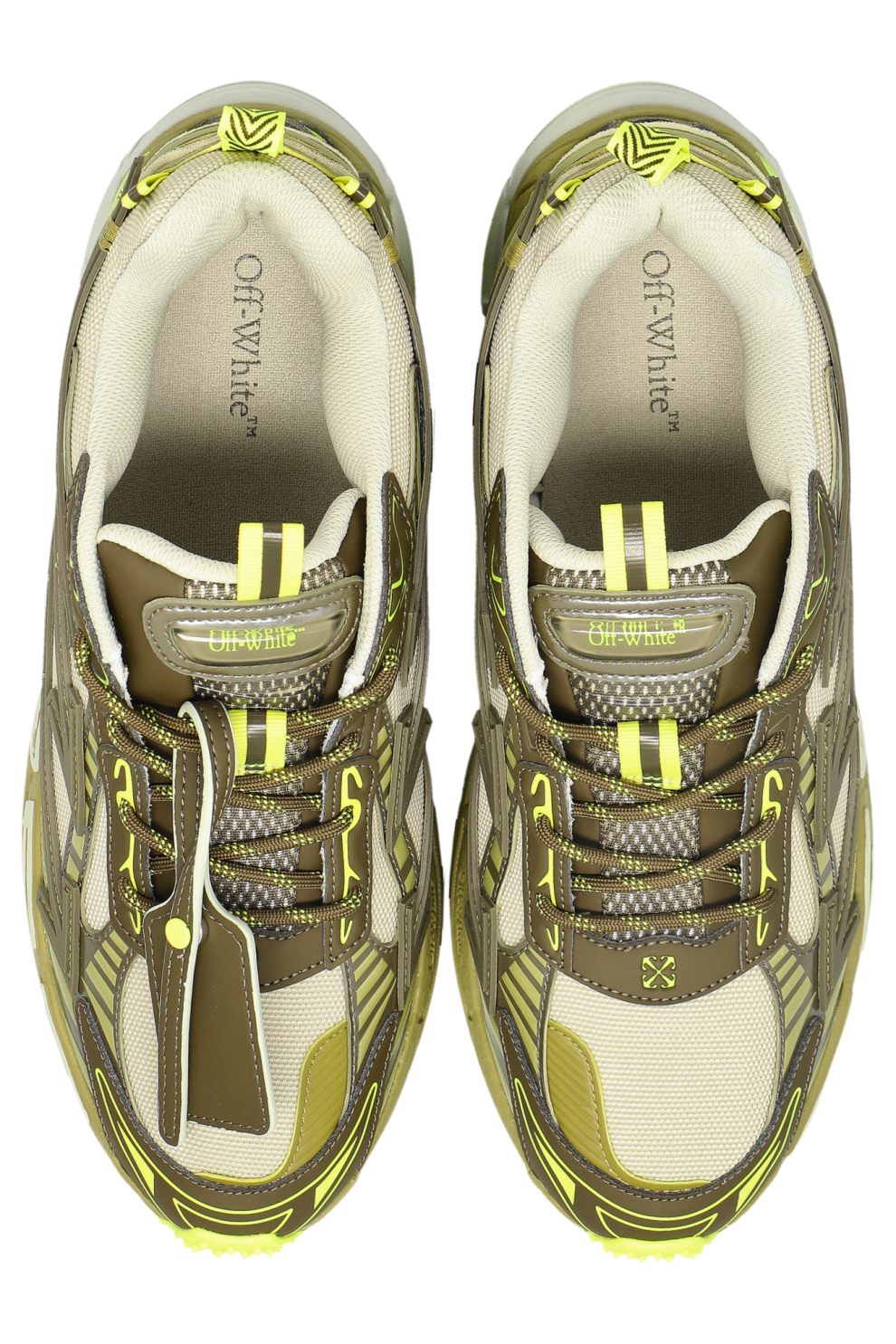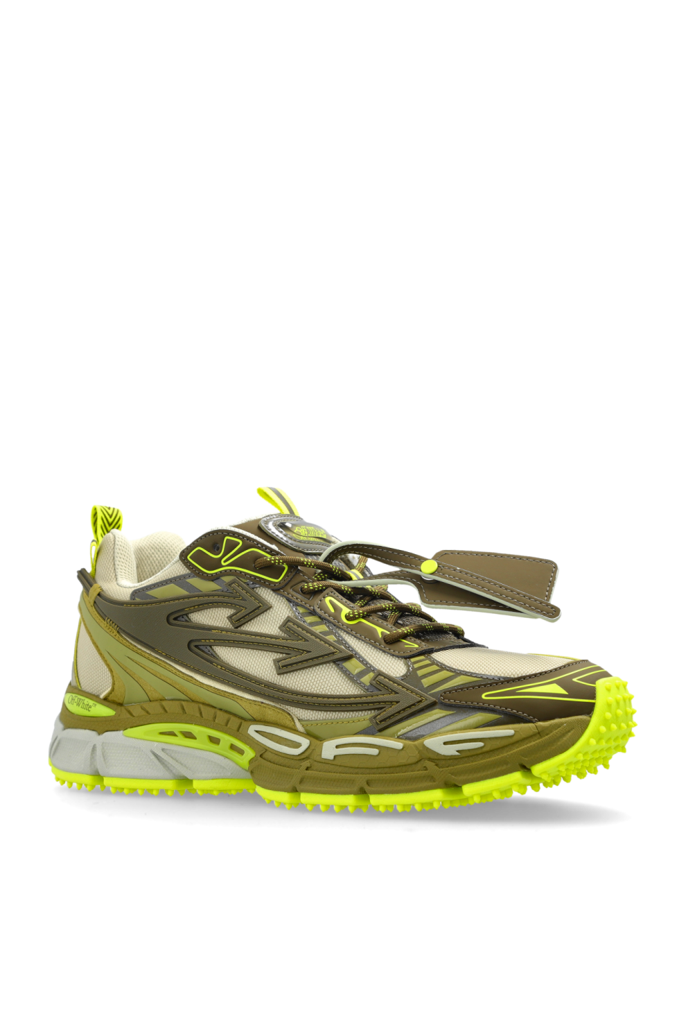 Верх выполнен из дышащей сетки, стратегически усиленной вставками из ткани, кожи и синтетического материала, что обеспечивает исключительную прочность и комфорт в течение всего дня. Кроссовки отличаются многослойным дизайном : геометрические линии и зелёные акценты , разбавленные неоново-жёлто-зелёными деталями, идеально притягивают взгляд. Внутренняя часть украшена принтом «Off-White™», а язычок украшен характерным логотипом — тонкий диалог уличной моды и роскоши.