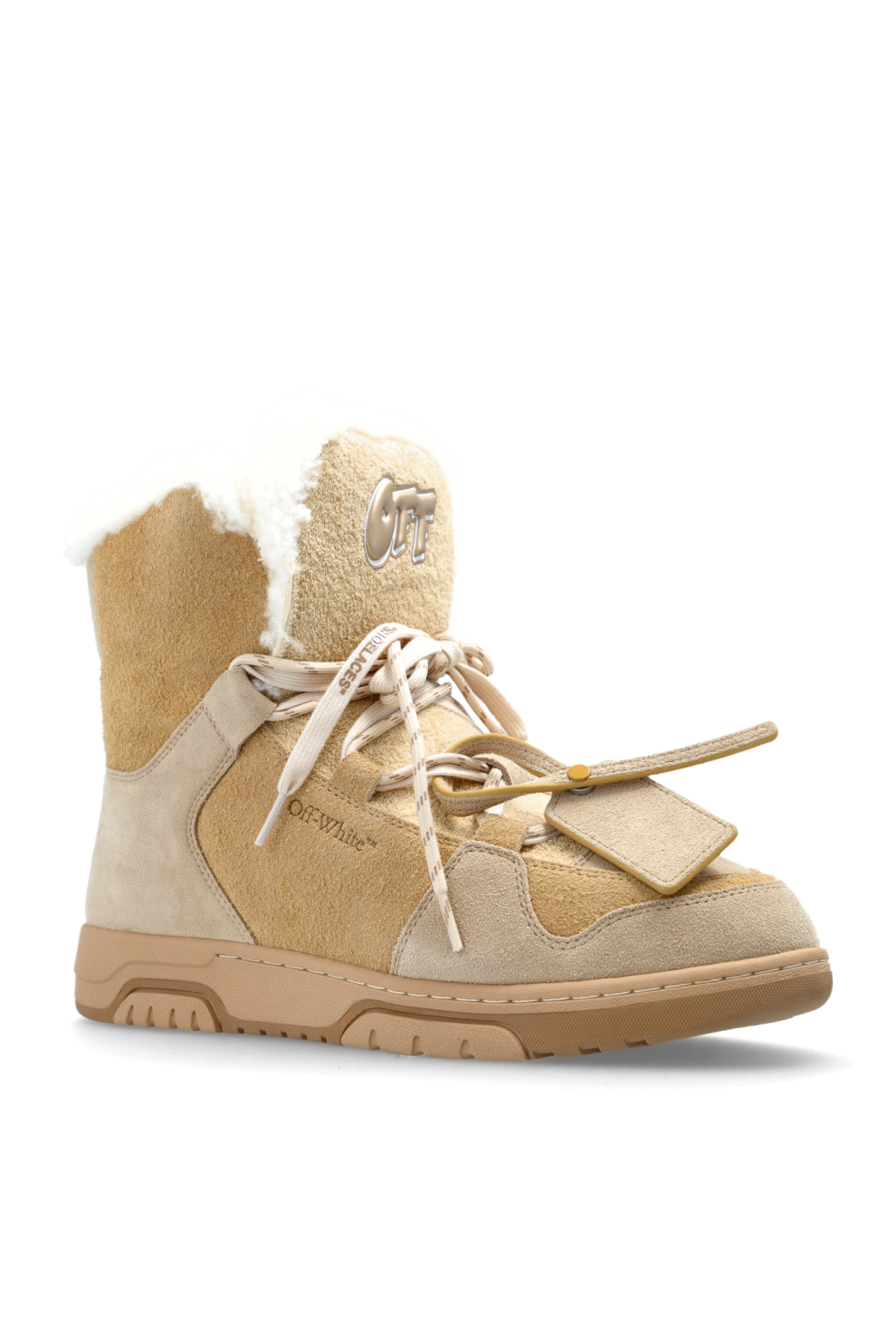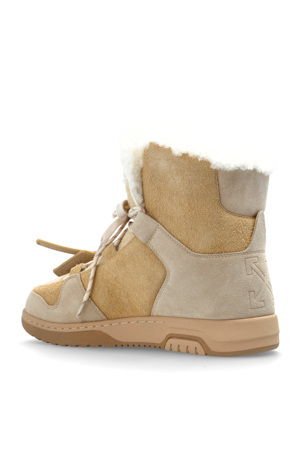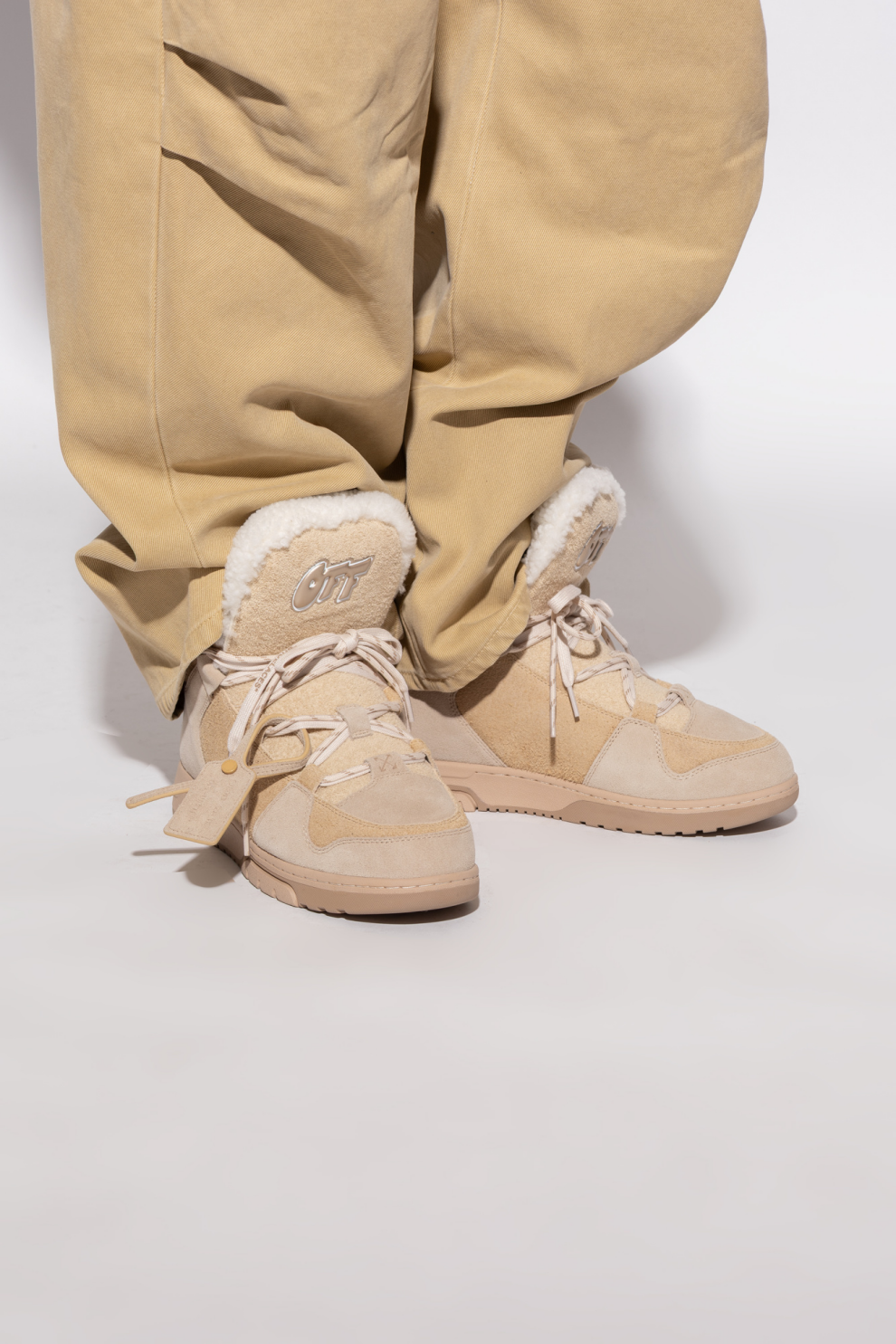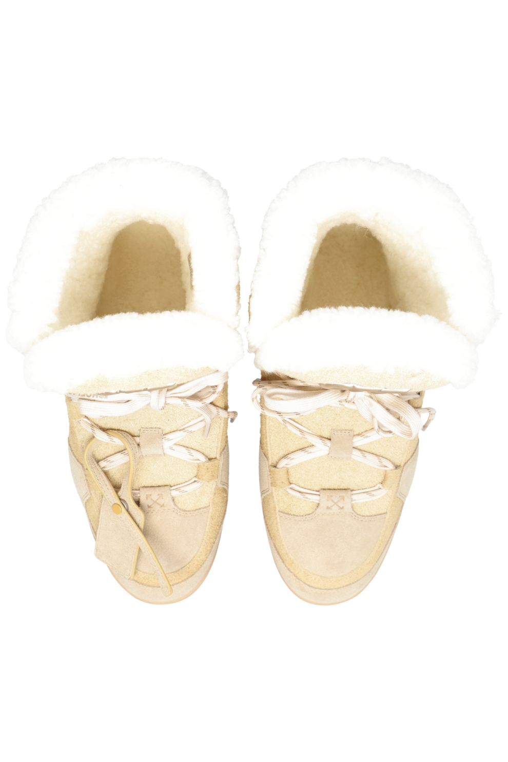 Off-White — замшевые сноуботинки из зимней коллекции — синоним изысканной элегантности и современного мастерства. Модель выполнена из отборной бежевой замши с благородным матовым блеском, создающей ощущение утончённости и структурной строгости.