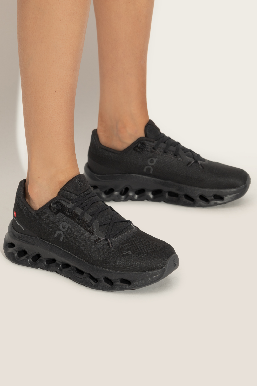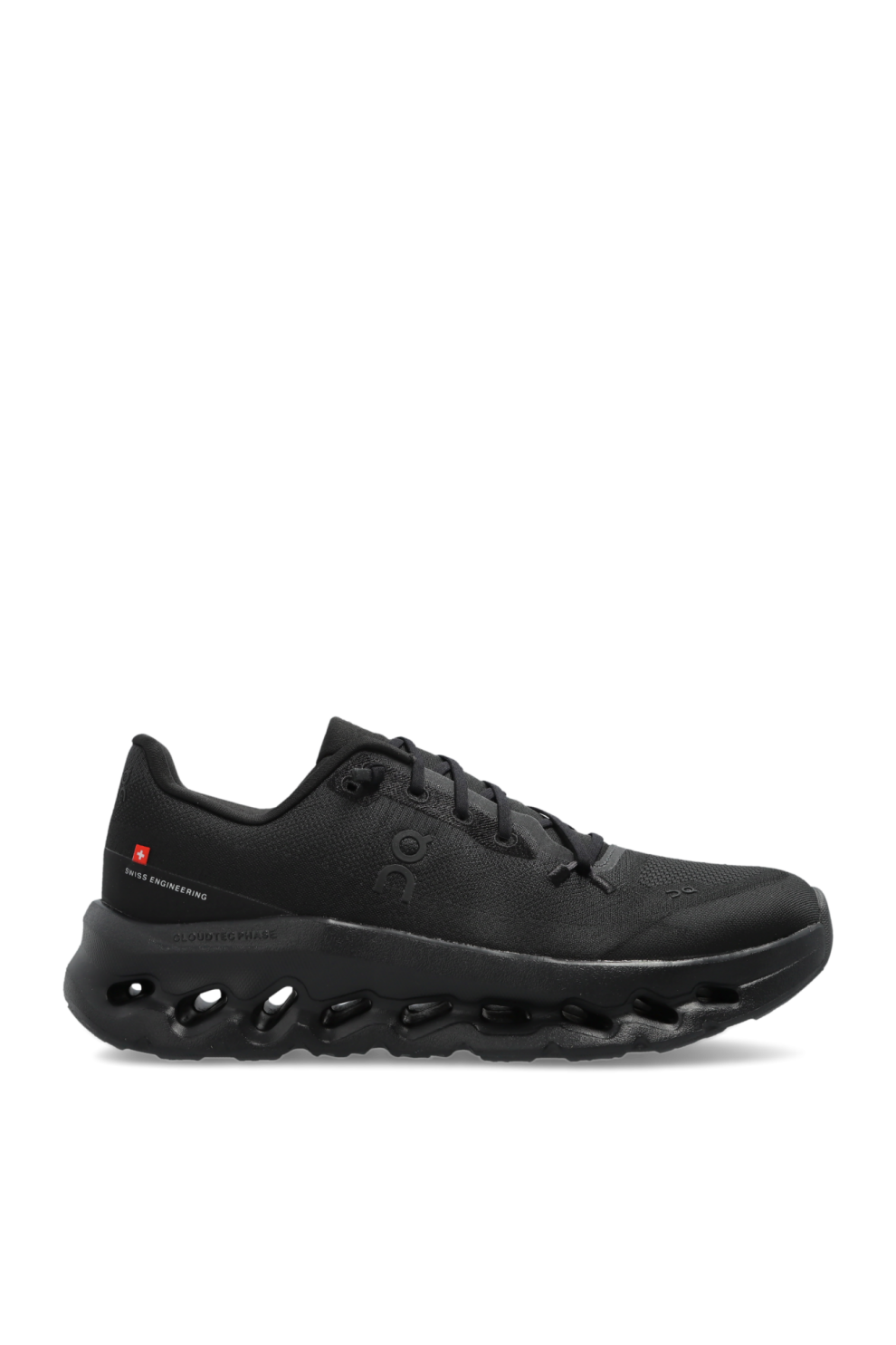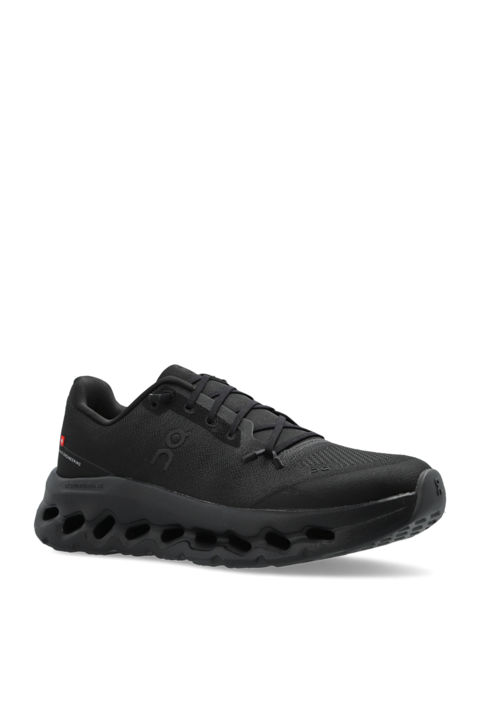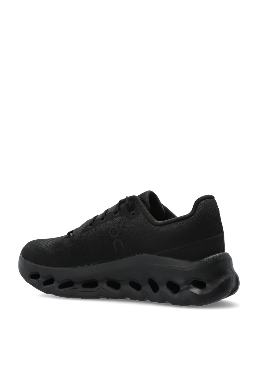 Верх выполнен из дышащей текстильной сетки, усиленной синтетическими вставками в области пятки и шнуровки, что гарантирует лёгкость, комфорт и долговечность. Однотонный чёрный цвет пары подчёркивает минималистичный стиль, а перфорации на носке повышают вентиляцию. Контрастный крупный логотип ON на боковой панели и язычке добавляет характер и узнаваемость.