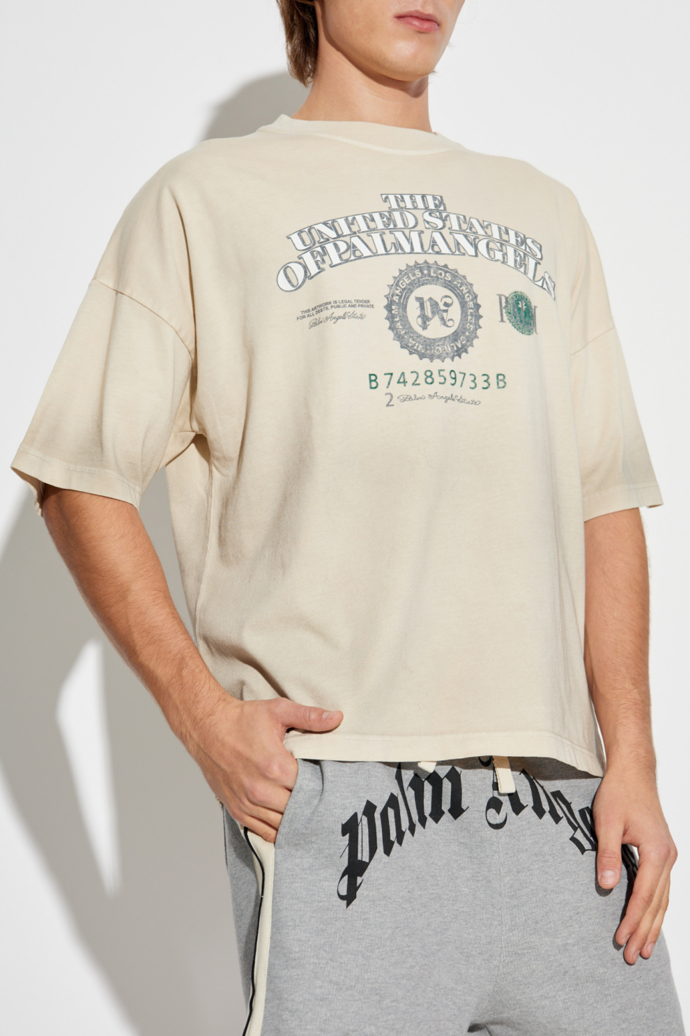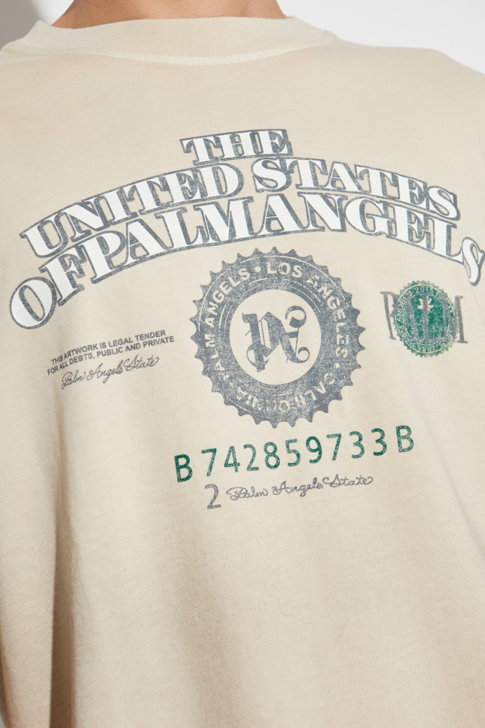 Мягкий высококачественный кремовый хлопок идеально дополняет изысканный принт – уникальные надписи и эмблемы в оттенках серого, зелёного и чёрного создают эффектный визуальный акцент. Наиболее привлекательная деталь – стилизованная надпись «THE UNITED STATES OF PALM ANGELS» и центральный логотип «P» с декоративной рамкой. Круглая графика с зелёной деталью подчёркивает эксклюзивность дизайна.