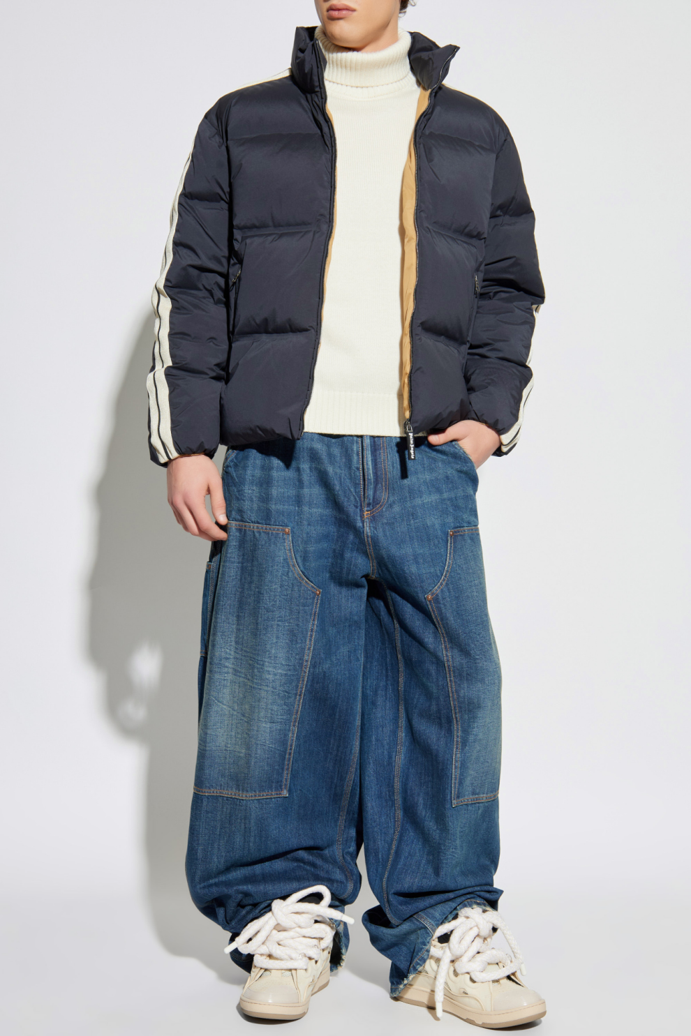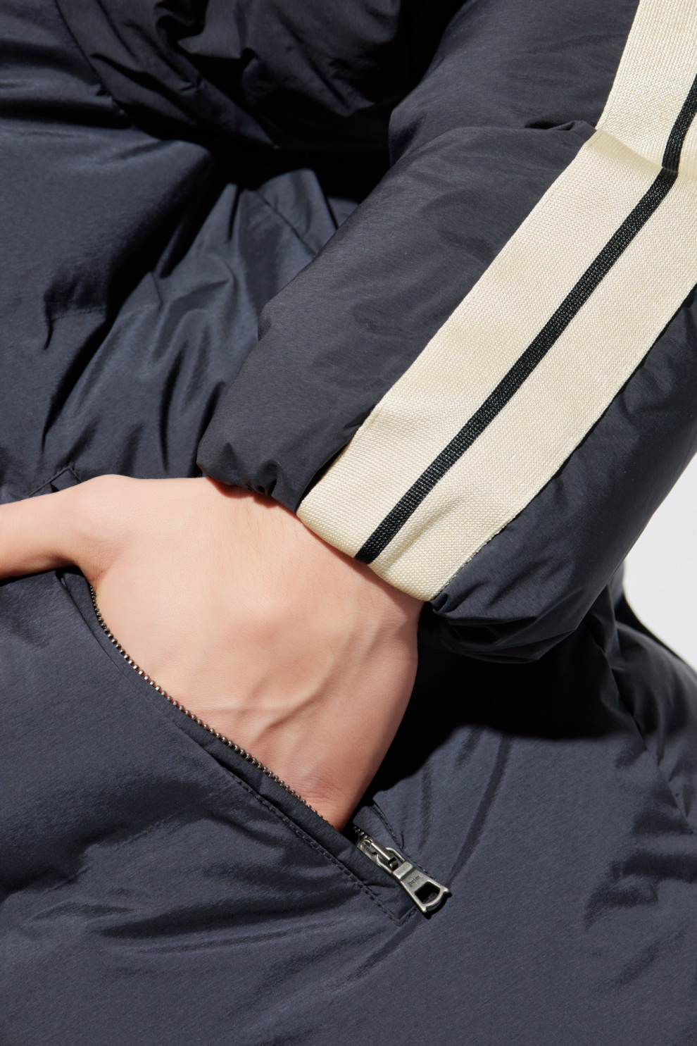 Куртка выполнена в однотонном темно-синем цвете. Яркие кремовые полосы с тонкими чёрными линиями на плечах создают уникальный контрастный мотив. Высококачественный технический материал с лёгким блеском обволакивает мягкий пух, гарантируя комфорт даже в самые холодные дни.