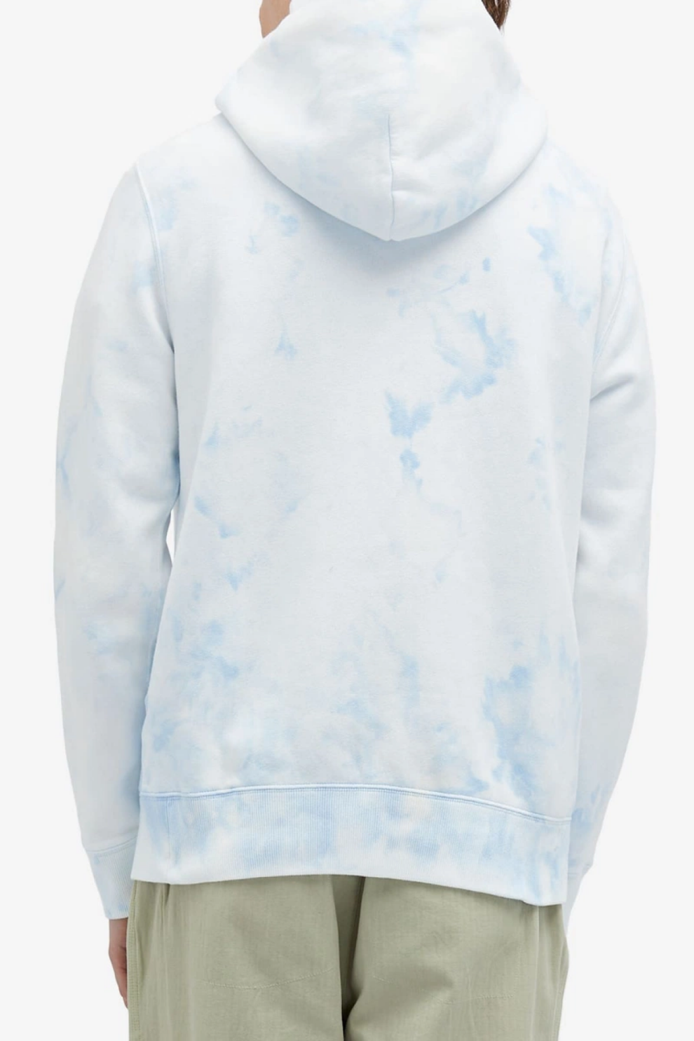 Худи выполнено из мягкого смесового хлопкового джерси с уникальной отделкой tie-dye, вручную окрашенной в оттенки голубого и белого — словно небо с лёгкими облаками. Каждый экземпляр окрашен индивидуально, поэтому рисунок окраски на каждой модели неповторим.