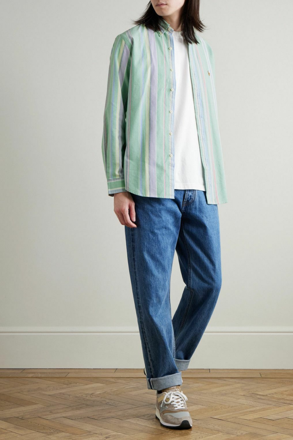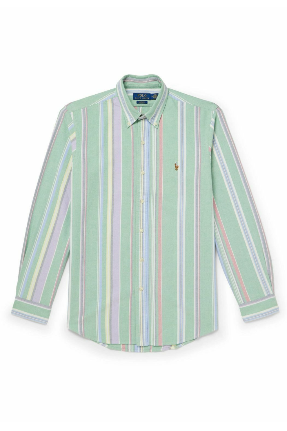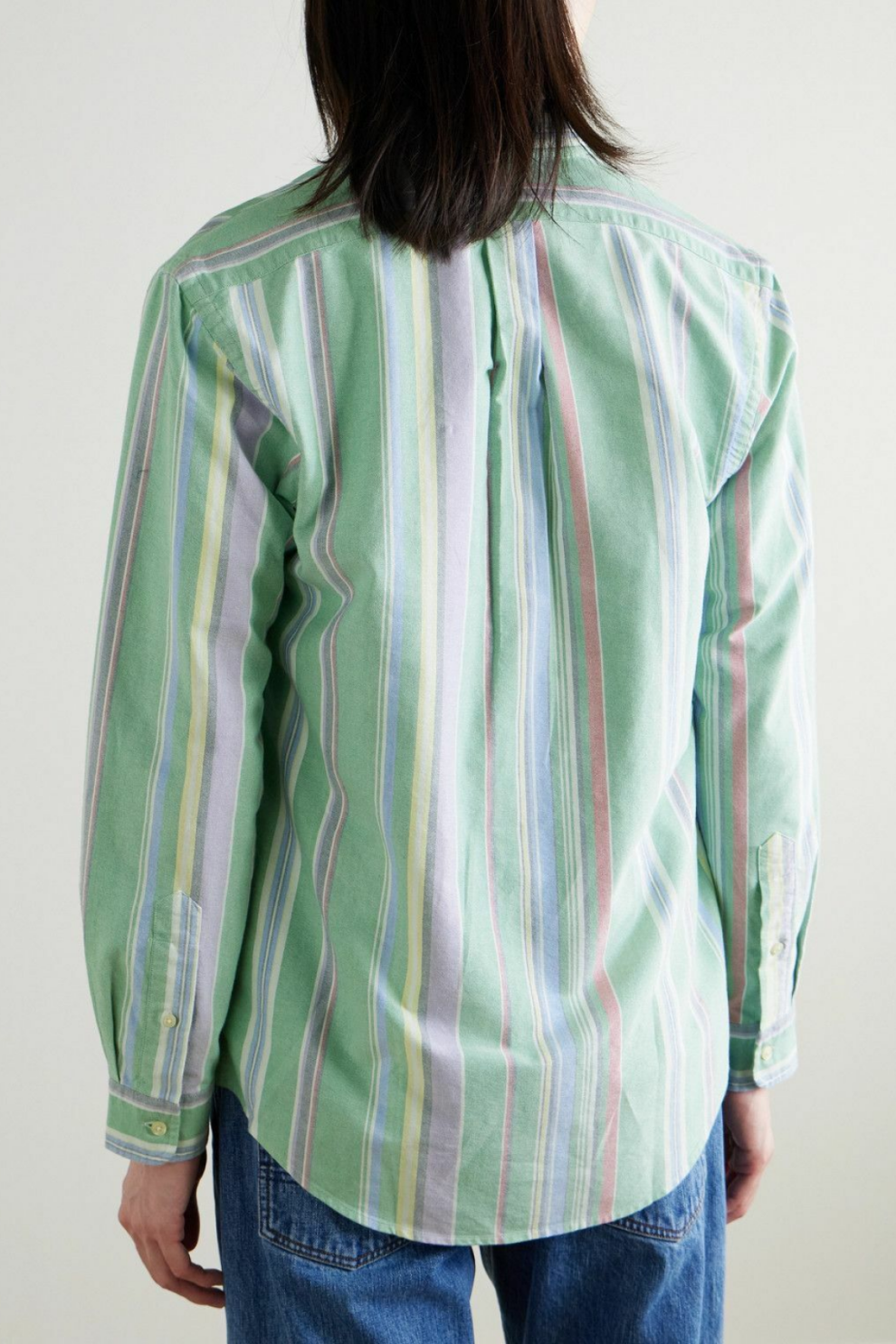 Вертикальные полоски в пастельной палитре — мягкие оттенки синего, зелёного, фиолетового и жёлтого — создают свежий, элегантный ритм и придают образу современную выразительность, не нарушая его сдержанности. Воротник button-down подчёркивает универсальный характер рубашки, позволяя носить её как в расслабленных городских образах, так и в более собранных сочетаниях.