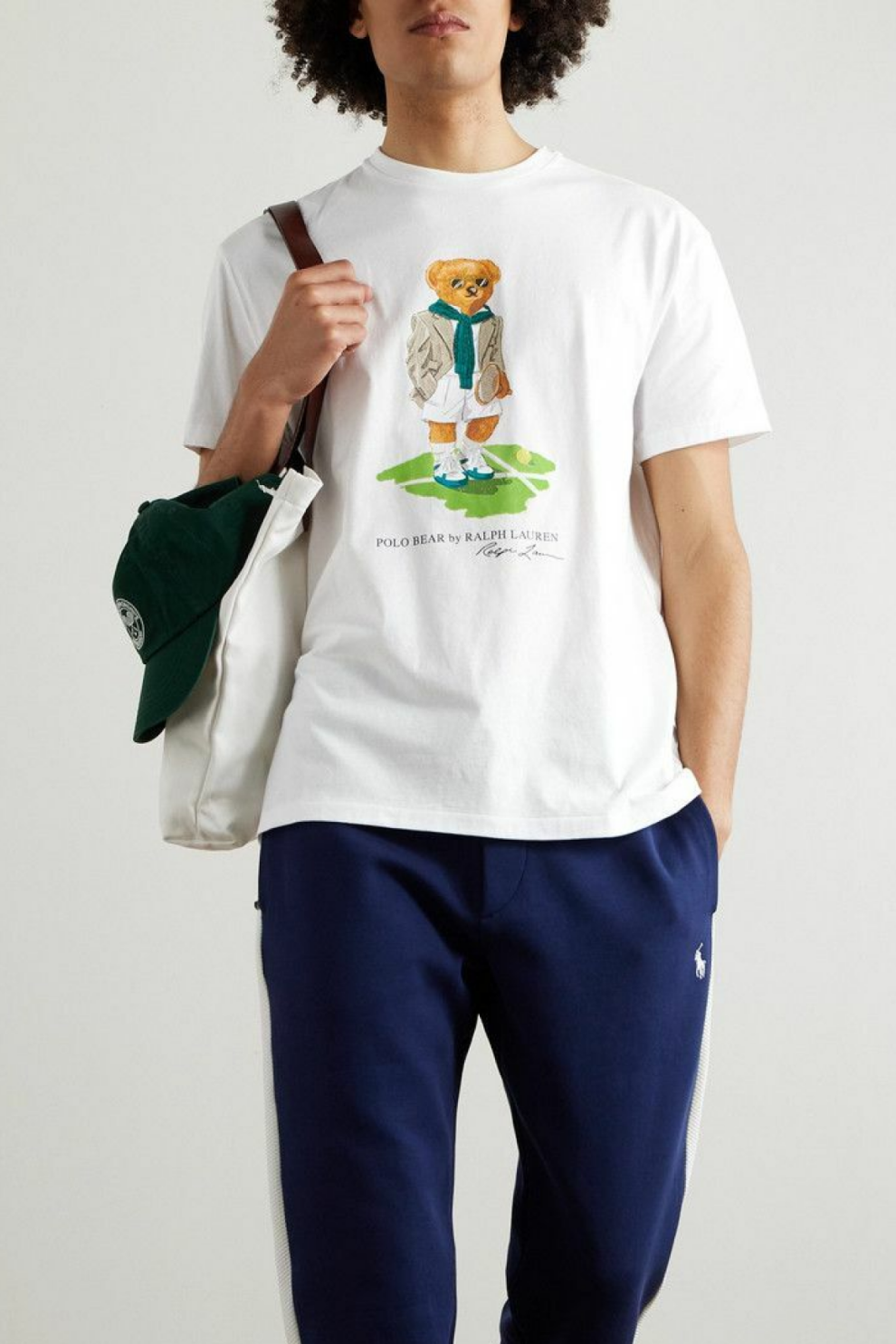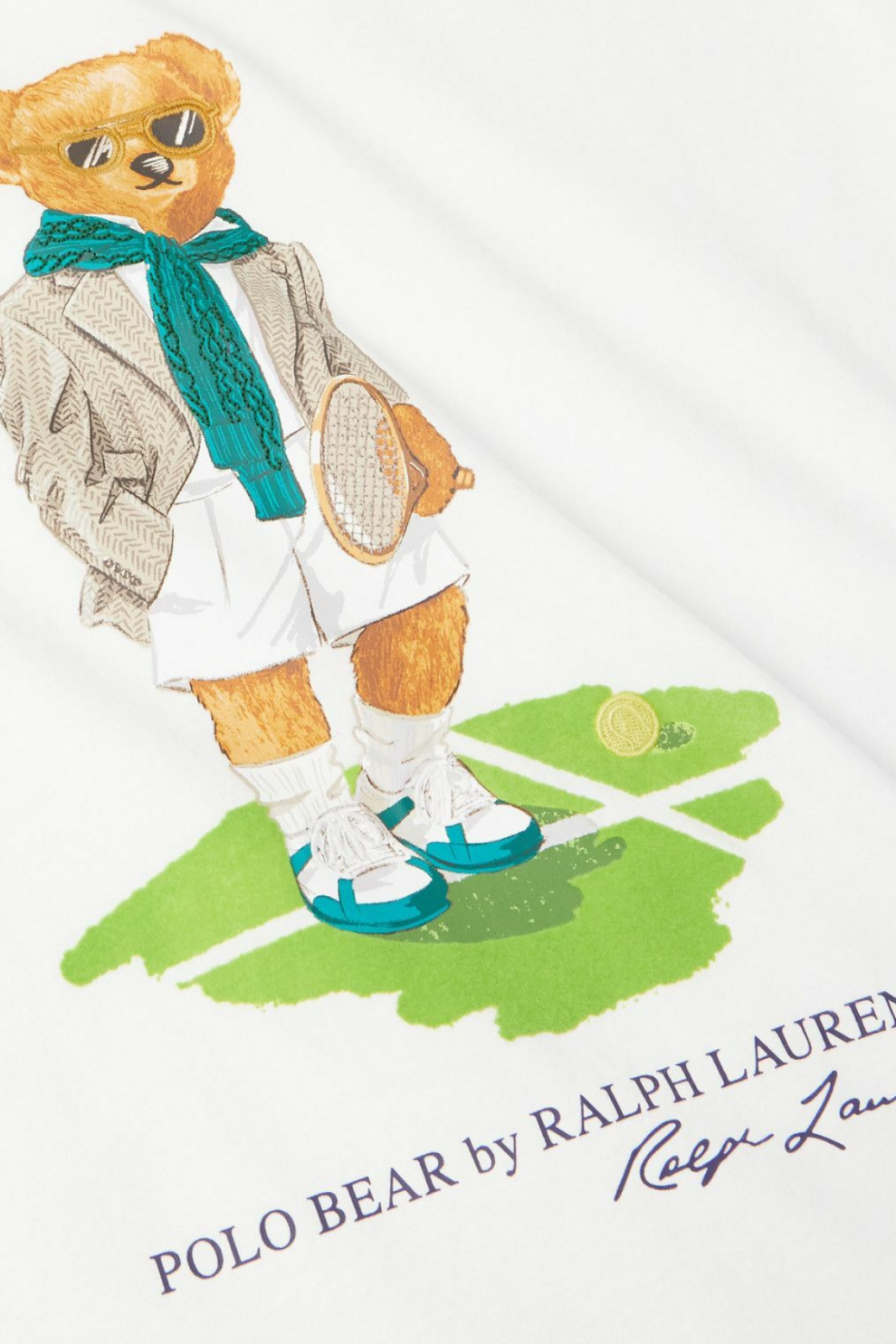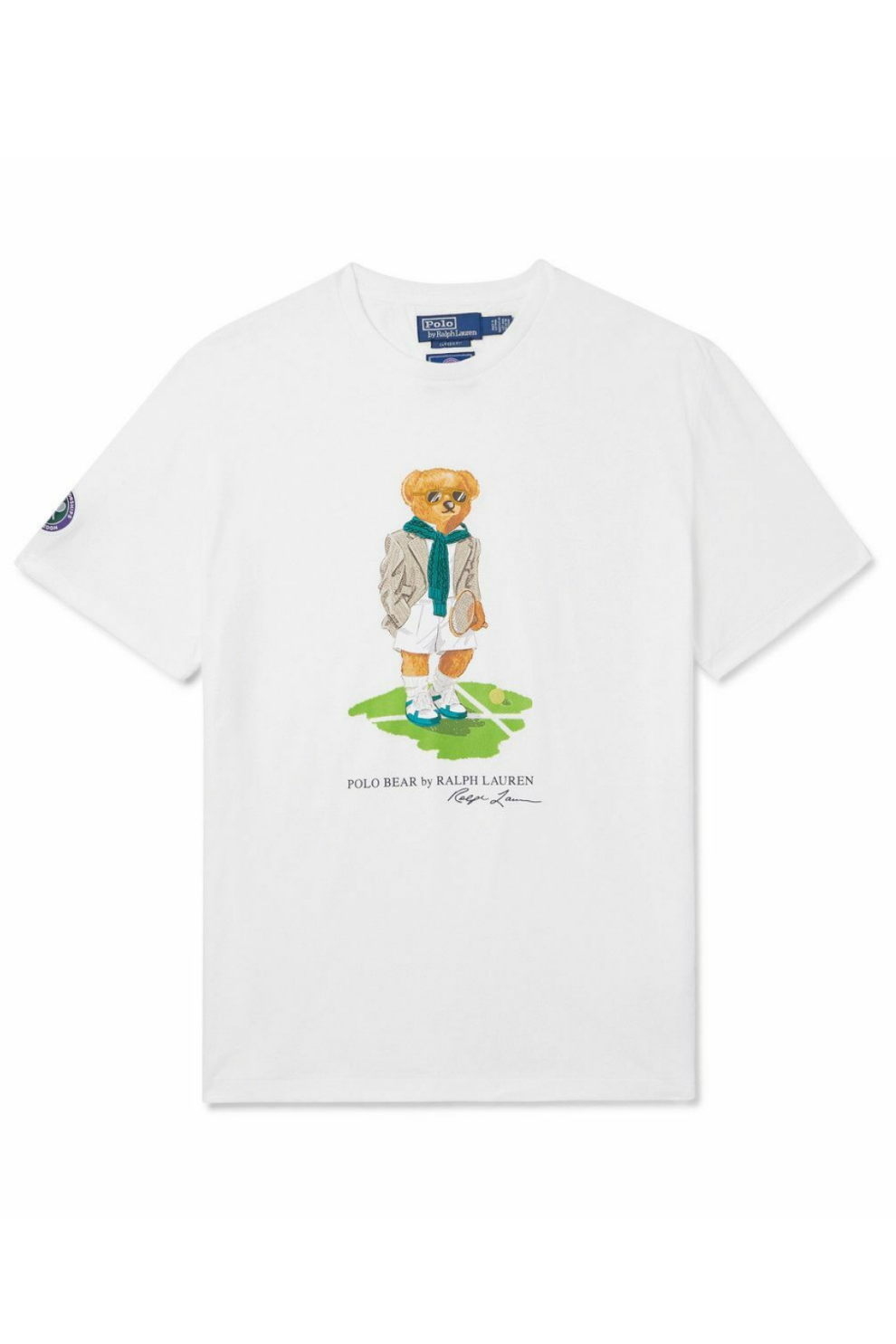 На футболке размещён знаковый медвежонок Polo Bear, одетый в тематический теннисный образ, а на рукаве апплицирован совместный логотип бренда и турнира, подчёркивая премиальный характер изделия и его коллекционную ценность.