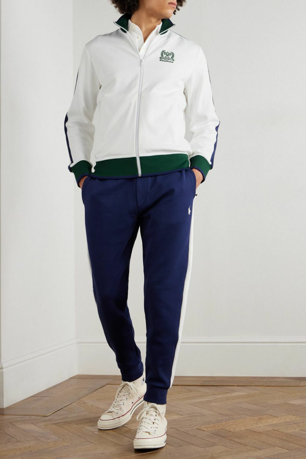 Эта трек-куртка Polo Ralph Lauren — настоящий гимн теннисной элегантности, созданная в рамках официальной капсульной коллекции бренда для Wimbledon. Вдохновлённая классическими формами теннисных курток, она сочетает чистый белый цвет с травянисто-зелёными и тёмно-синими акцентами, создавая современный спортивный шик, который легко вписывается в городской гардероб.