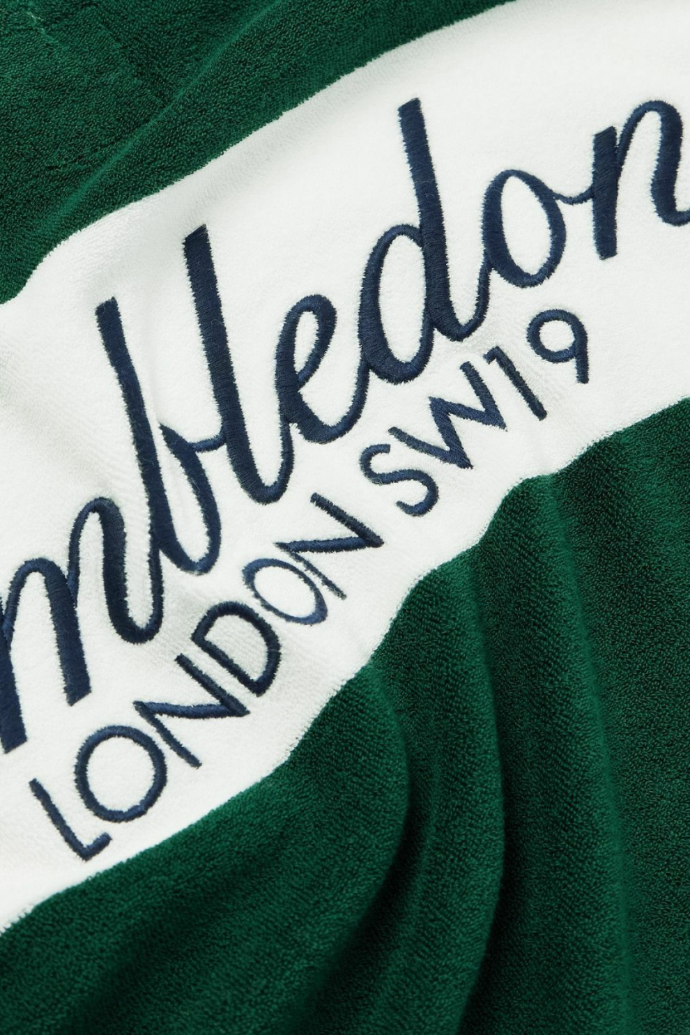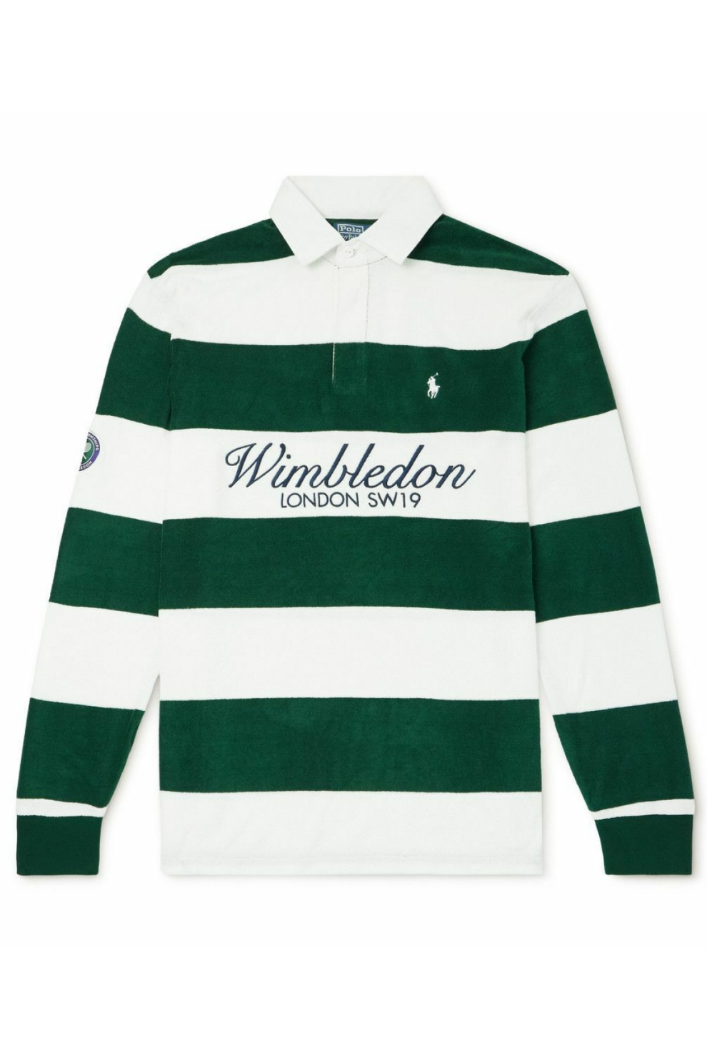 Яркие полосы белого и зелёного цвета отсылают к классическому экипировочному стилю и зелёным кортам Уимблдона, а на груди вышит иконический логотип Polo Player и обозначение турнира, подчёркивая связь бренда с престижным спортивным событием.