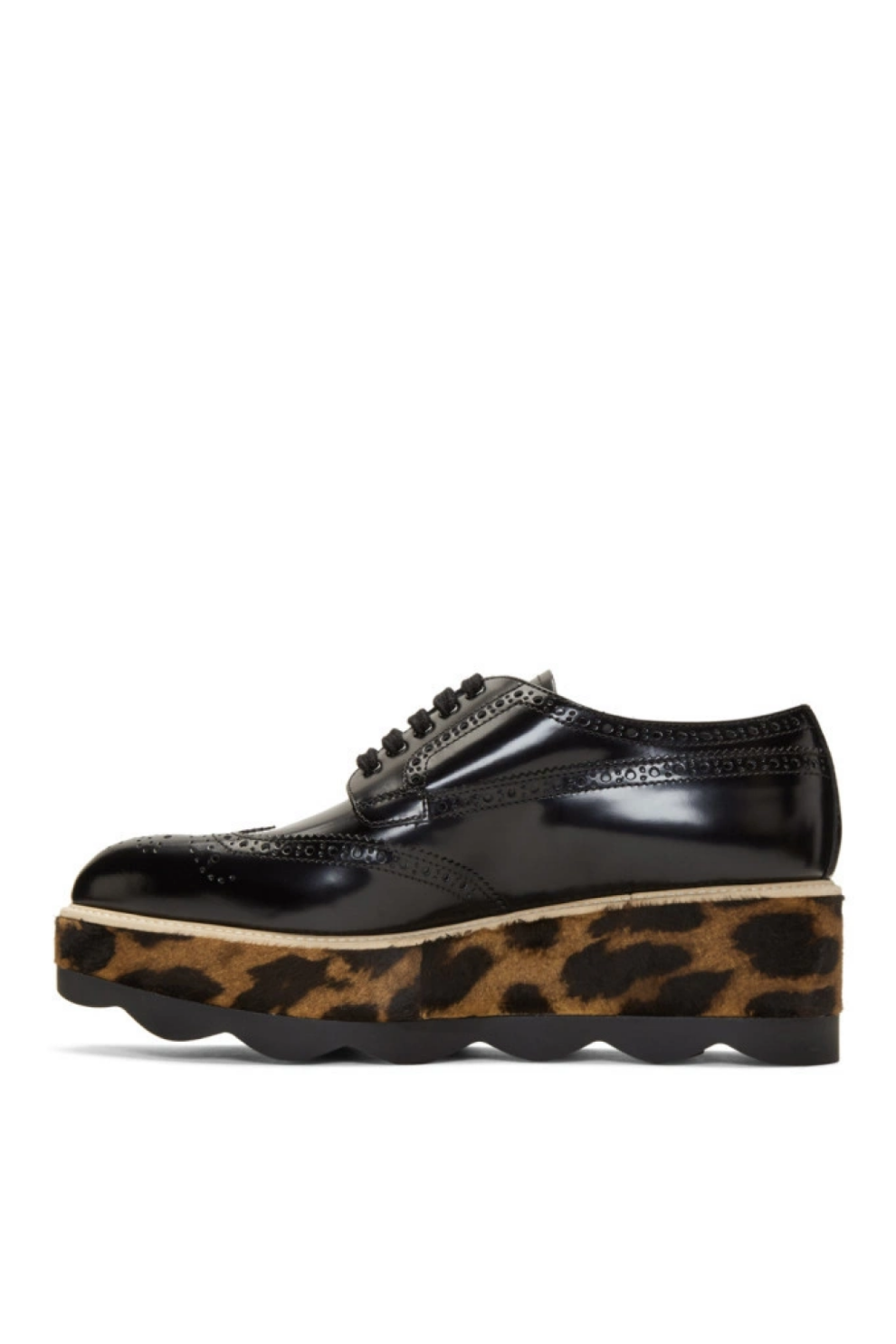 Модель выполнена из полированной чёрной кожи и украшена характерной перфорированной отделкой с зубчатым краем, подчеркивающей мастерство исполнения и внимание к деталям. Заострённый миндалевидный носок придаёт силуэту элегантность, а тональная шнуровка завершает классический образ.