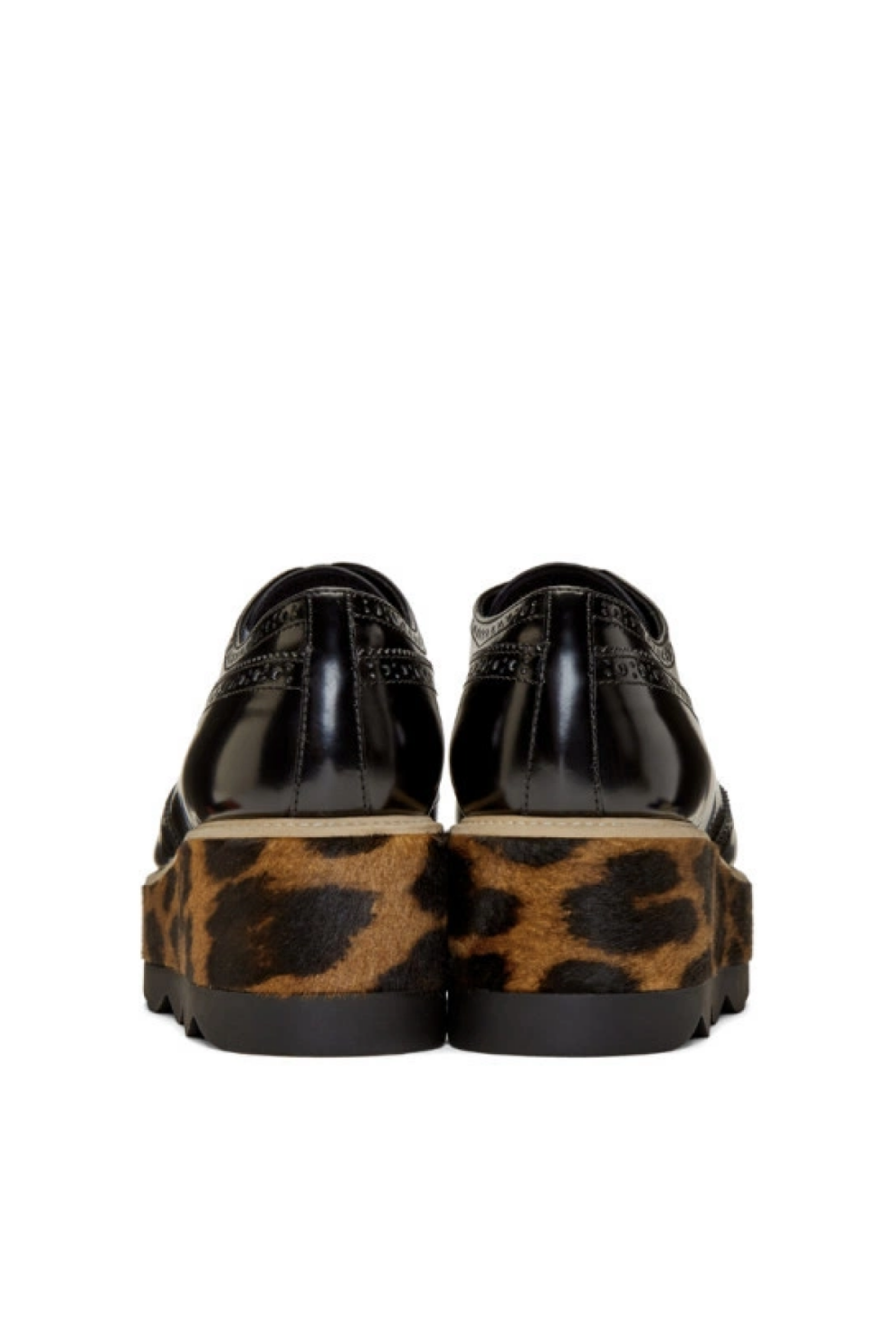 Контрастным акцентом выступает массивная рифлёная платформа из лёгкой пенорезины EVA, покрытая телячьей шерстью с леопардовым принтом в коричневых и бежевых тонах. Такая подошва обеспечивает амортизацию и комфорт при ходьбе, одновременно добавляя модели современный архитектурный характер.